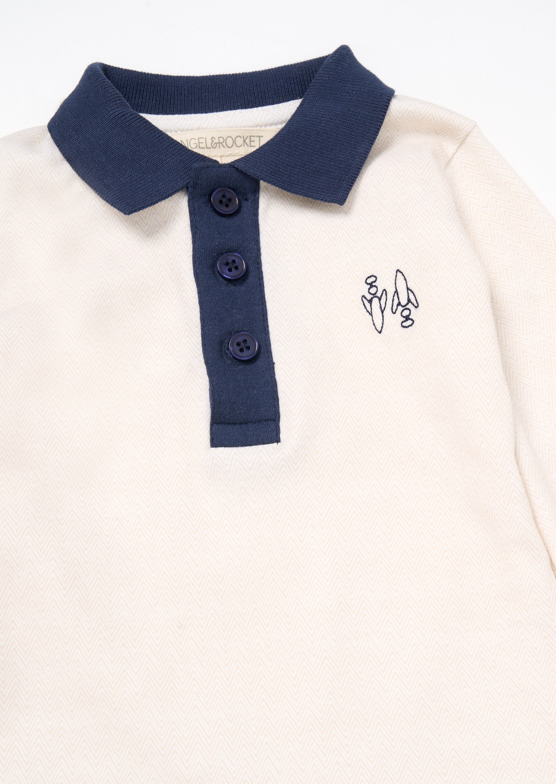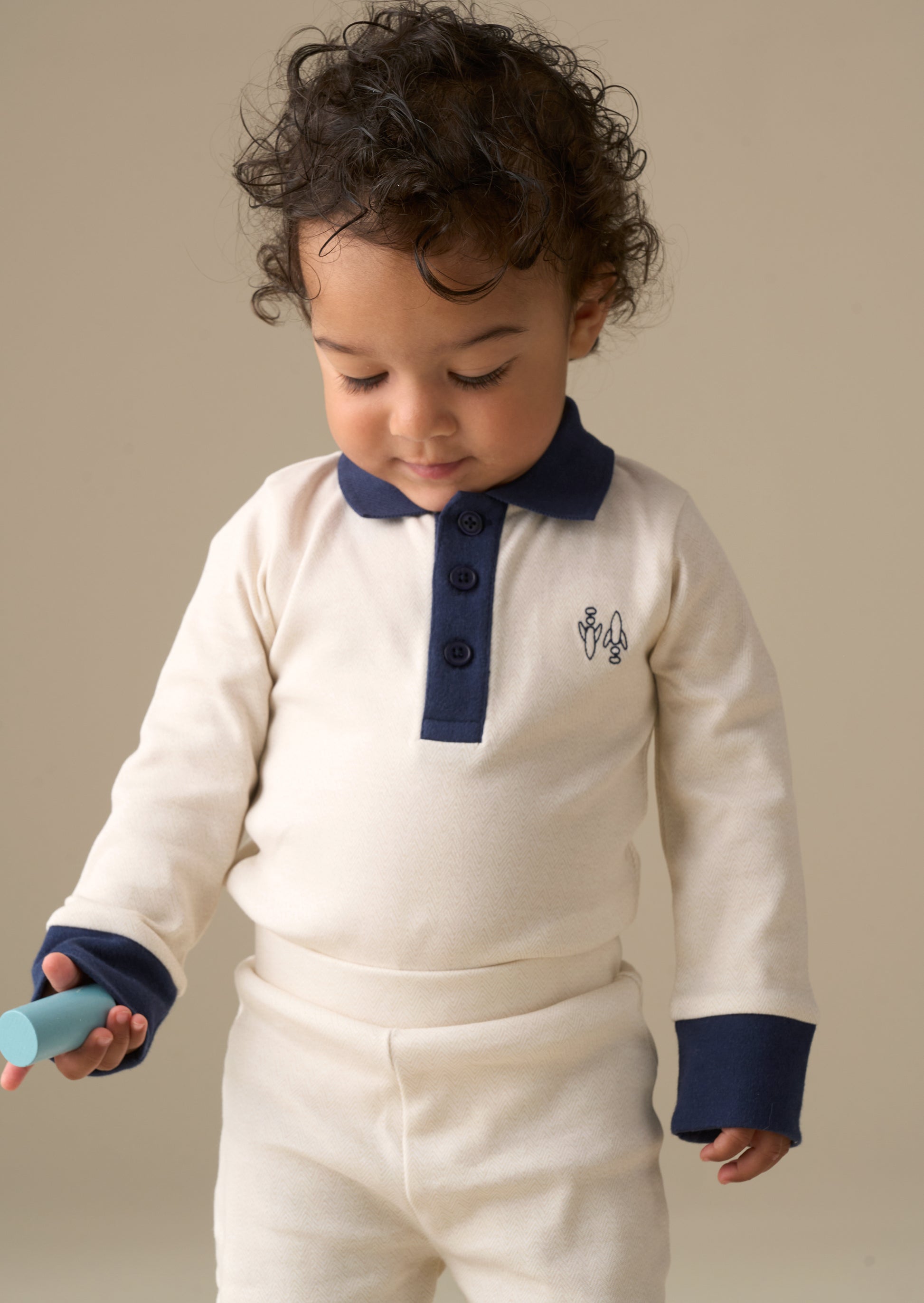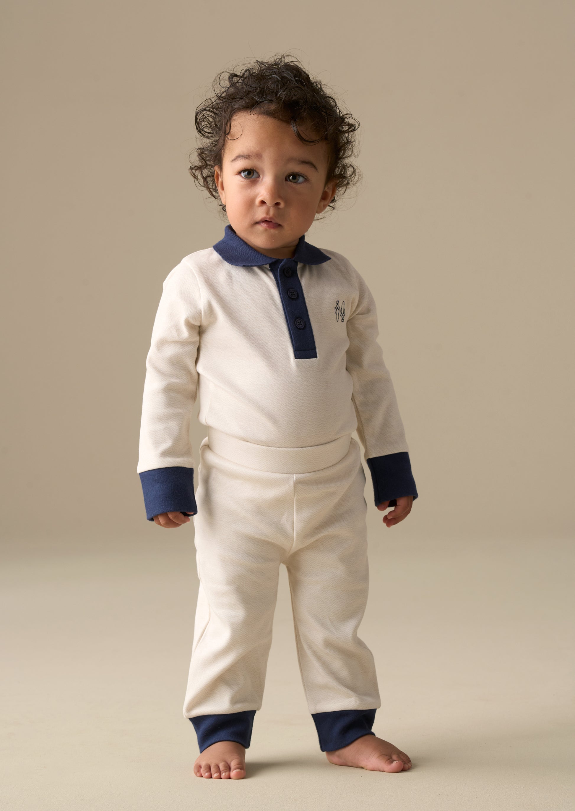 Snuggle up in style! Our cream herringbone bodysuit and legging set is as cozy as a cuddle and twice as cute. With smart dark navy collar and cuff details, this soft jersey outfit is perfect for any occasion!