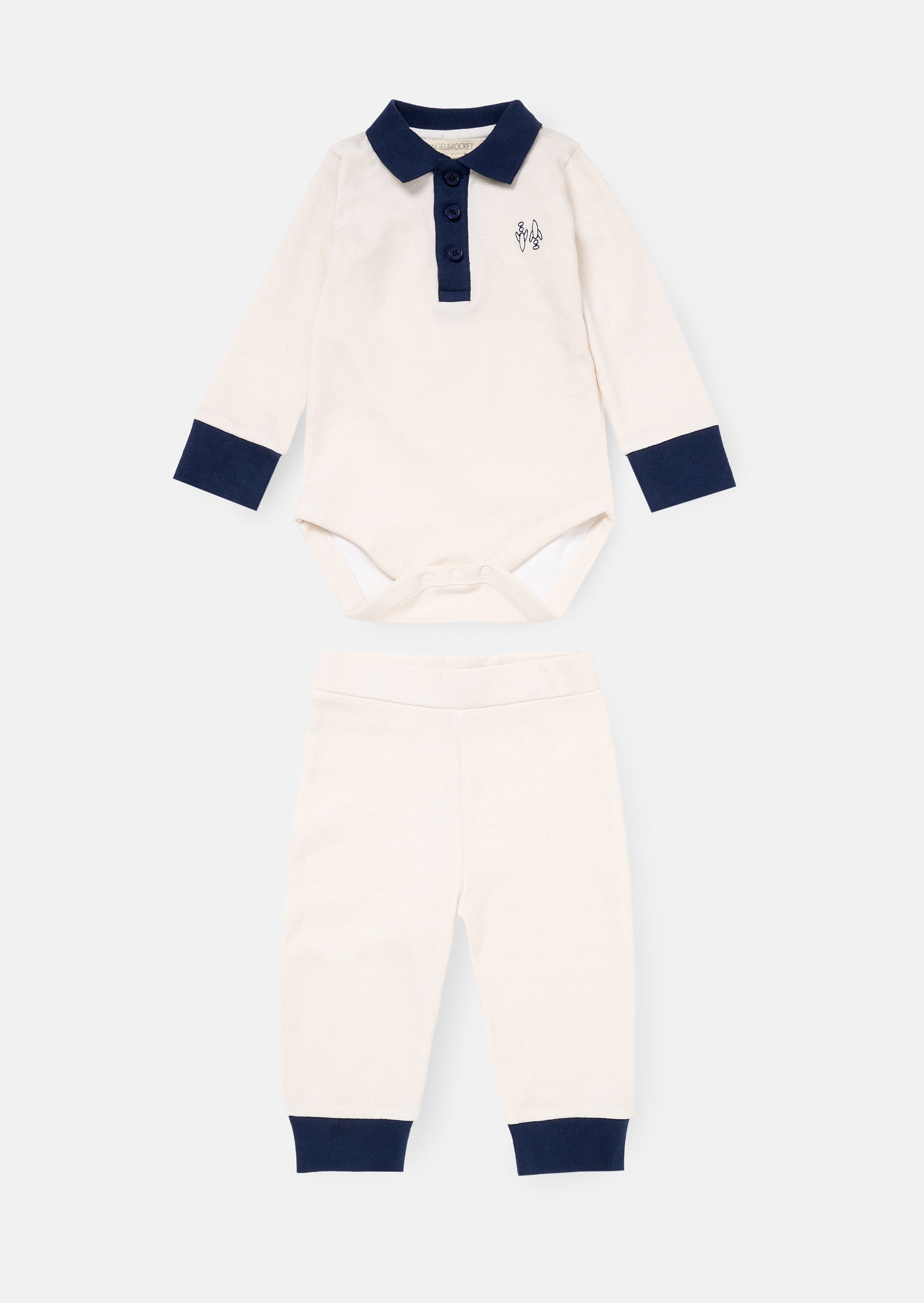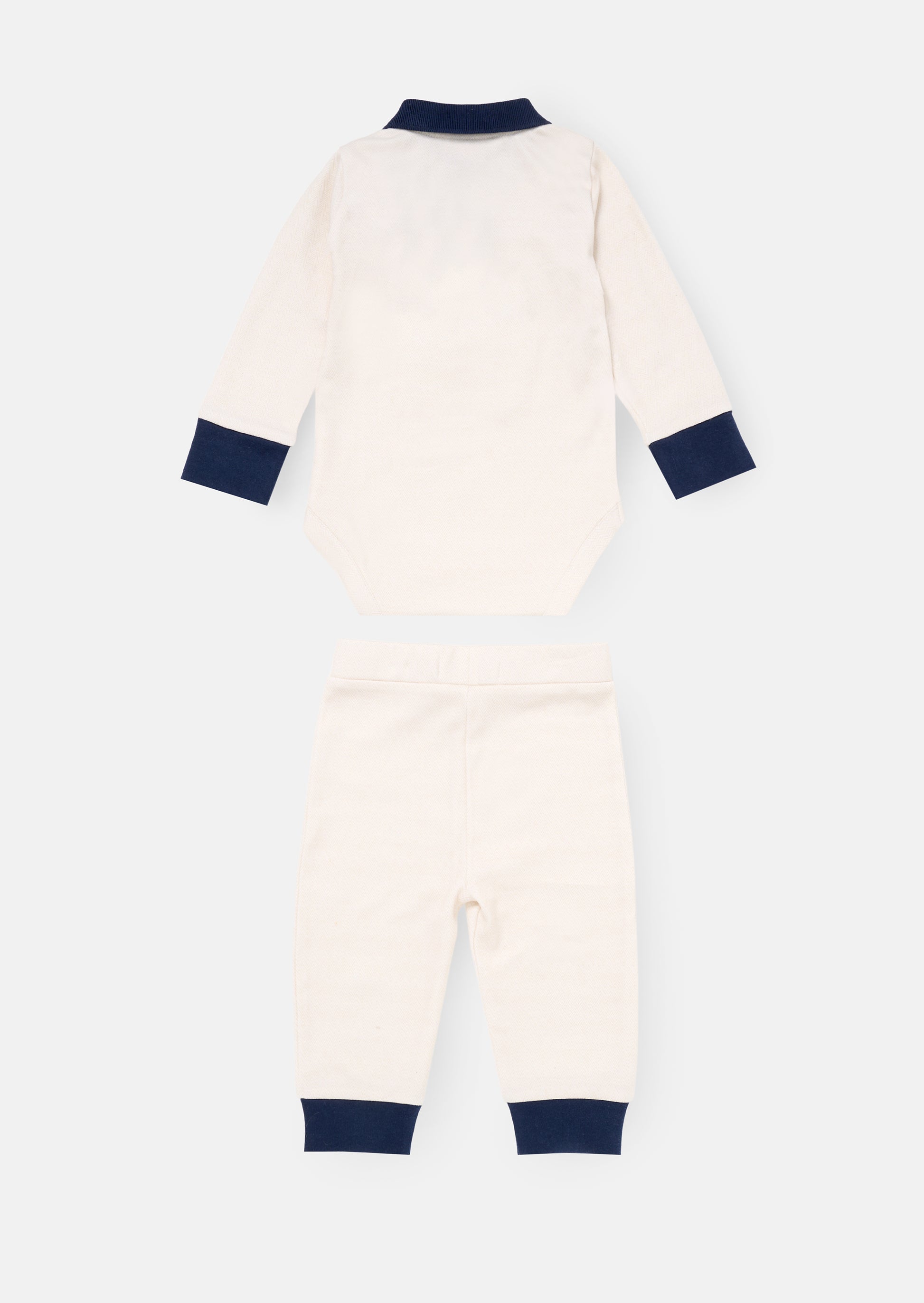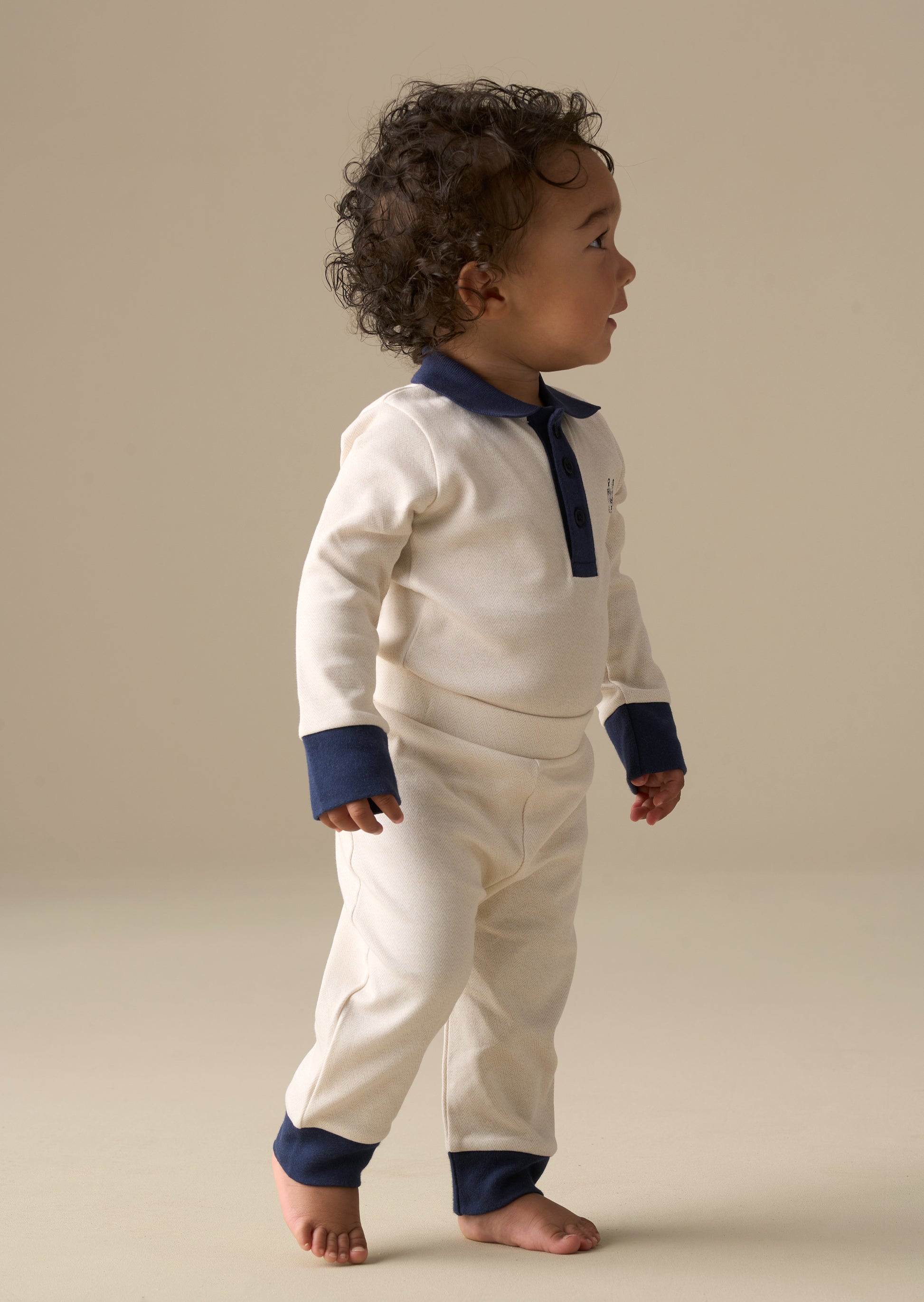Snuggle up in style! Our cream herringbone bodysuit and legging set is as cozy as a cuddle and twice as cute. With smart dark navy collar and cuff details, this soft jersey outfit is perfect for any occasion!