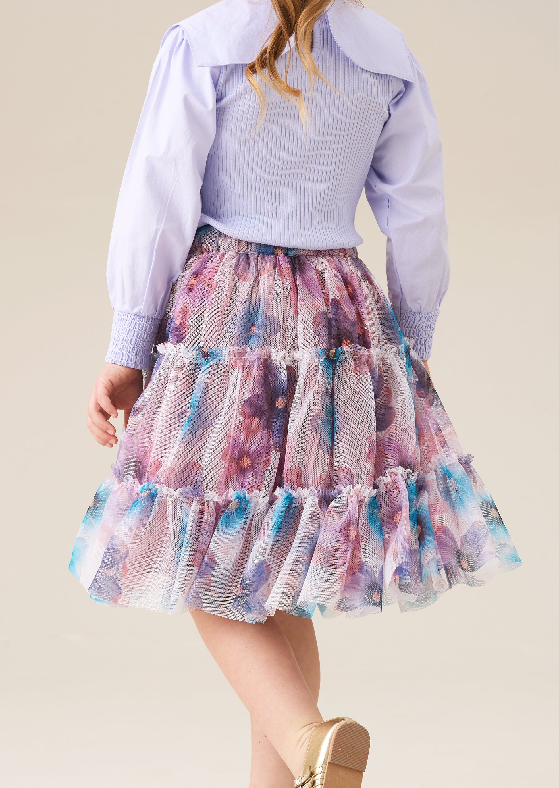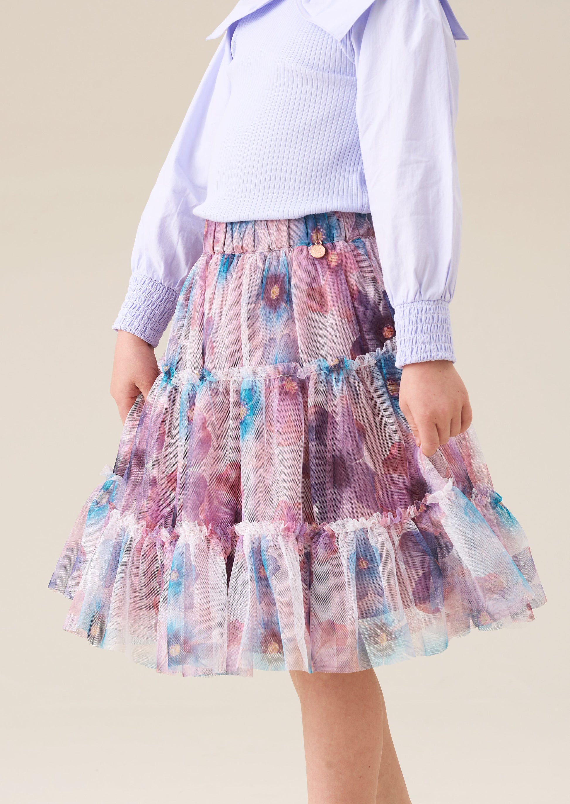 We've found you the perfect skirt! Our bestselling skirt is back with a stunning new season upgrade. Featuring layers of the softest mesh scattered with oversized blooms in delicate mauves and lilacs, it's cut into a stunning longer-line silhouette that's brimming with volume and tiers.