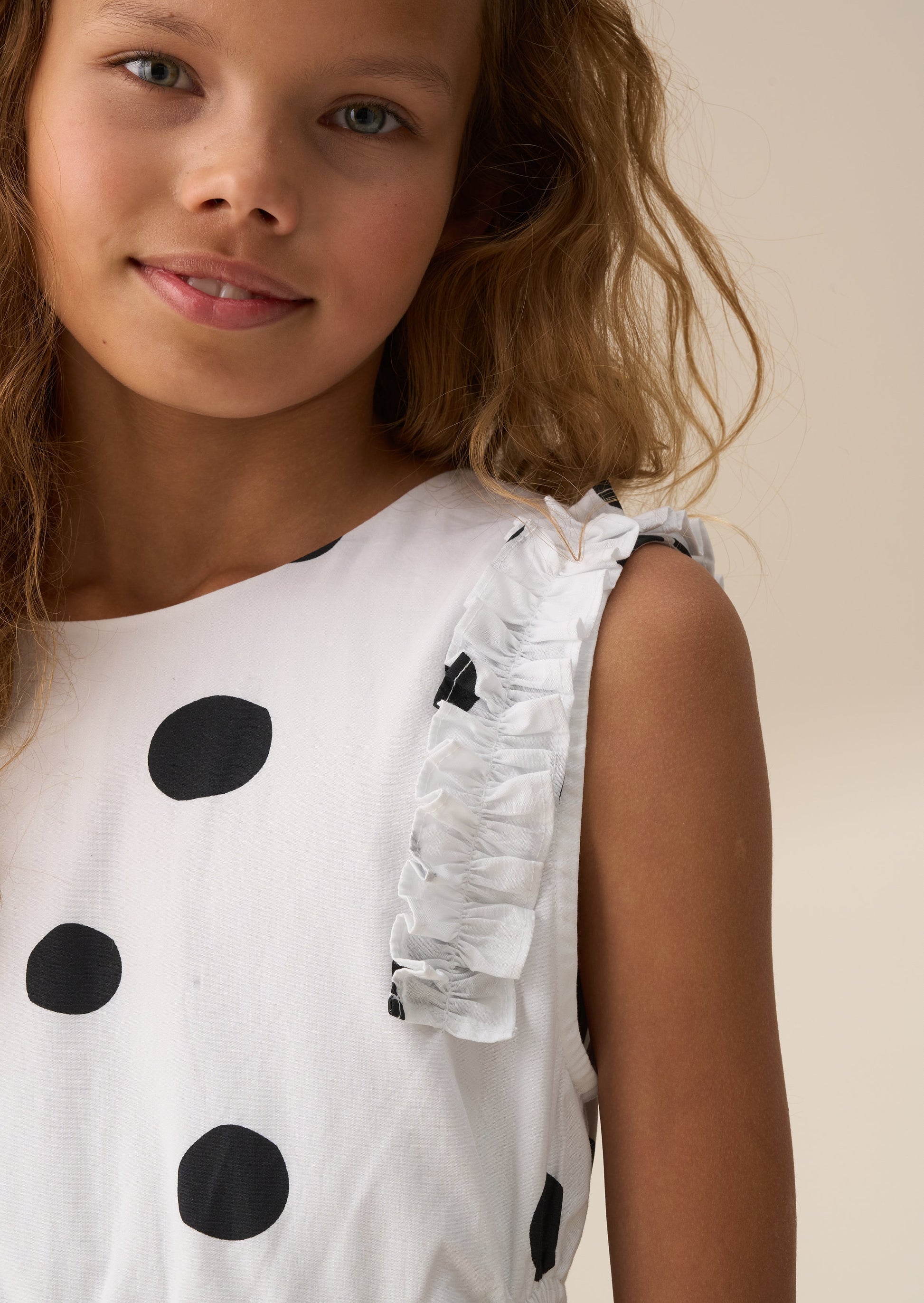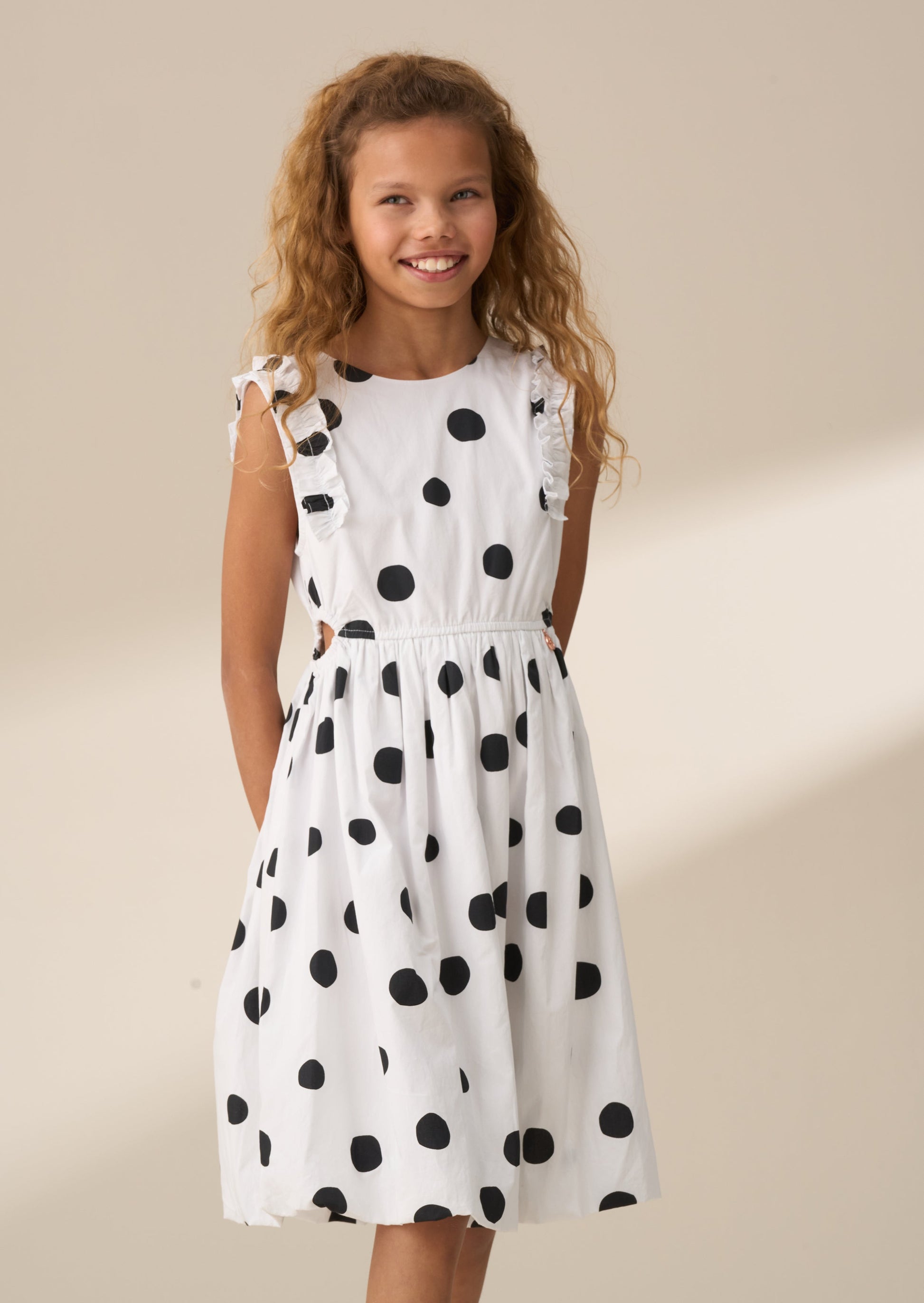 We've spotted some serious style! This polka dot puffball design on soft cotton features a playful bubble hem skirt and pretty frill detail at the shoulders. Finished off with a stunning cut-out waist, it's a showstopper!
