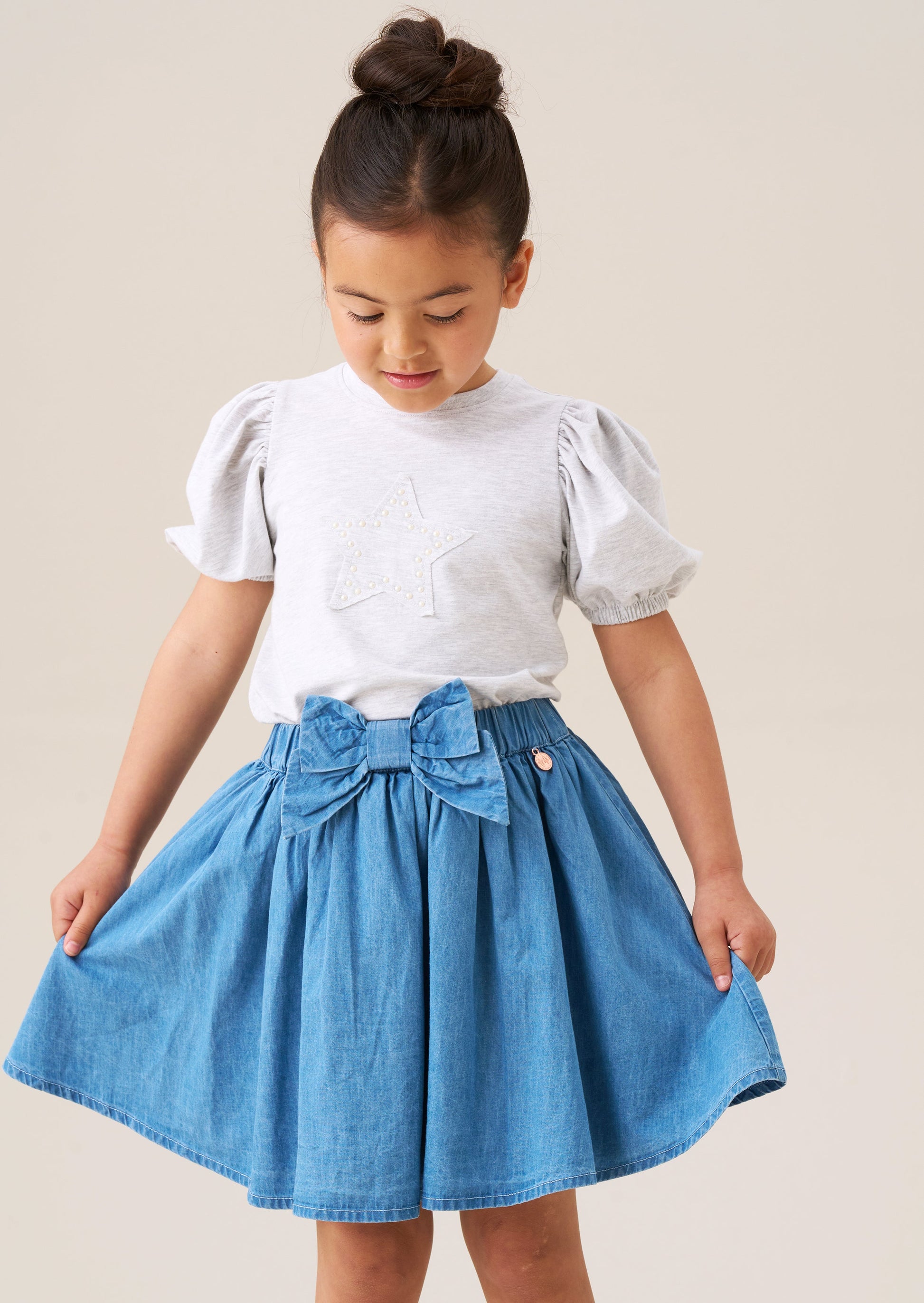 Achieve maximum twirl factor in this gorgeous soft cotton denim skirt! Multi layers of soft chambray and mesh ensure the skirt is super full, while the stretchy waist grows with her for lasting comfort. This style is so versatile and a must have for your new season wardrobe!