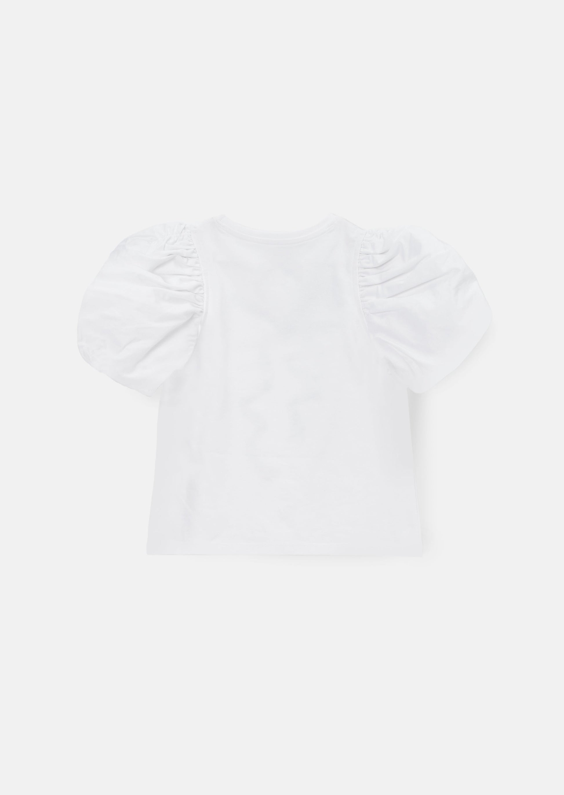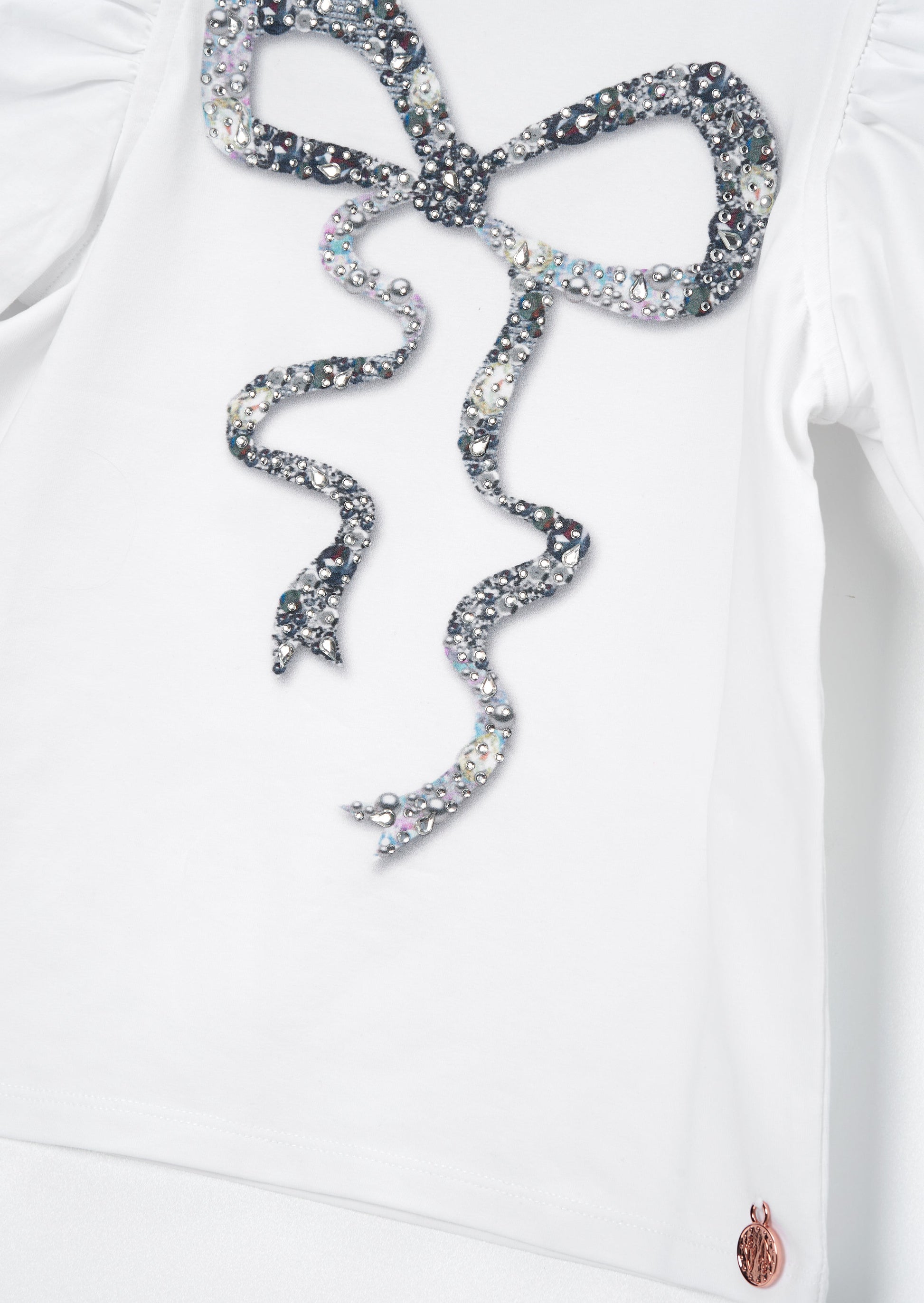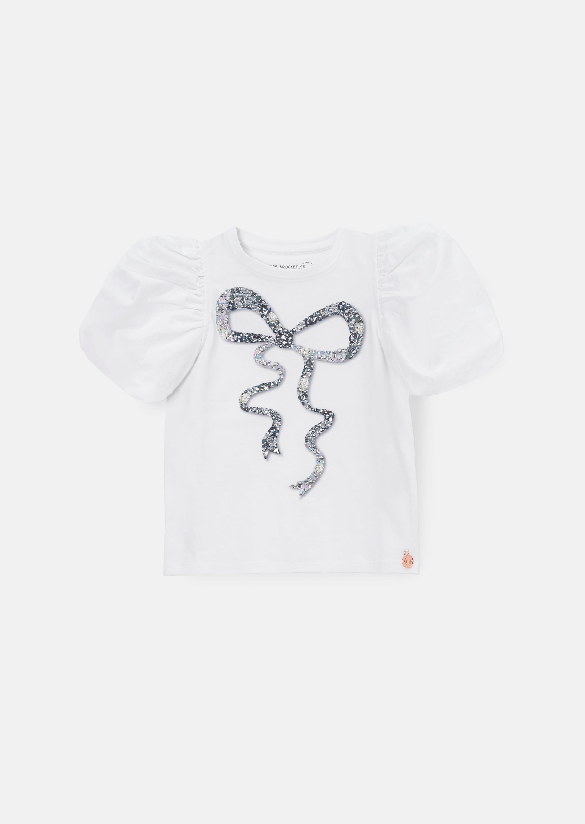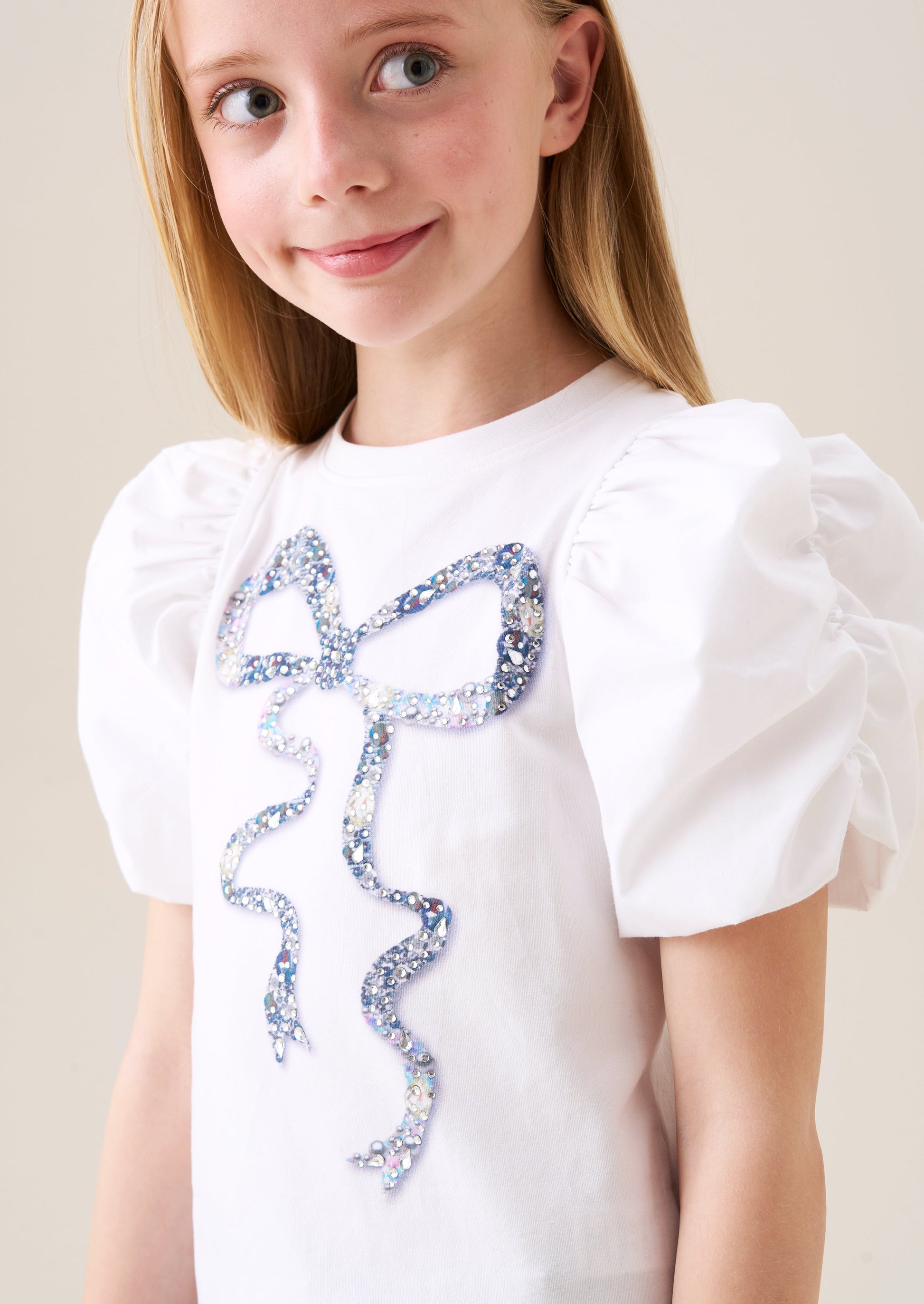 This top is un-bow-lievable. A crisp white cotton jersey body featuring an exaggerated woven puff sleeve with a stunning diamante bow motif. It will take you through the seasons in style.
