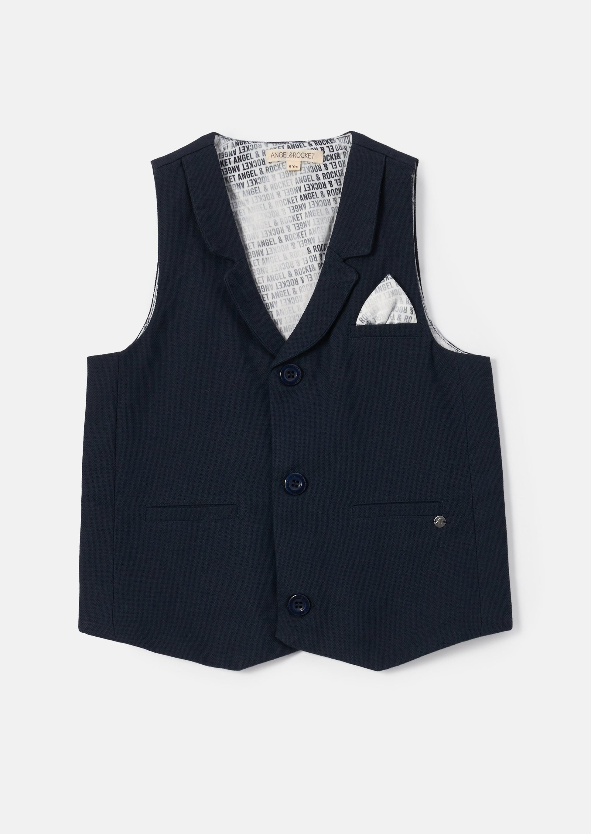 Get your dapper young man ready for any occasion with our smart textured waistcoat! In classic versatile navy, the textured finish and branded pocket square adds a touch of uniqueness. Wear with a crisp white shirt and pair with the matching shorts or trousers for a sophisticated combo.