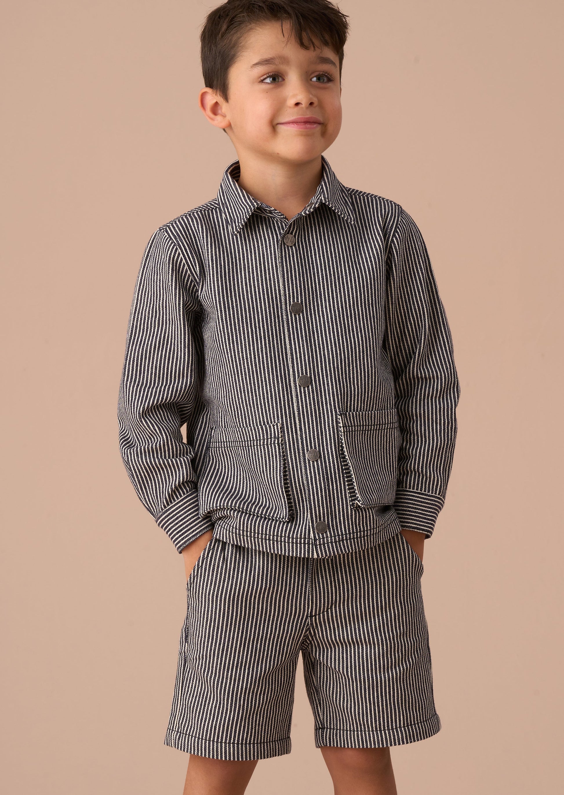 Earn your stripes! This casual navy stripe jacket is a summer wardrobe essential. Crafted from textured stripe fabric for cool summer vibes, pair with the matching shorts for outfit perfection. Also available in little brother sizes.
