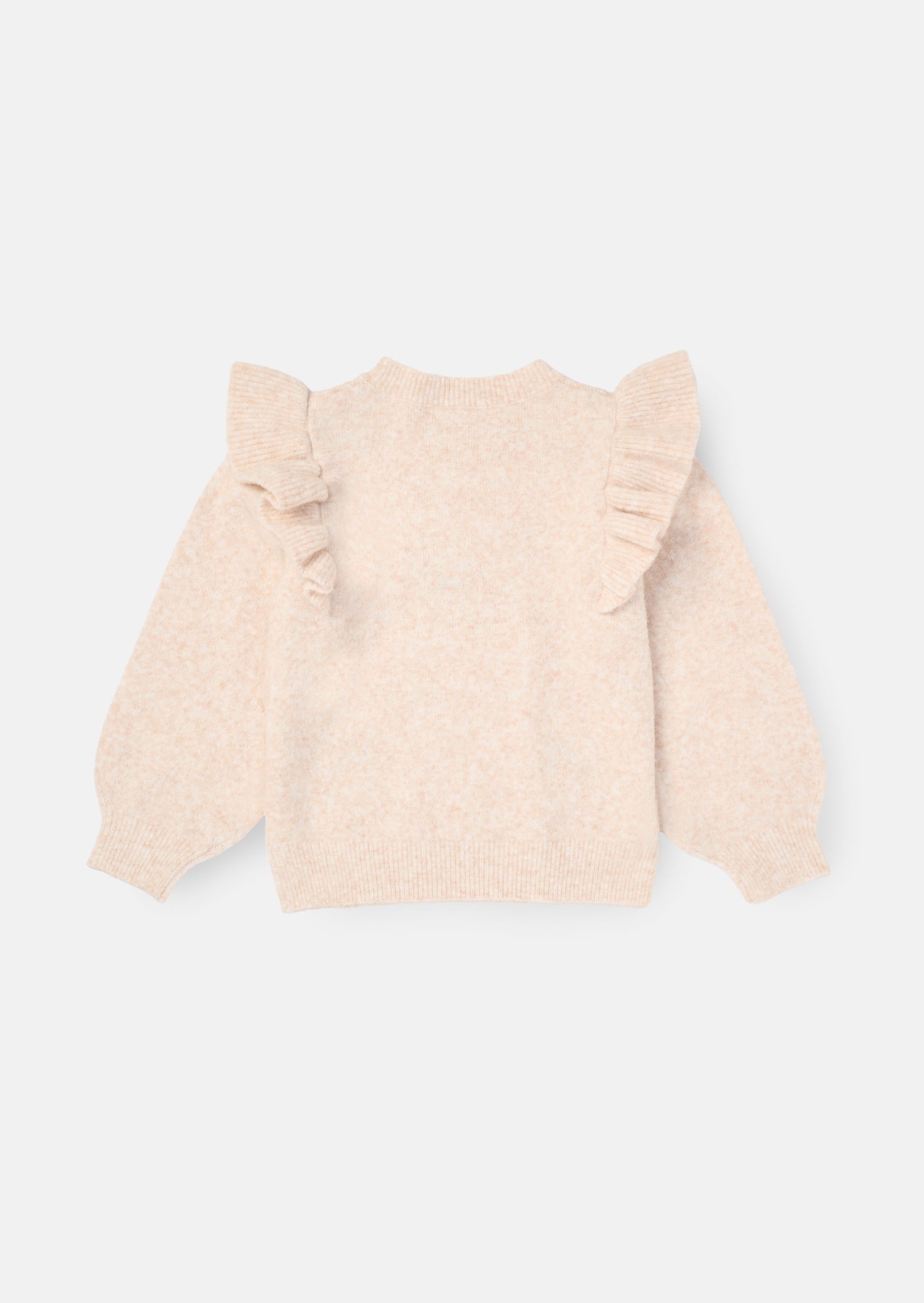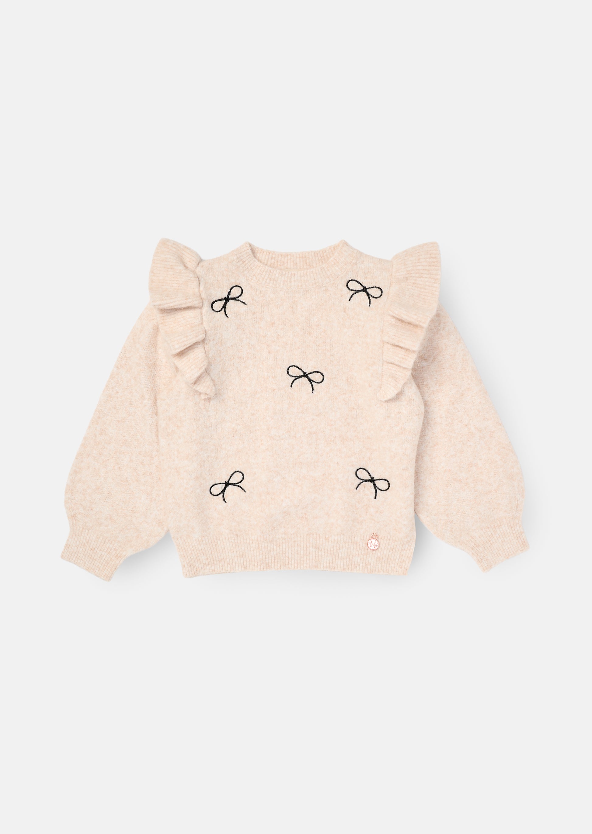 Bow-verload! Our soft cream knit is full of charm, with embroidered bows scattered across the front and playful ruffle shoulders for extra fun. Perfect for dressing up cosy days or adding extra style to everyday looks!