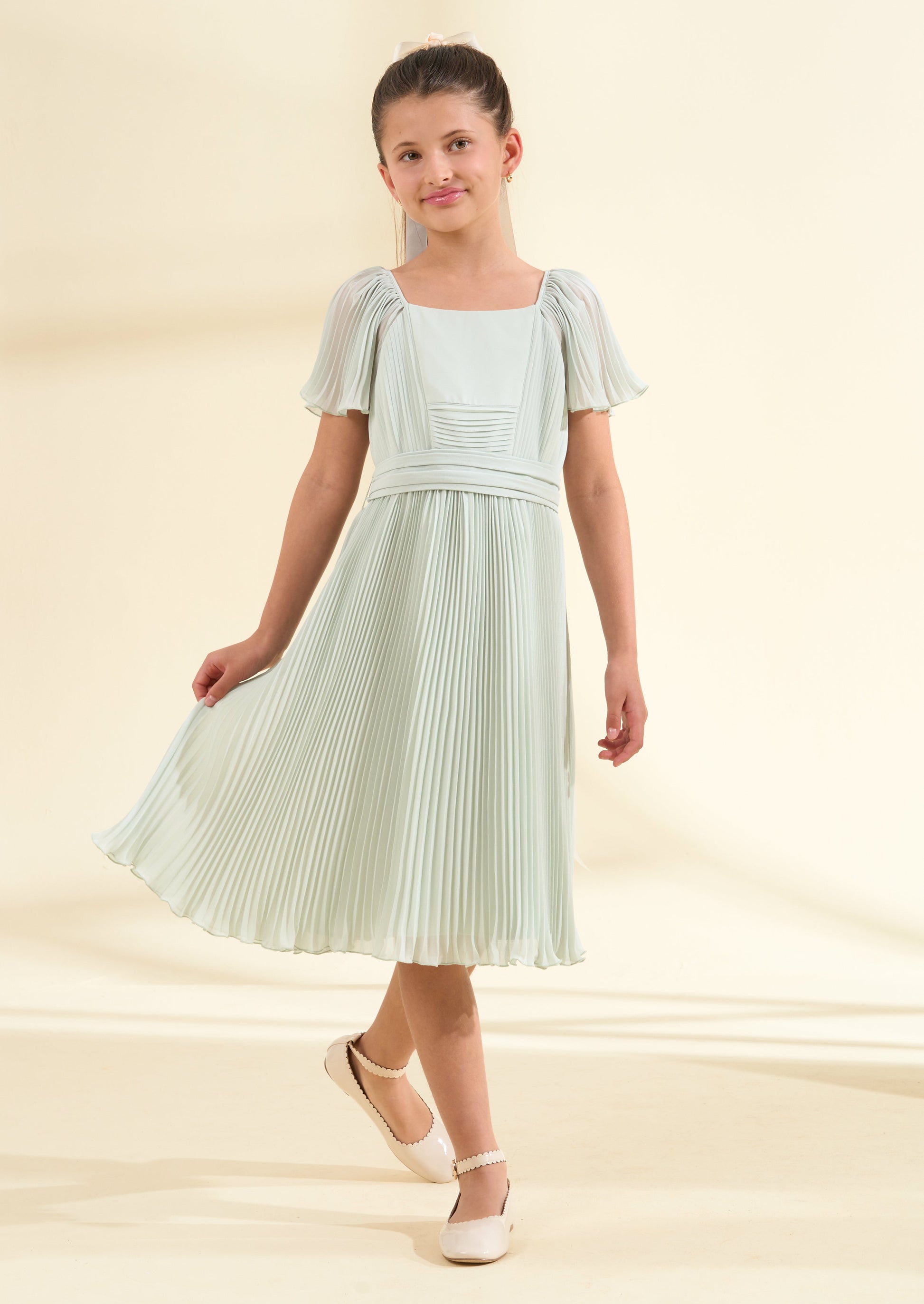 Our exquisite pleated georgette dress is classic elegance. With pleated bodice detail, fluted angel sleeve and a floaty skirt which finished below the knee. Simply divine and available in sizes 2yrs - 16yrs.