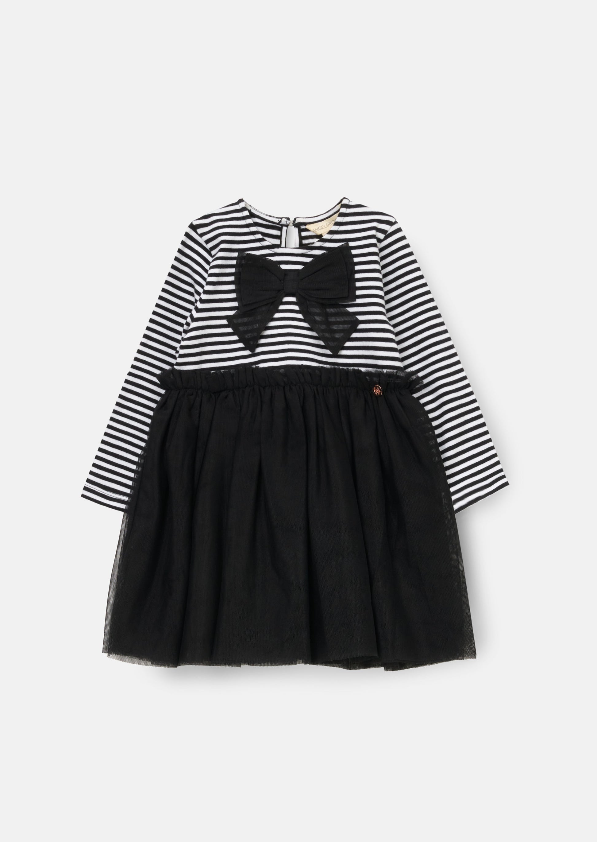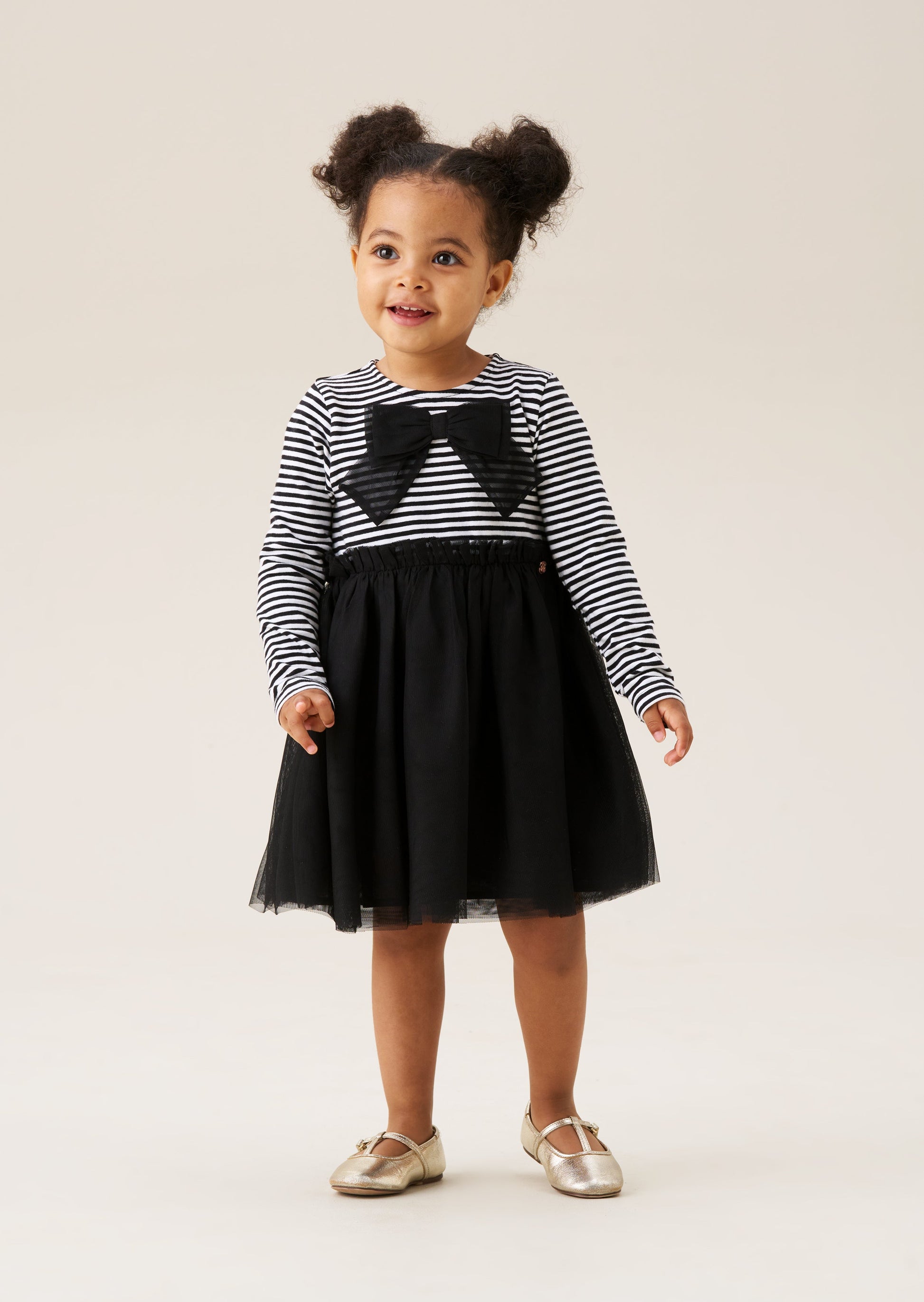 Channel Parisian vibes in our fabulous dress for the tiniest of trendsetters! Super soft stripe jersey bodice with a showstopping bow and a sumptuous skirt crafted from layers of soft mesh. Available in big sister sizes too!
