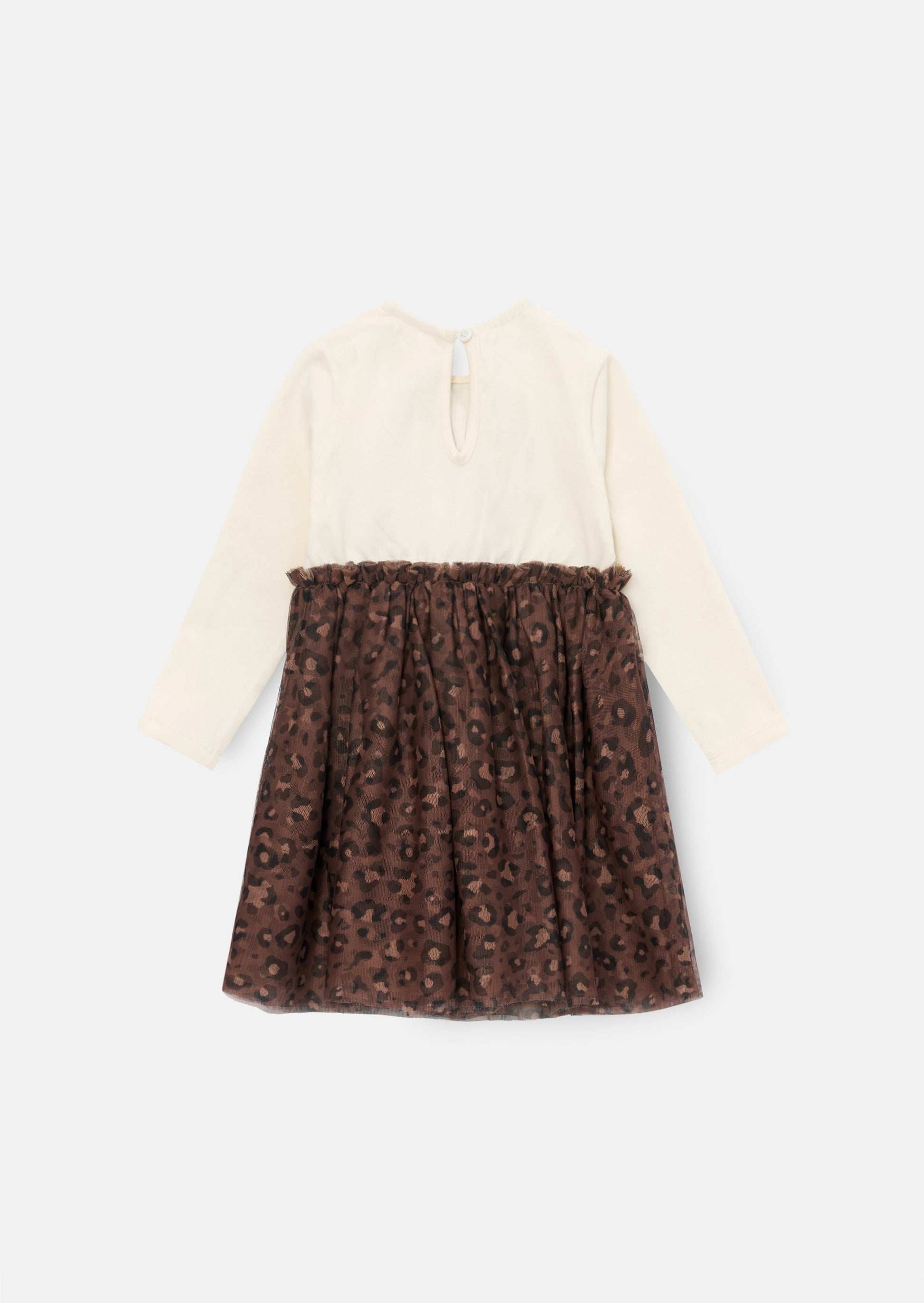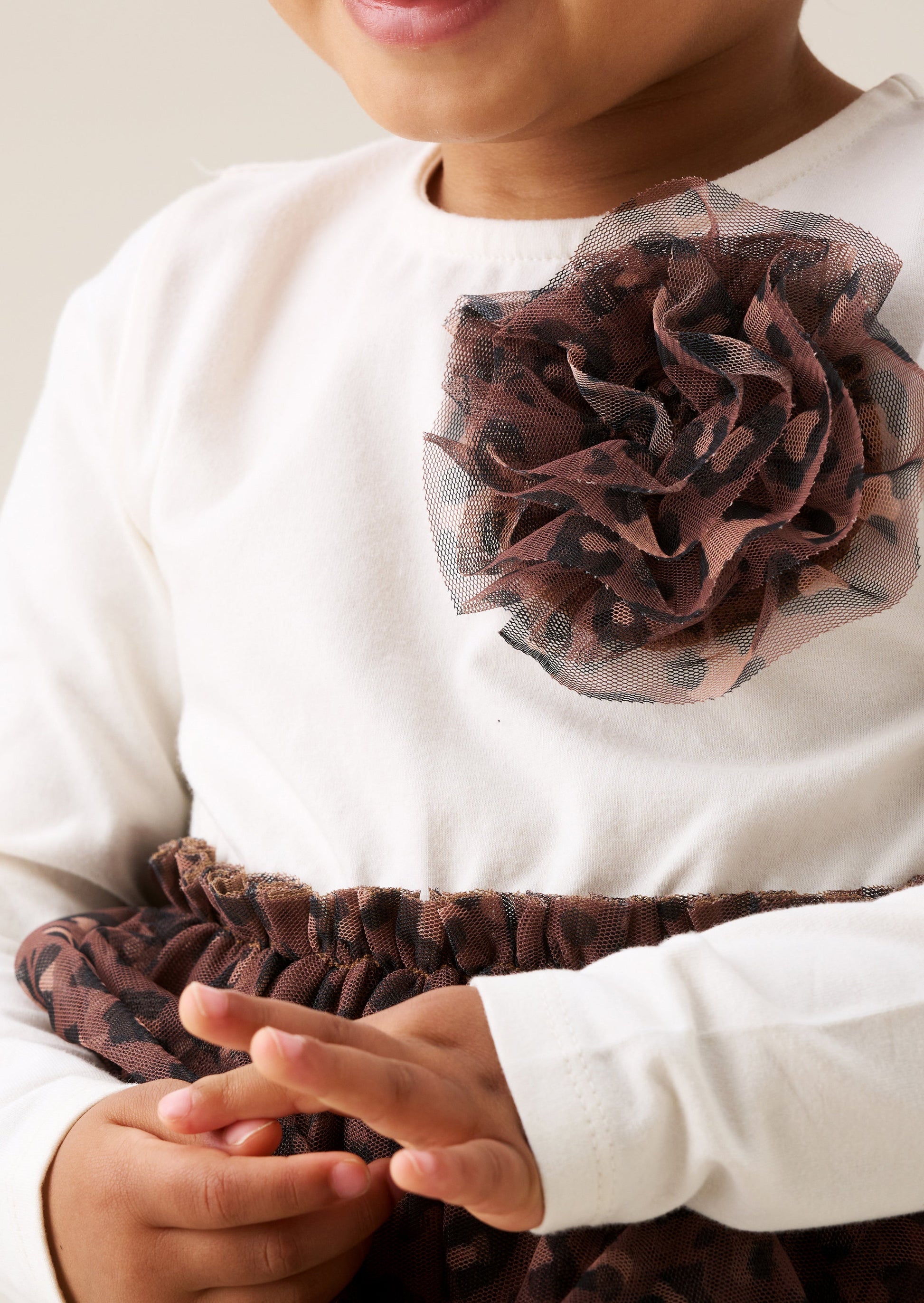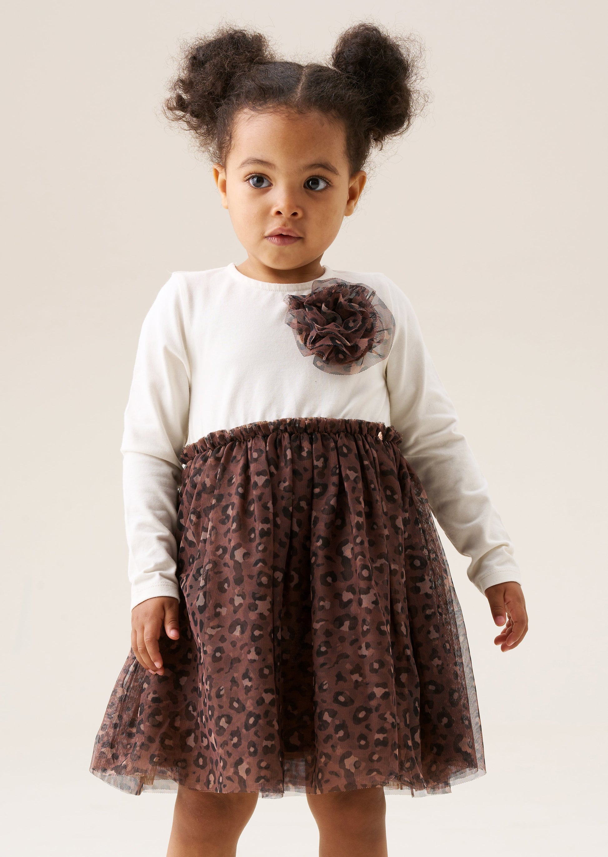 We're wild about this fabulous dress for mini fashionistas! With a super soft striped jersey bodice and a showstopping corsage, it's finished with a sumptuous skirt made from layers of soft animal print mesh. Check out the big sister version for a fabulous matching look!