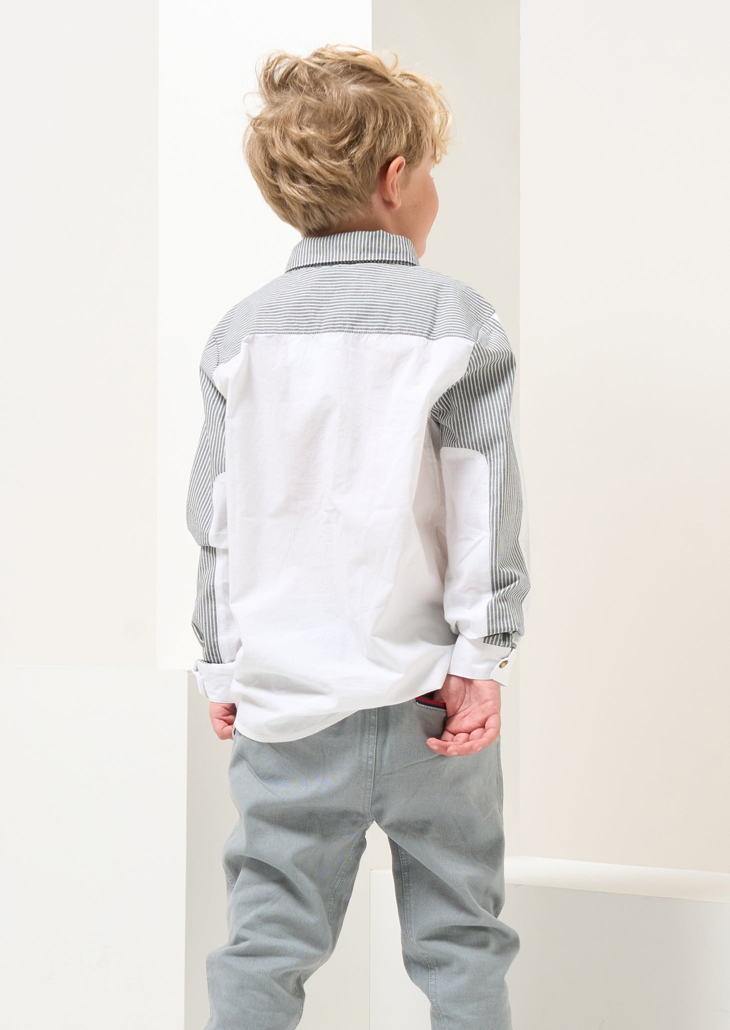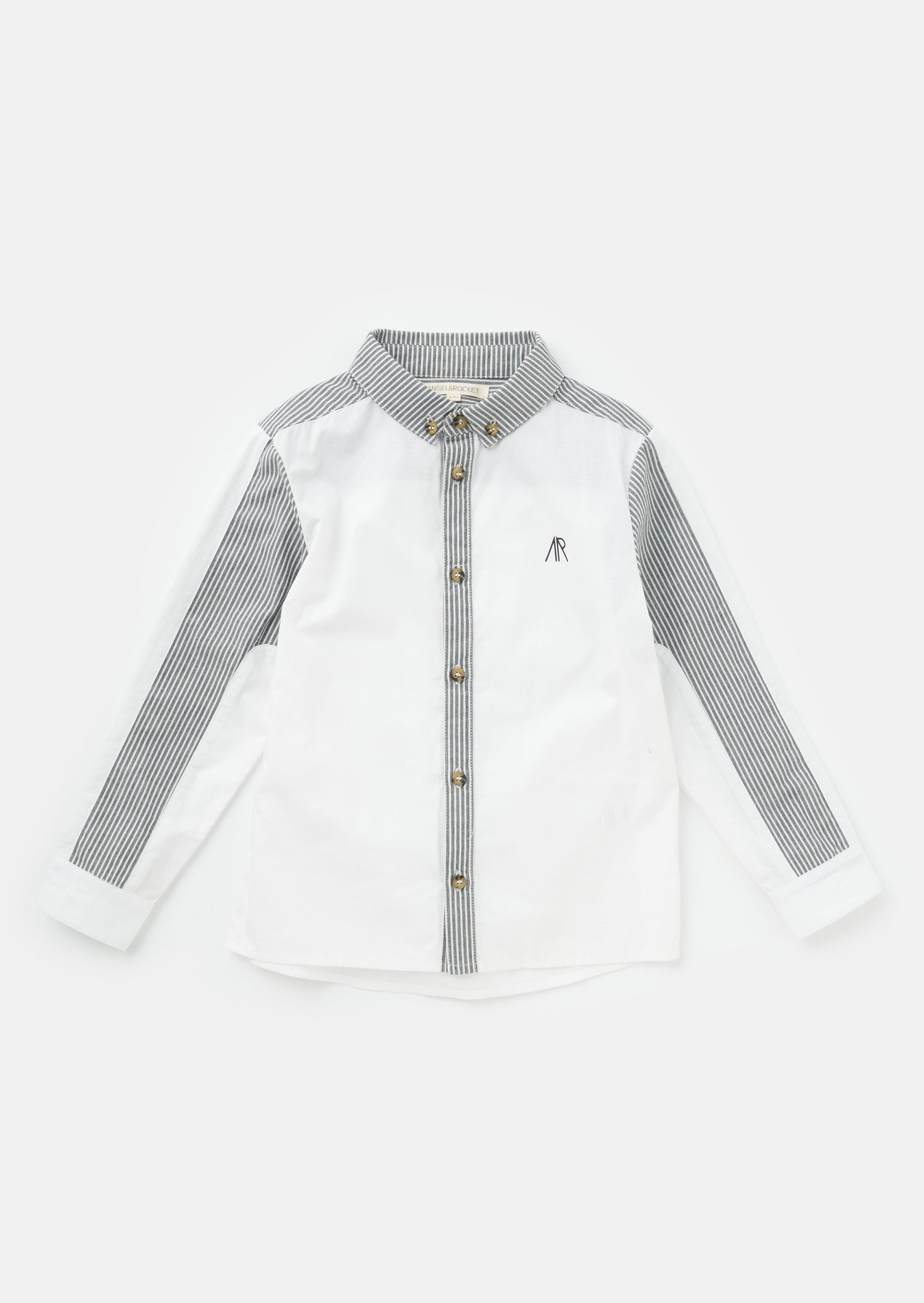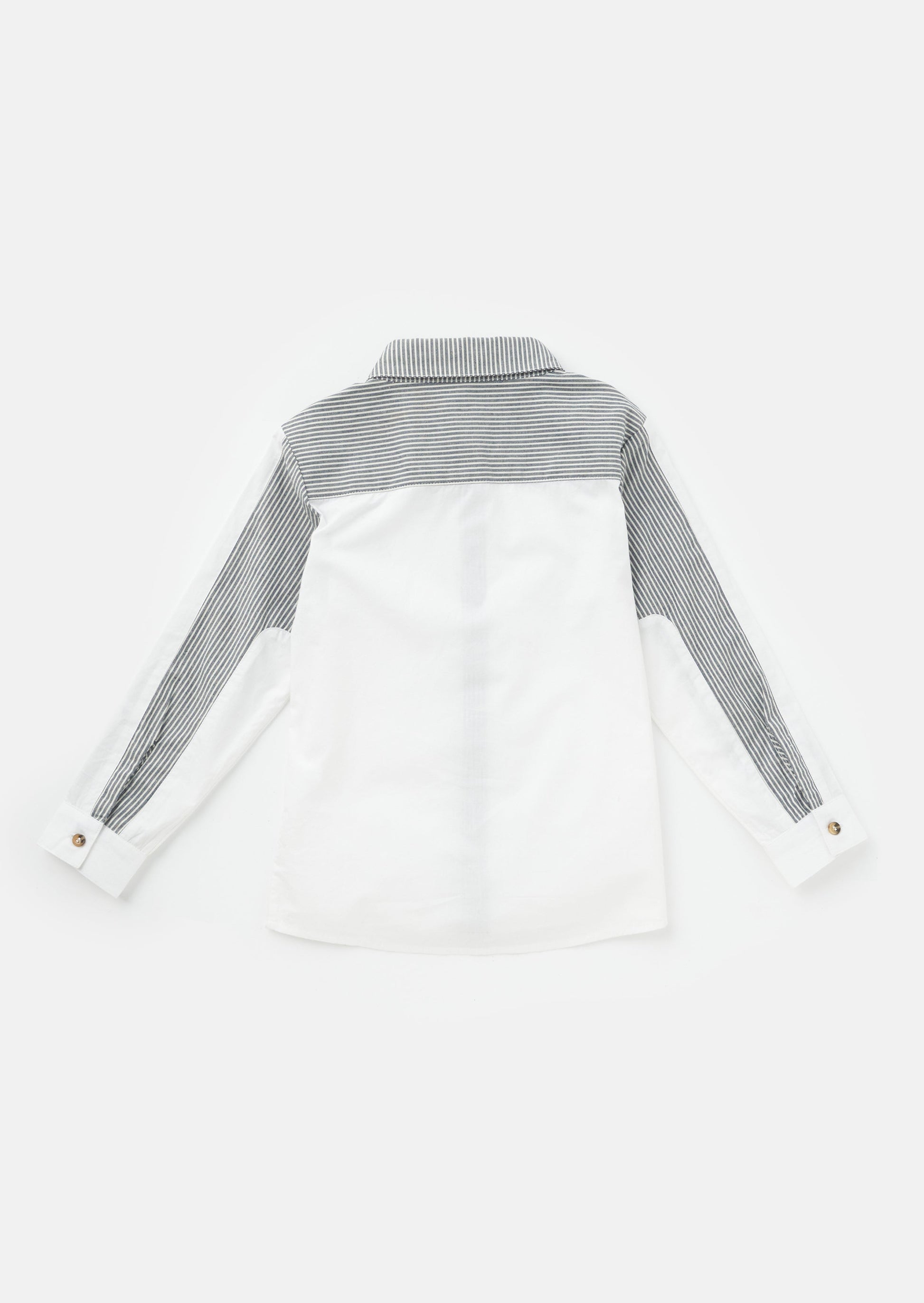 Our white shirt re-mix! Cut and sew colourblock mixing clean white poplin with a classic ticking stripe. Smart dressing!