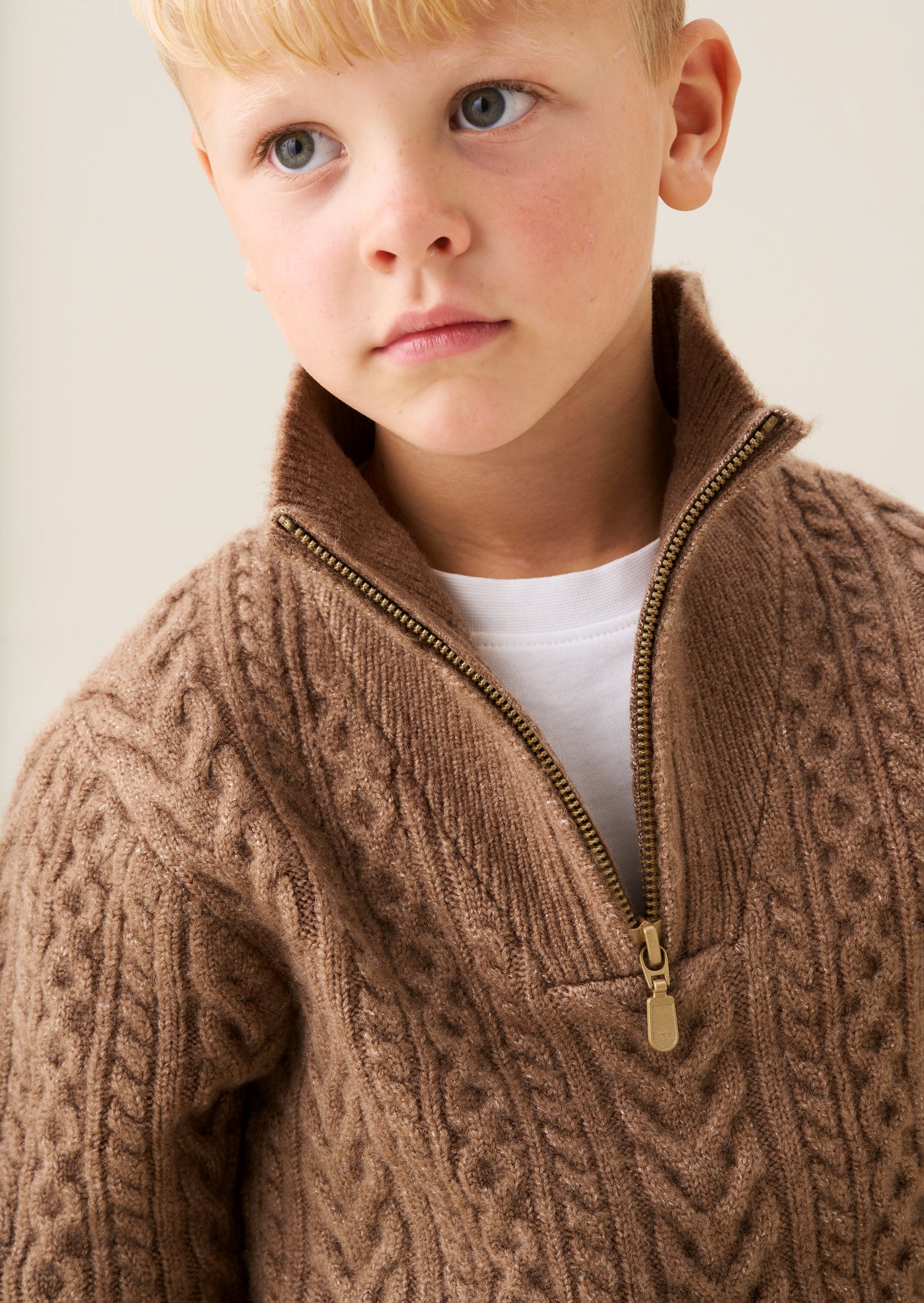 This knit is ready to take on chilly days! Super soft yarn knitted into a chunky cable in a stylish chocolate colour with a funnel neck and 1/4 zip opening. Wear with denim or cargos.