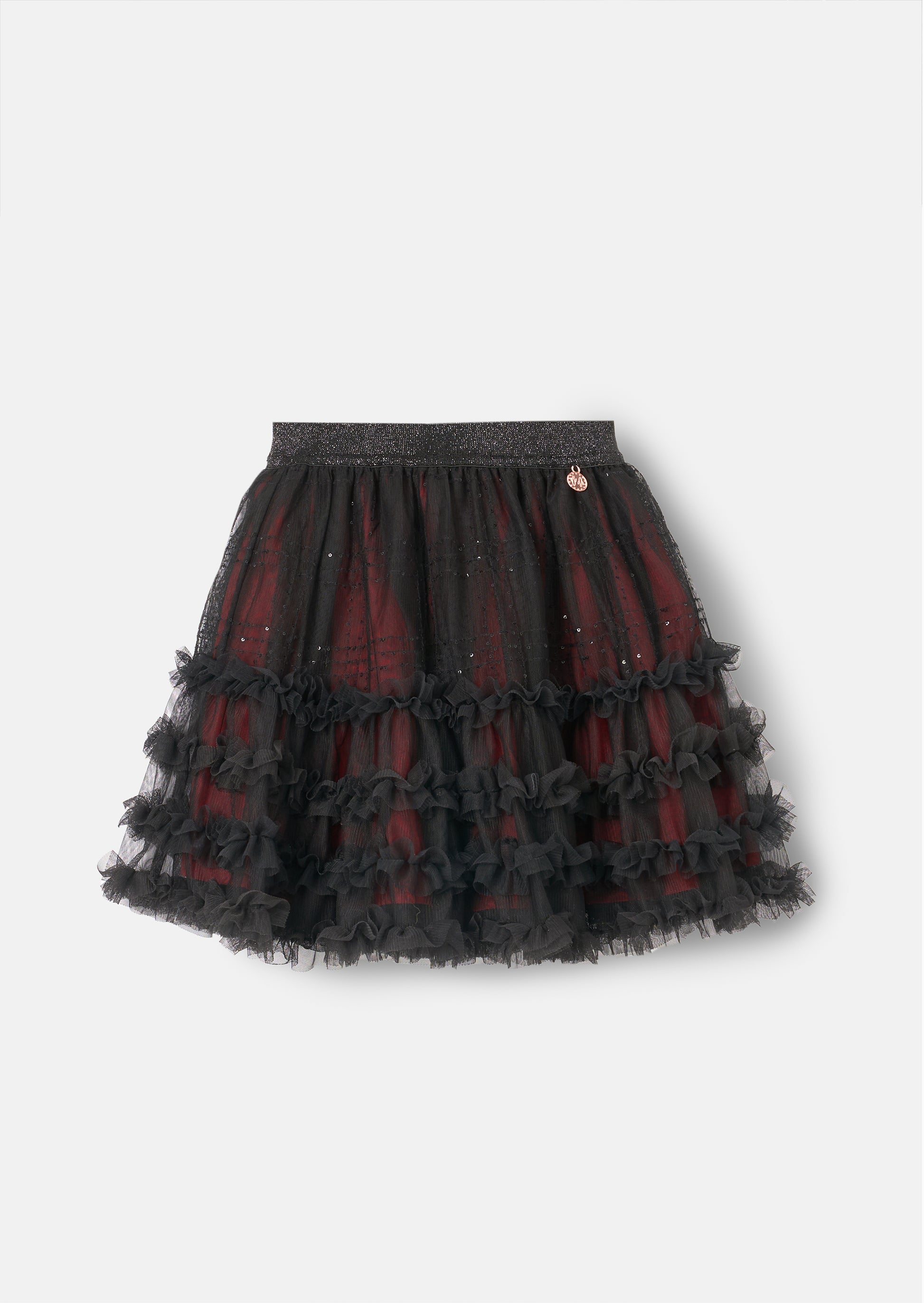Our statement mesh skirt features layers of black ruffles with shimmering tartan-style sequins and a bold pop of red lining underneath. Finished with a comfy glitter waistband, it's perfect for party twirls, festive fun, and making every moment feel like a celebration.