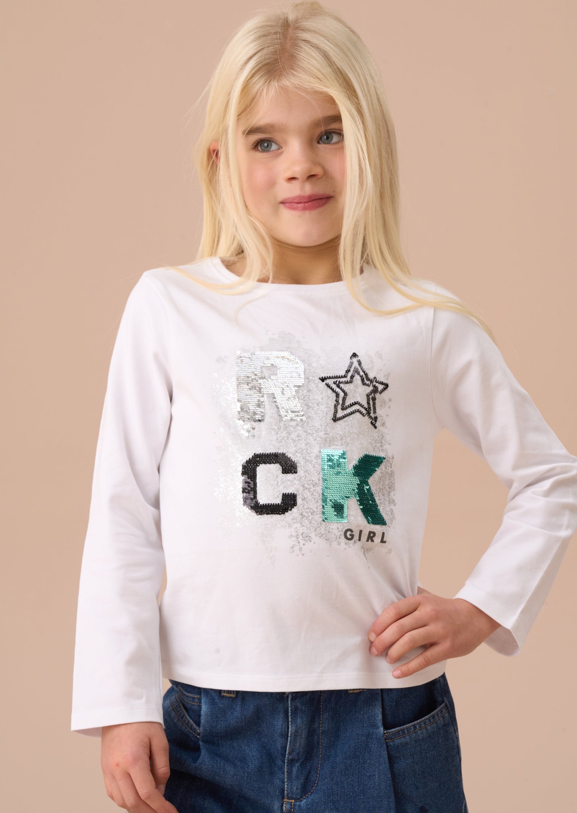 This long sleeve top ROCKS! Crafted from super soft cotton jersey featuring a sequin embellished slogan, this top will take you through the seasons. Looks even more fabulous when paired with our sequin skirt.