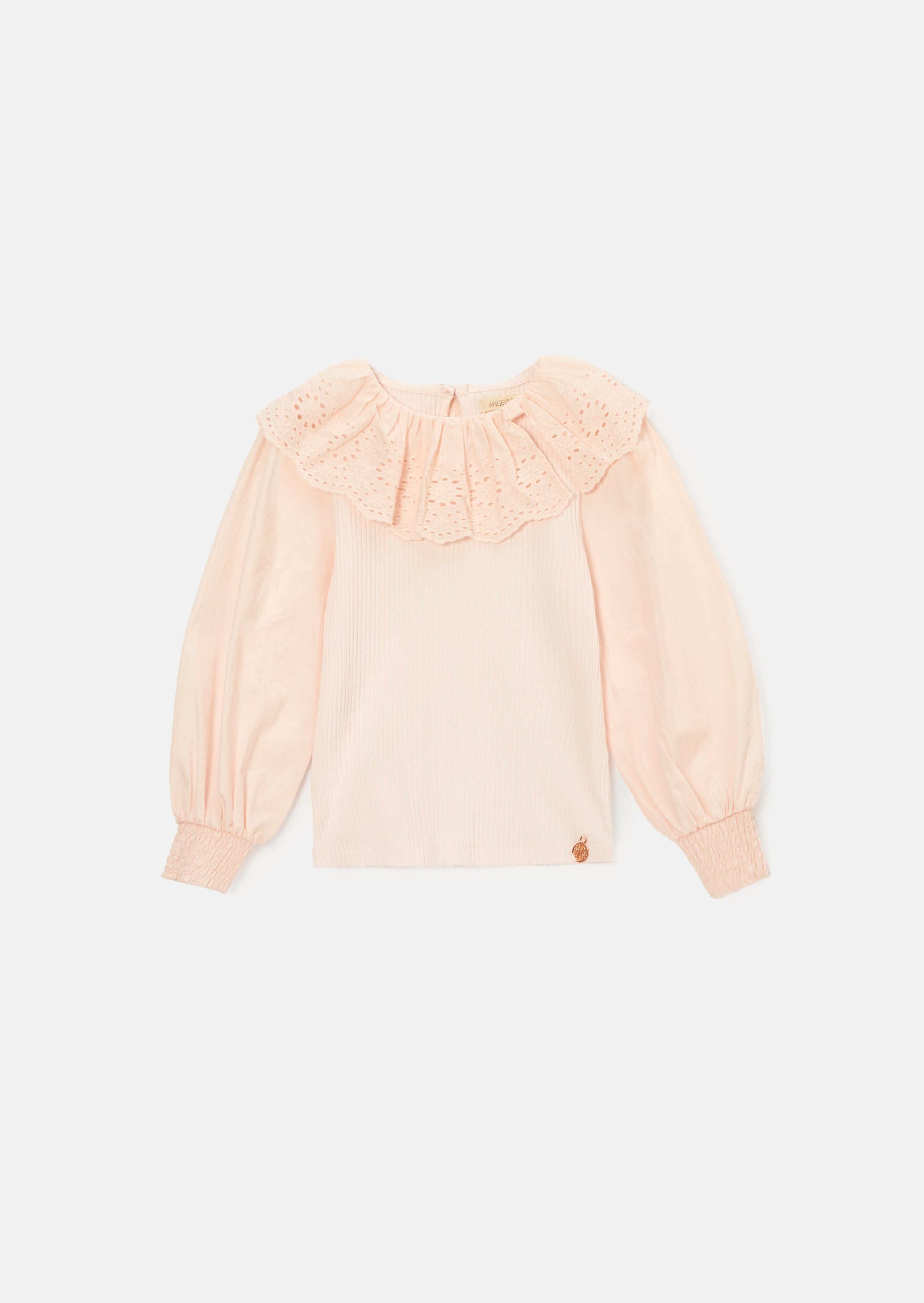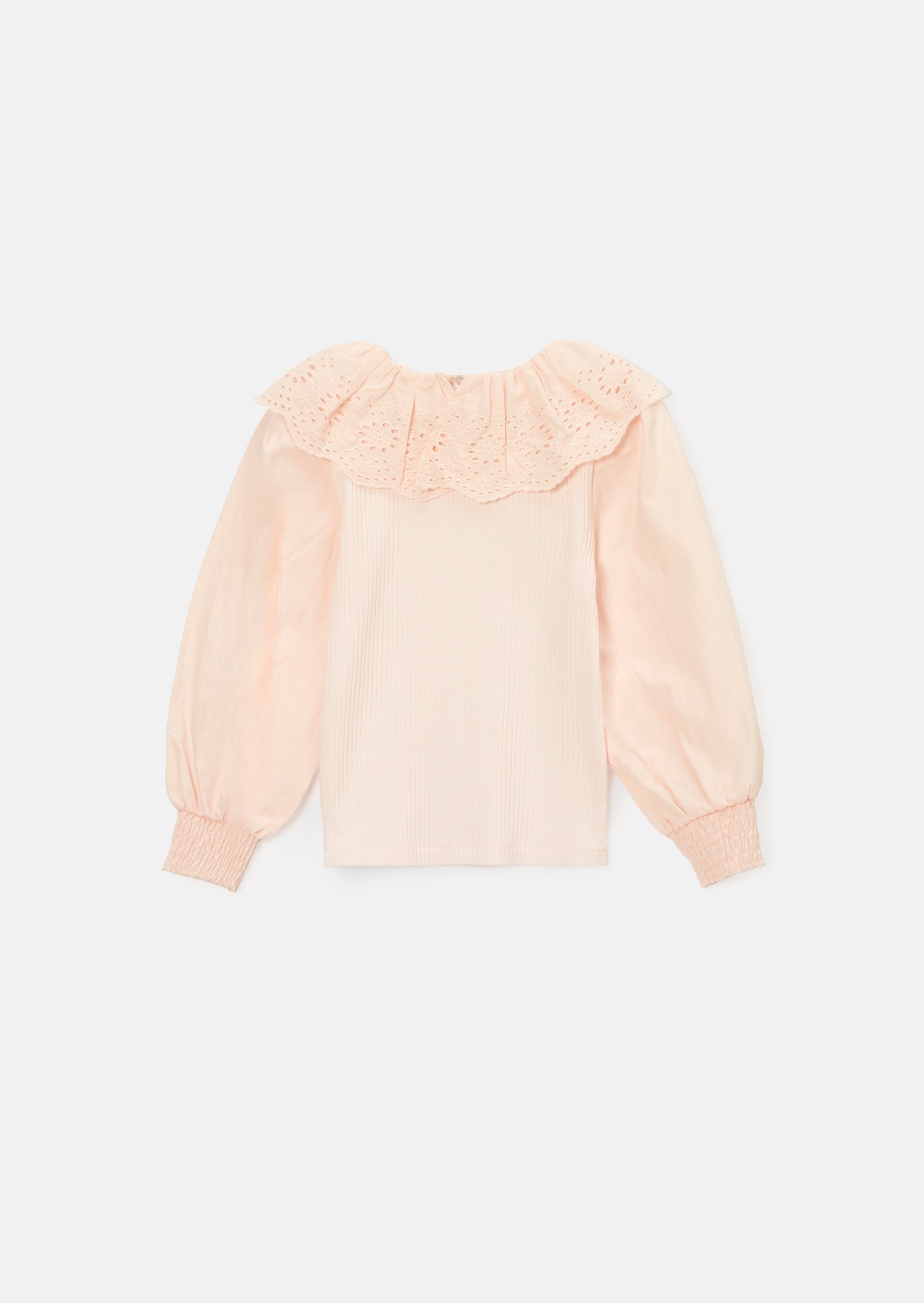 Mix woven sleeves with a rib jersey body, add a stunning broderie collar and you have the perfect blend of comfort and style. Wear with denim or dress it up with a skirt. A true wardrobe staple.