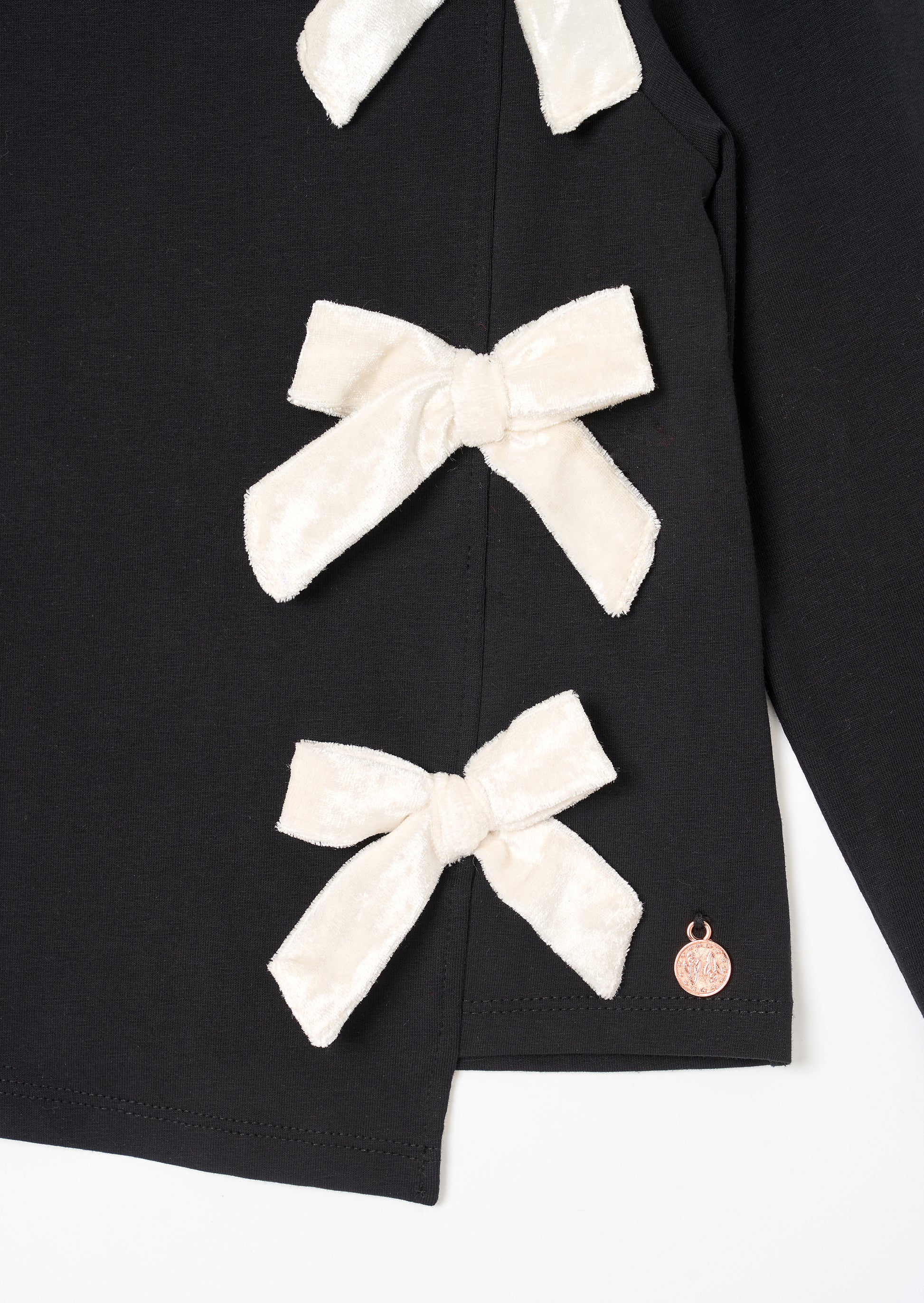 Our soft black jersey top gets a stylish update with an asymmetric row of cream bows down the front. Easy to dress up or down, it's a standout staple that adds a playful edge to everyday dressing or special occasions.