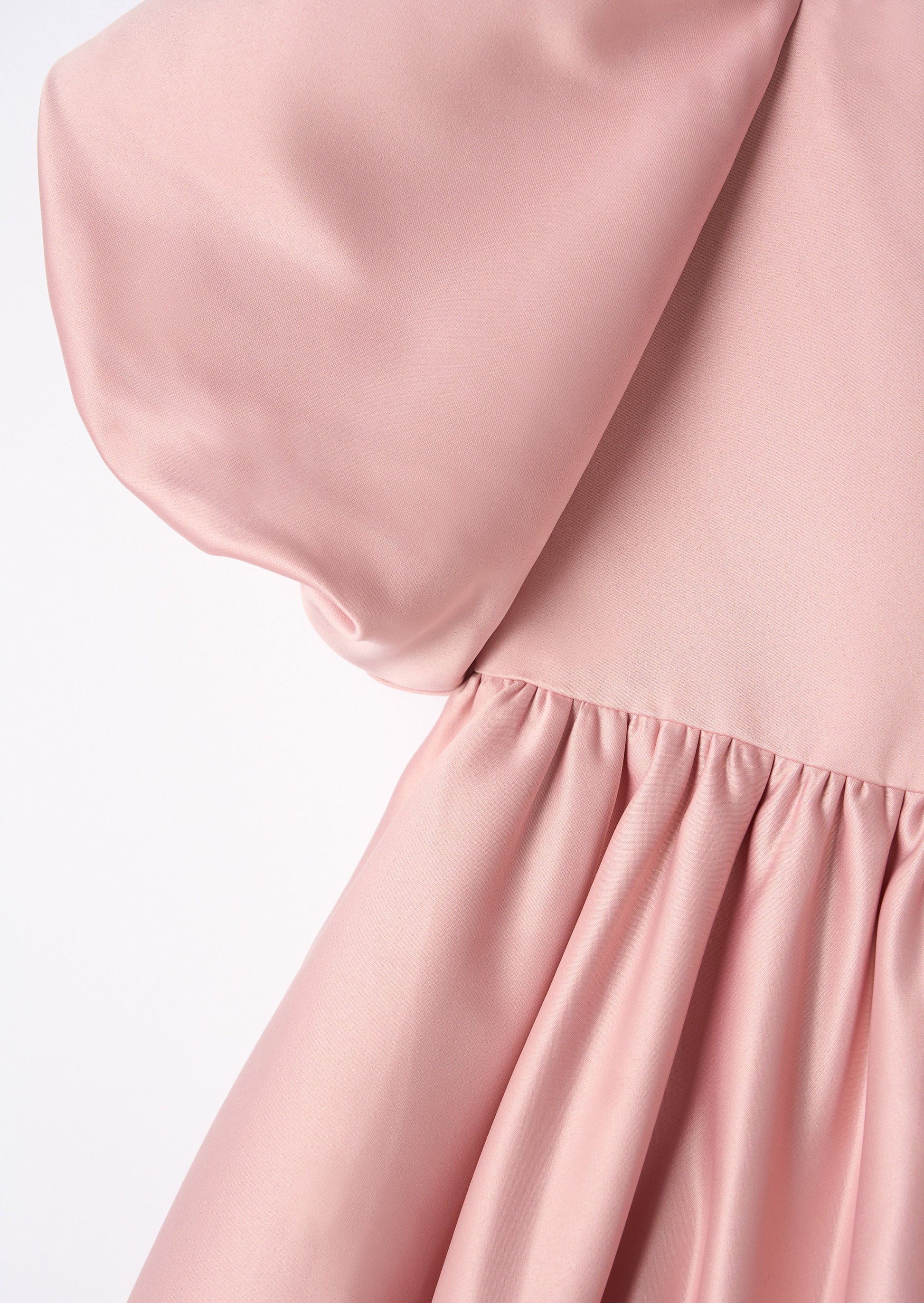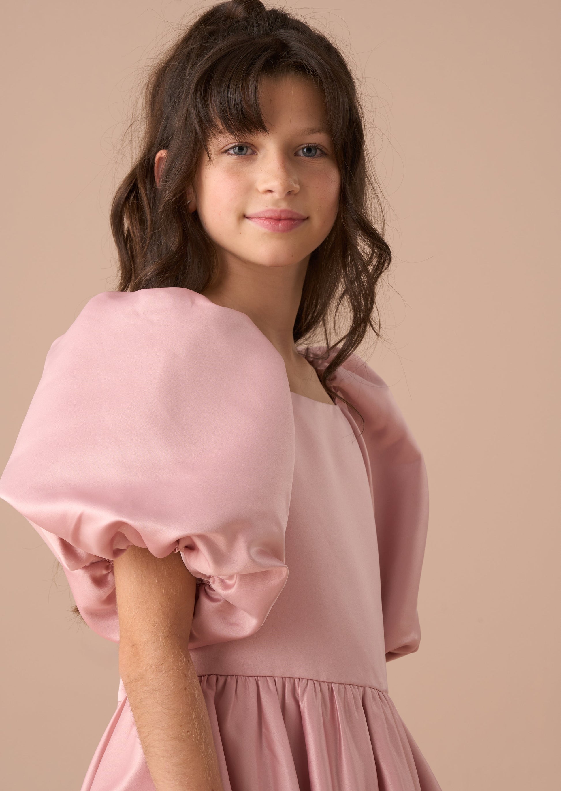 Our new satin dress is a charming choice. The blush pink hue adds a classic touch while the full skirt ensures maximum twirl factor! Cut into a pretty silhouette with an exaggerated puffball sleeve and bubble hem, it's the picture-perfect choice for any special occasion.