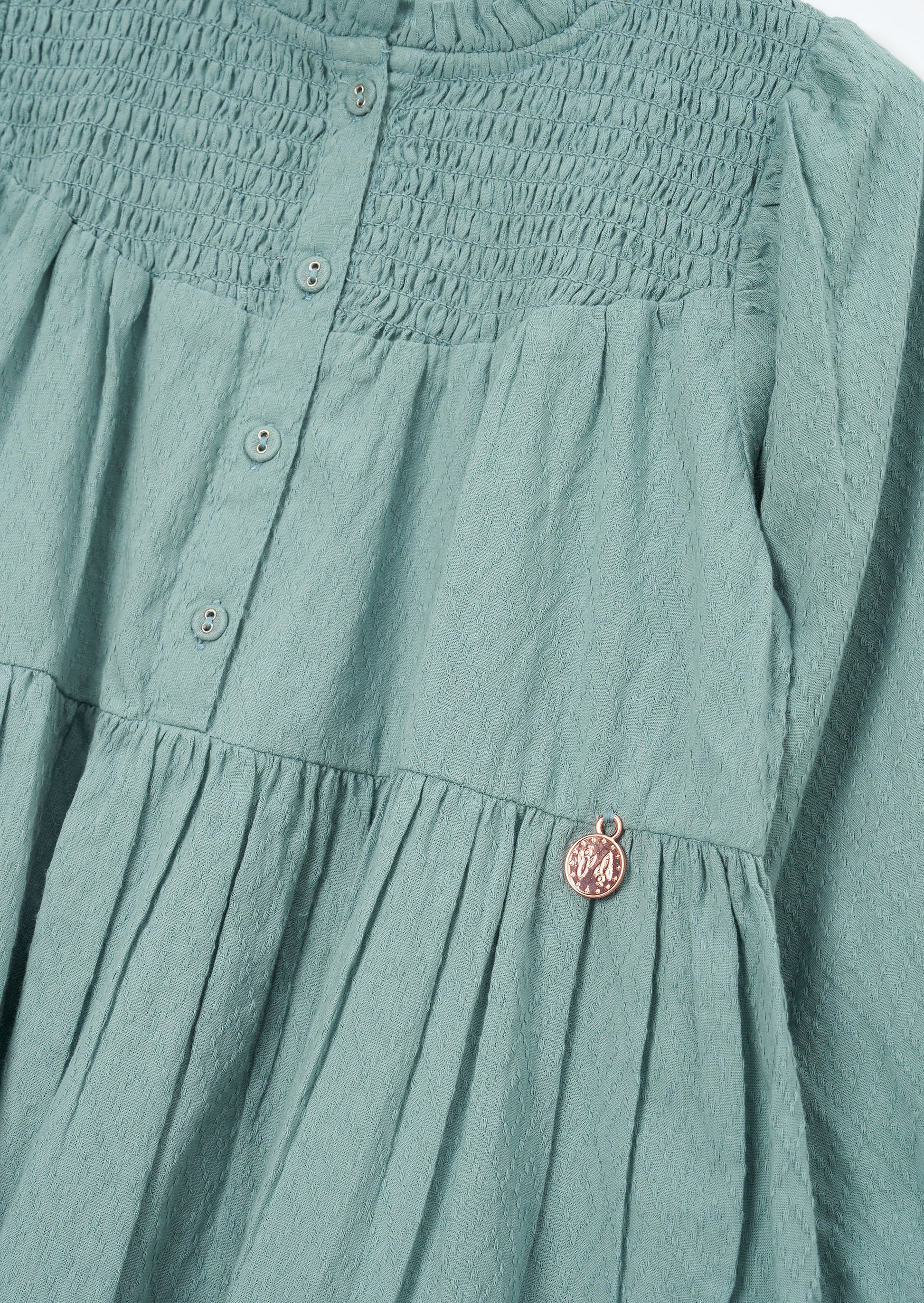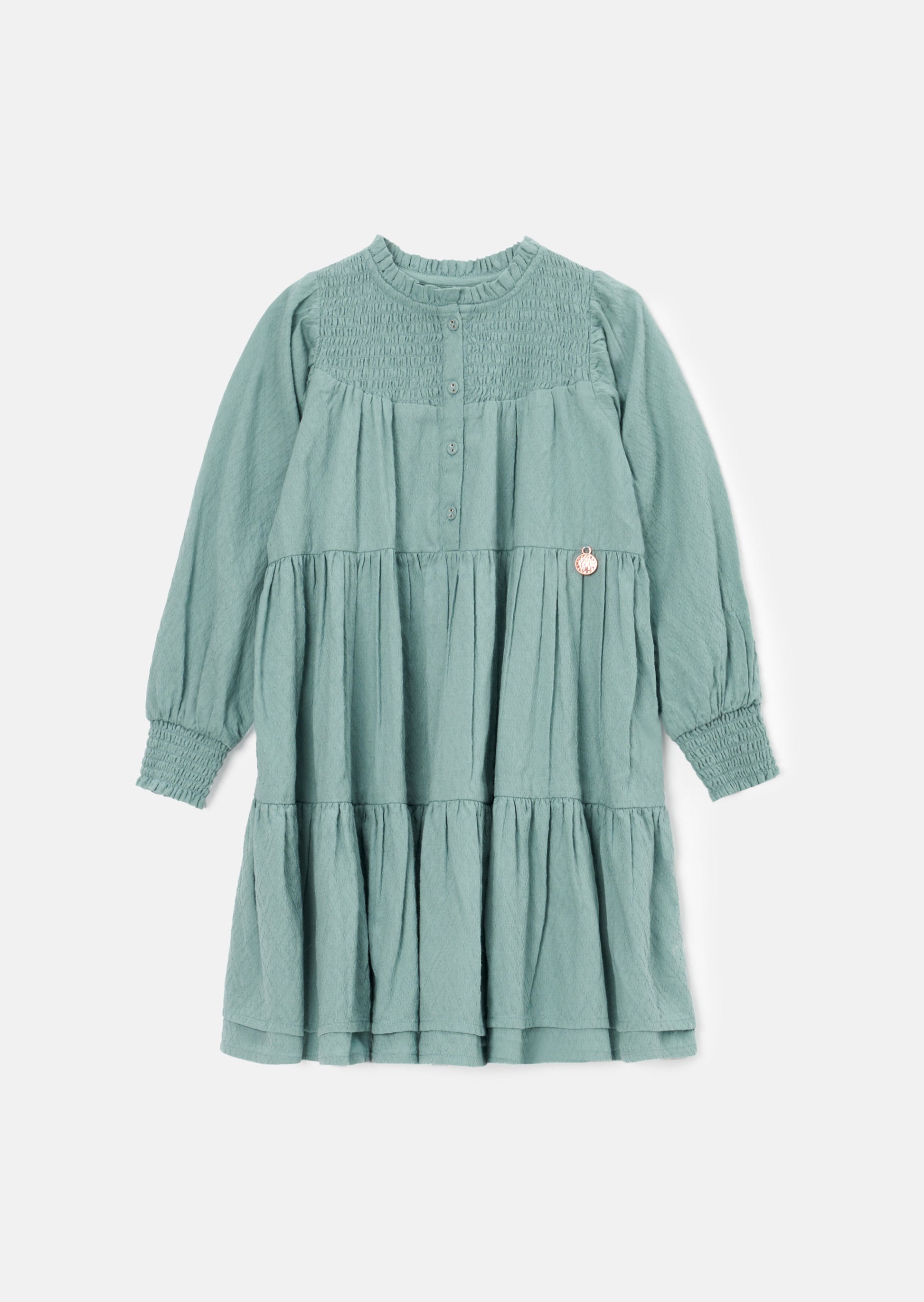 This dress welcomes the changing of the season with open arms. The stunning textured fabric is cut into a multi-layer silhouette with a button-through placket and smocking detail in a sumptuous soft green hue.