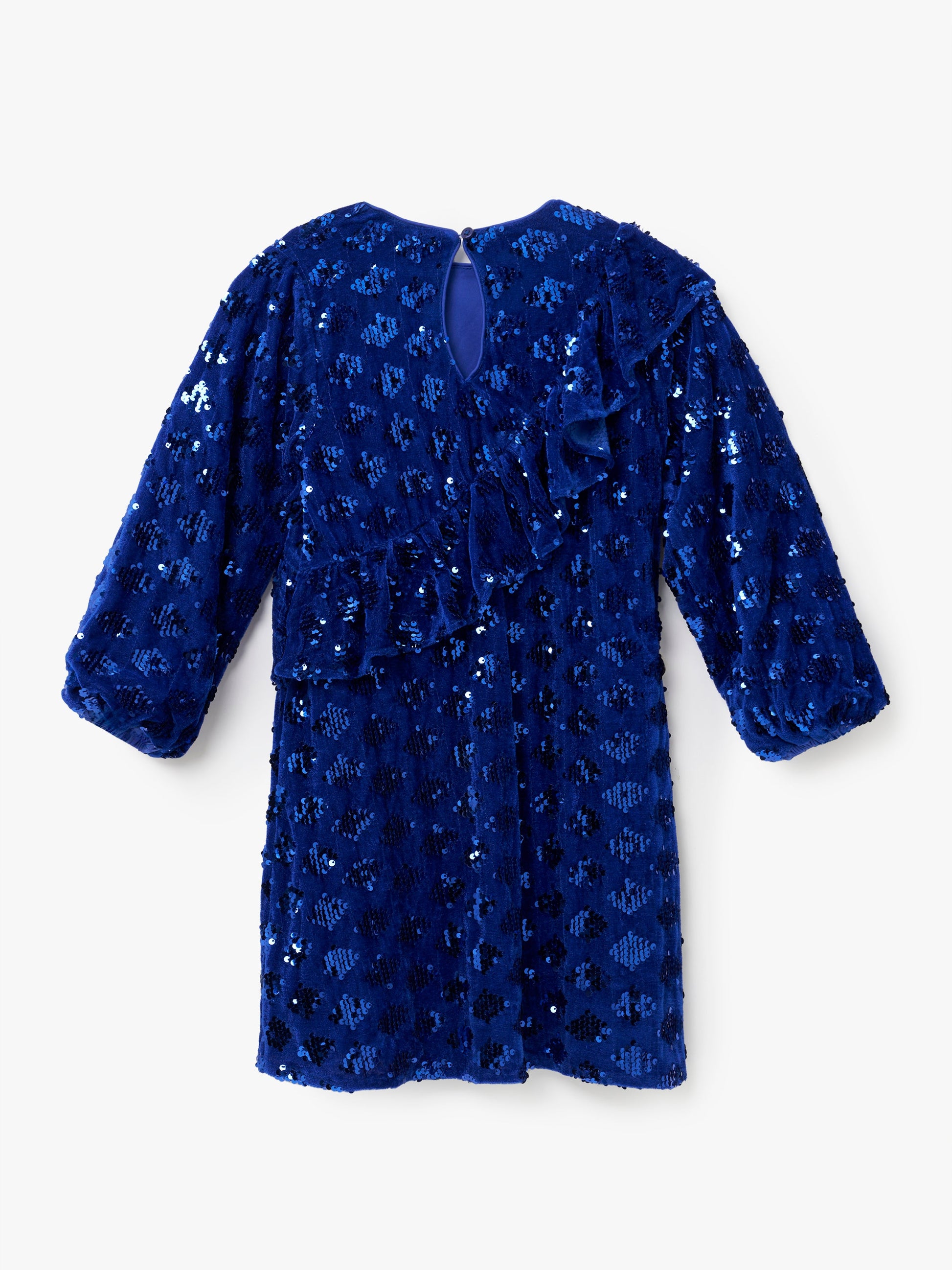 Get ready for seasonal celebrations with this rich cobalt velvet blue dress. Featuring scattered sequin detail , it has a long sleeve and ruffle detail.