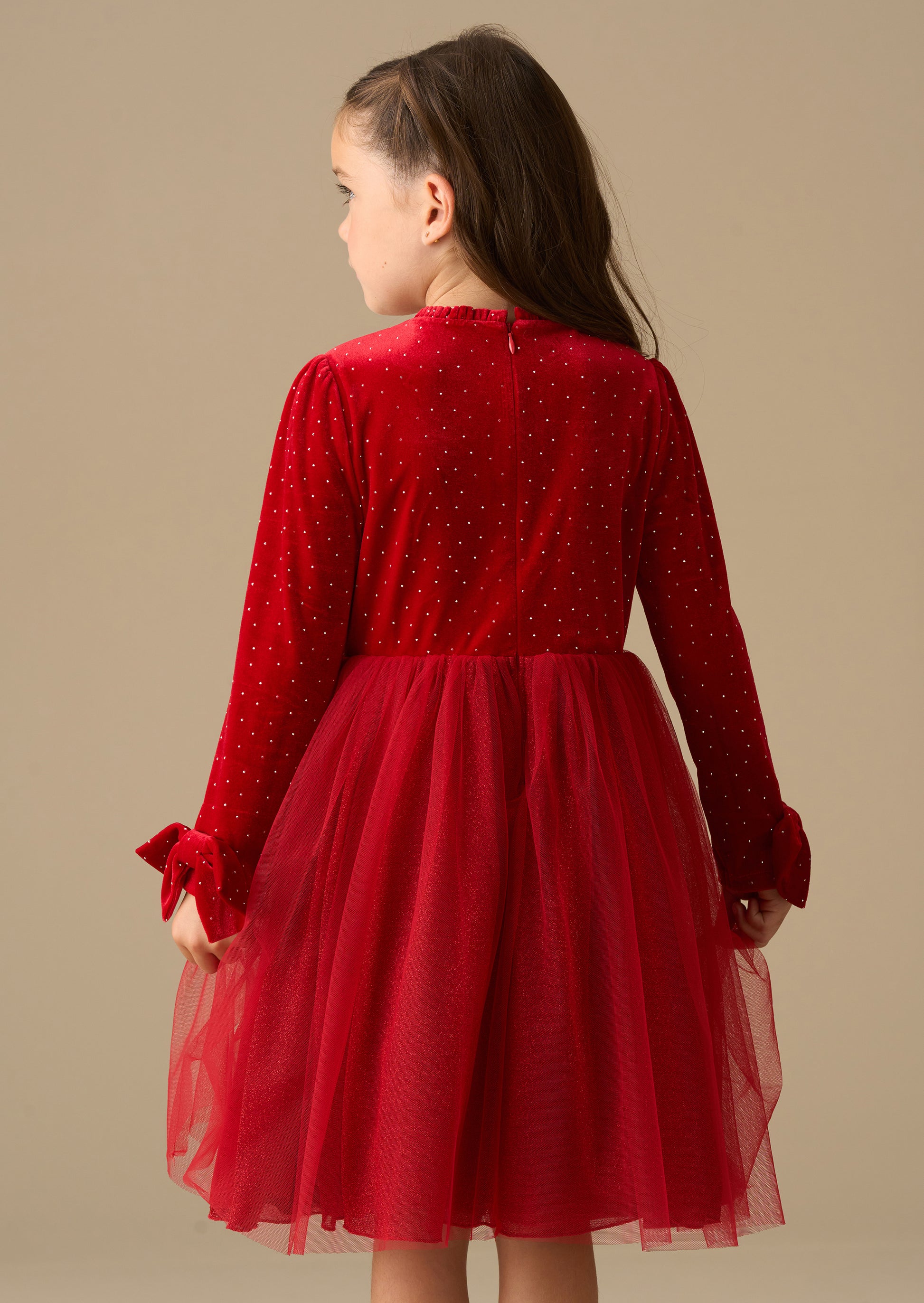 This dress has everything you need for your festive fun — a soft velvet bodice scattered with diamontes, a voluminous glitter skirt layered with soft tulle, and just the right amount of sparkle to twirl through every celebration.