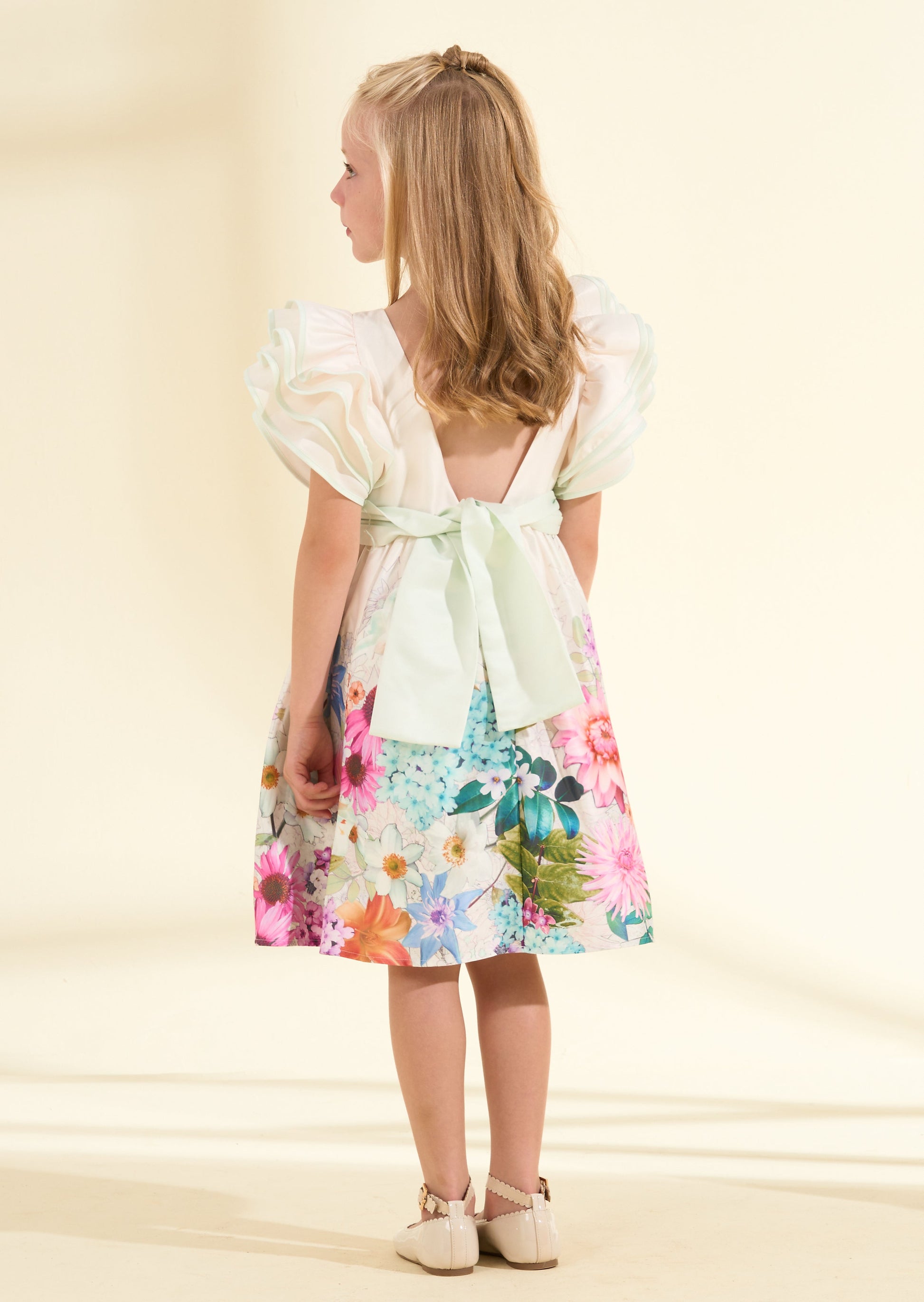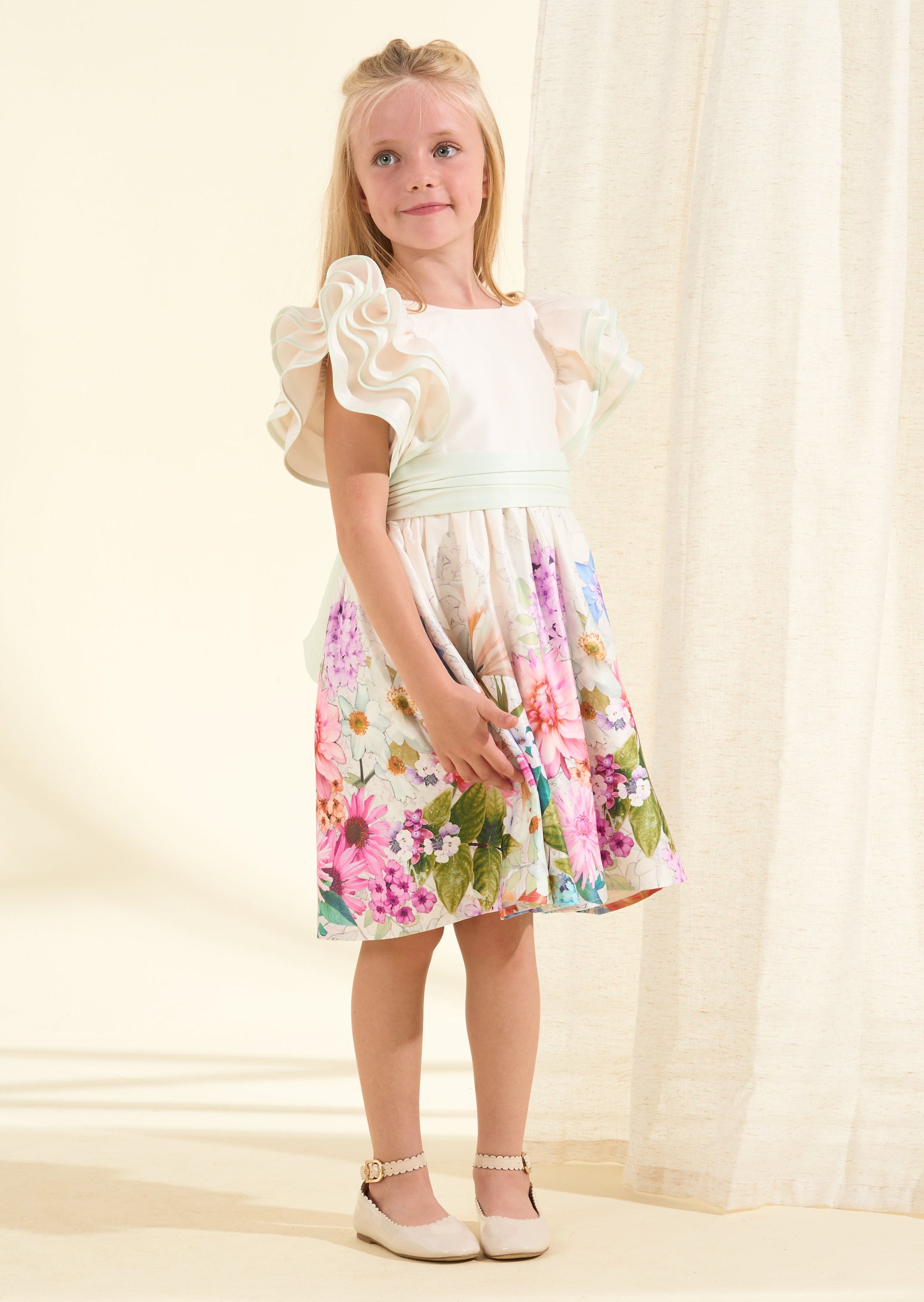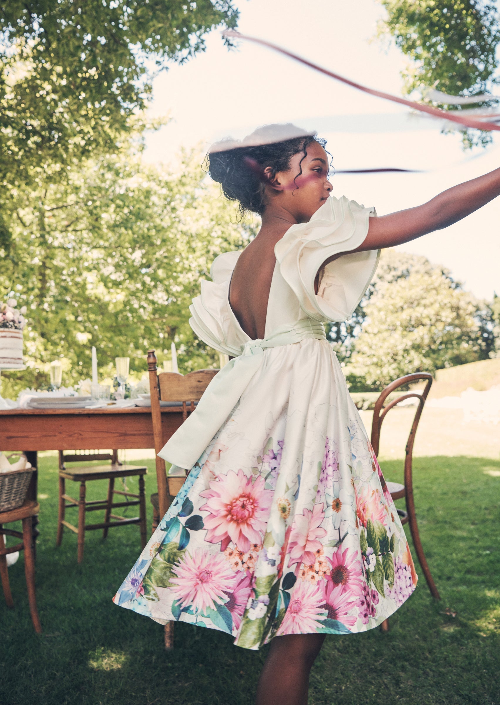 Our new Emilie dress is a delightful choice for any occasion. Crafted from soft sateen adorned with a border print floral and featuring a tie sash. The showstopping exaggerated sleeve features layers of fabric tipped ruffles. Wow.