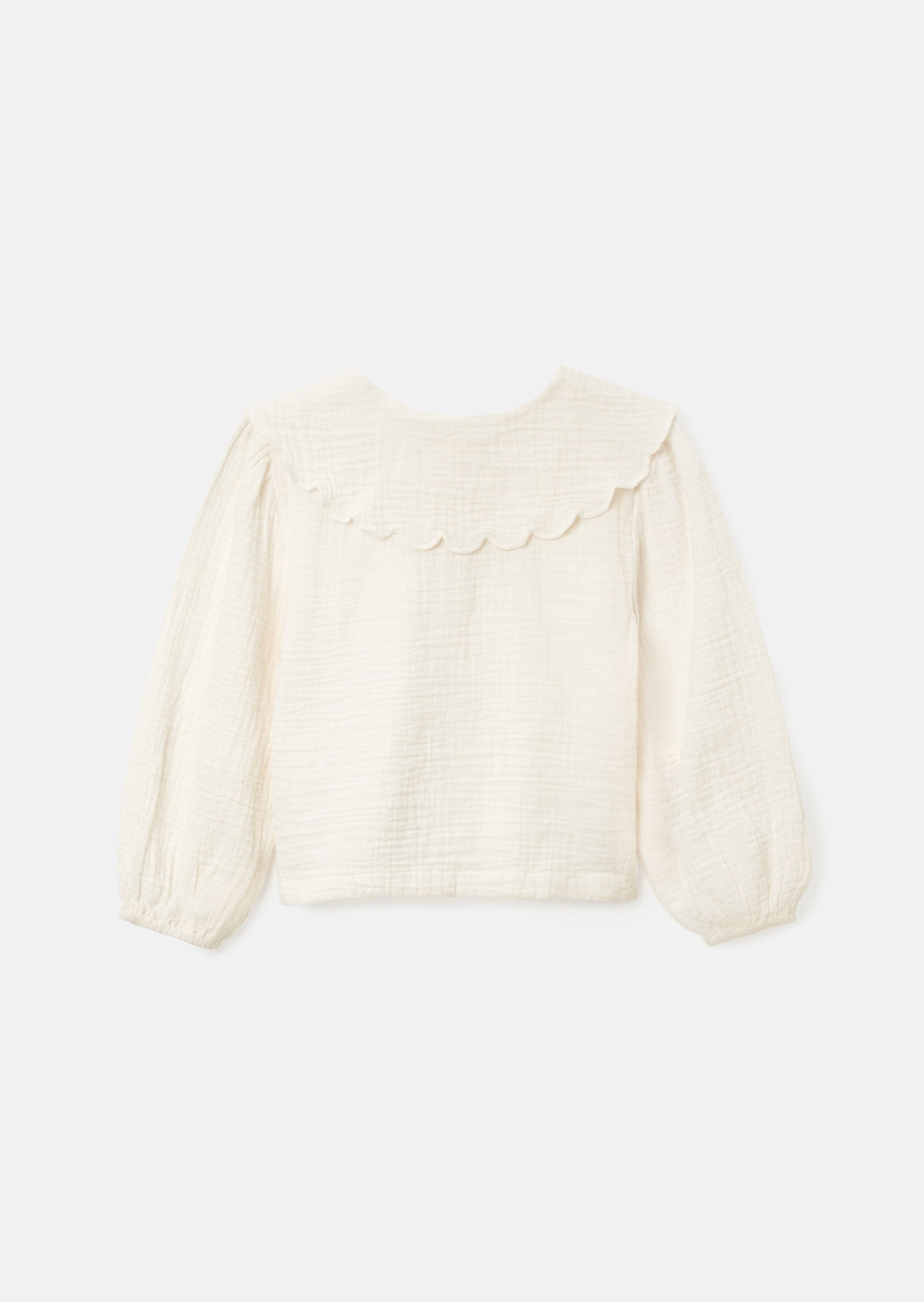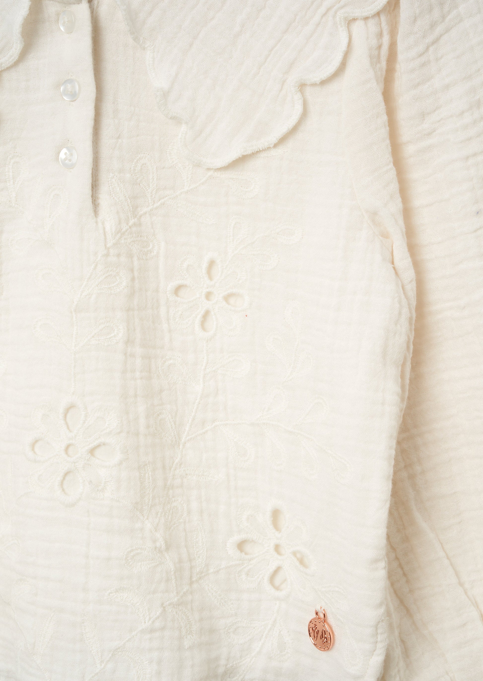 Make a style statement in this stunning blouse in super-soft cotton with cut-out embroidery detail, pretty scalloped hem and oversize statement collar. Simply divine!