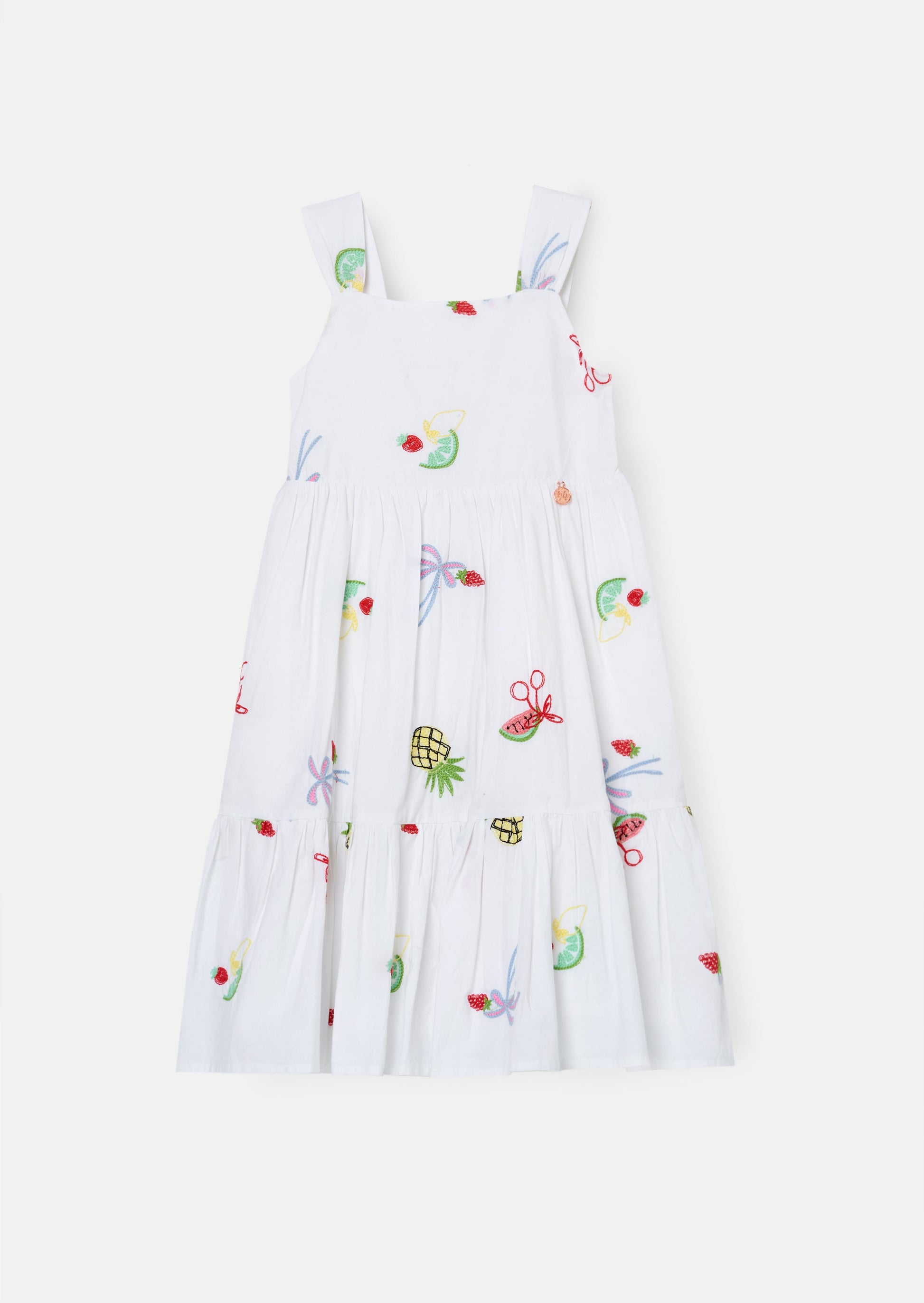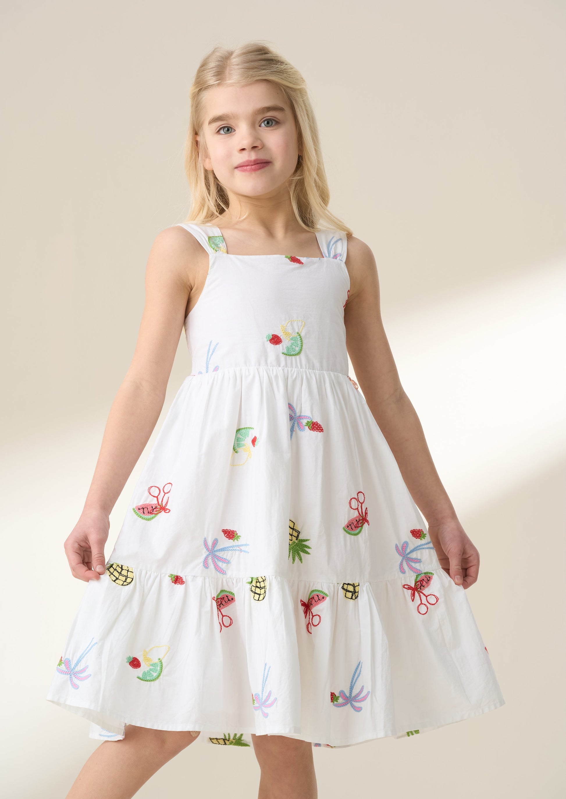Freshly picked for summer! This embroidered sundress is bursting with sunshine vibes, featuring playful fruit print embroidery on polished poplin. With a breezy shape and a comfy shirred back, it's cool, easy to wear, and made for summer days!