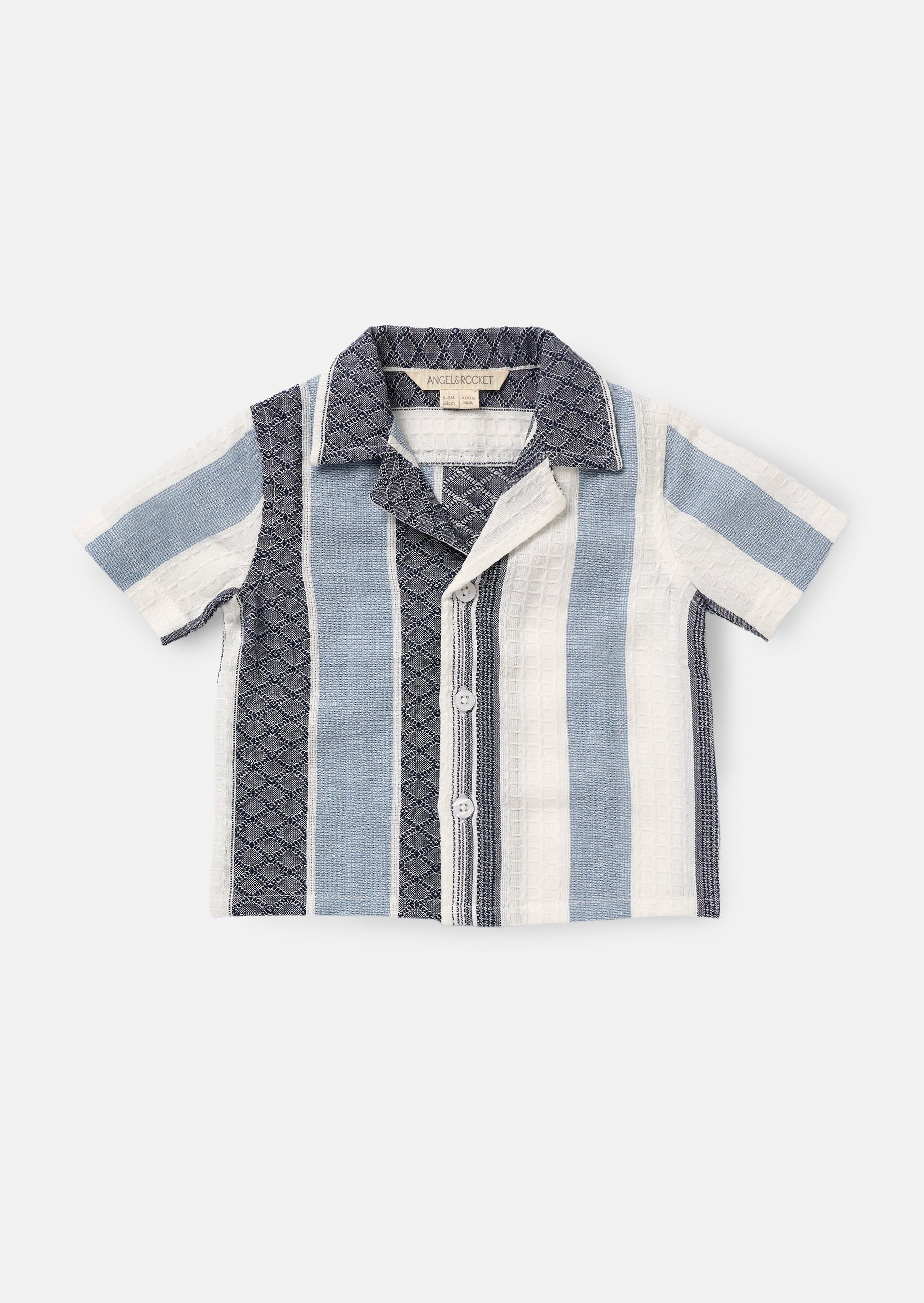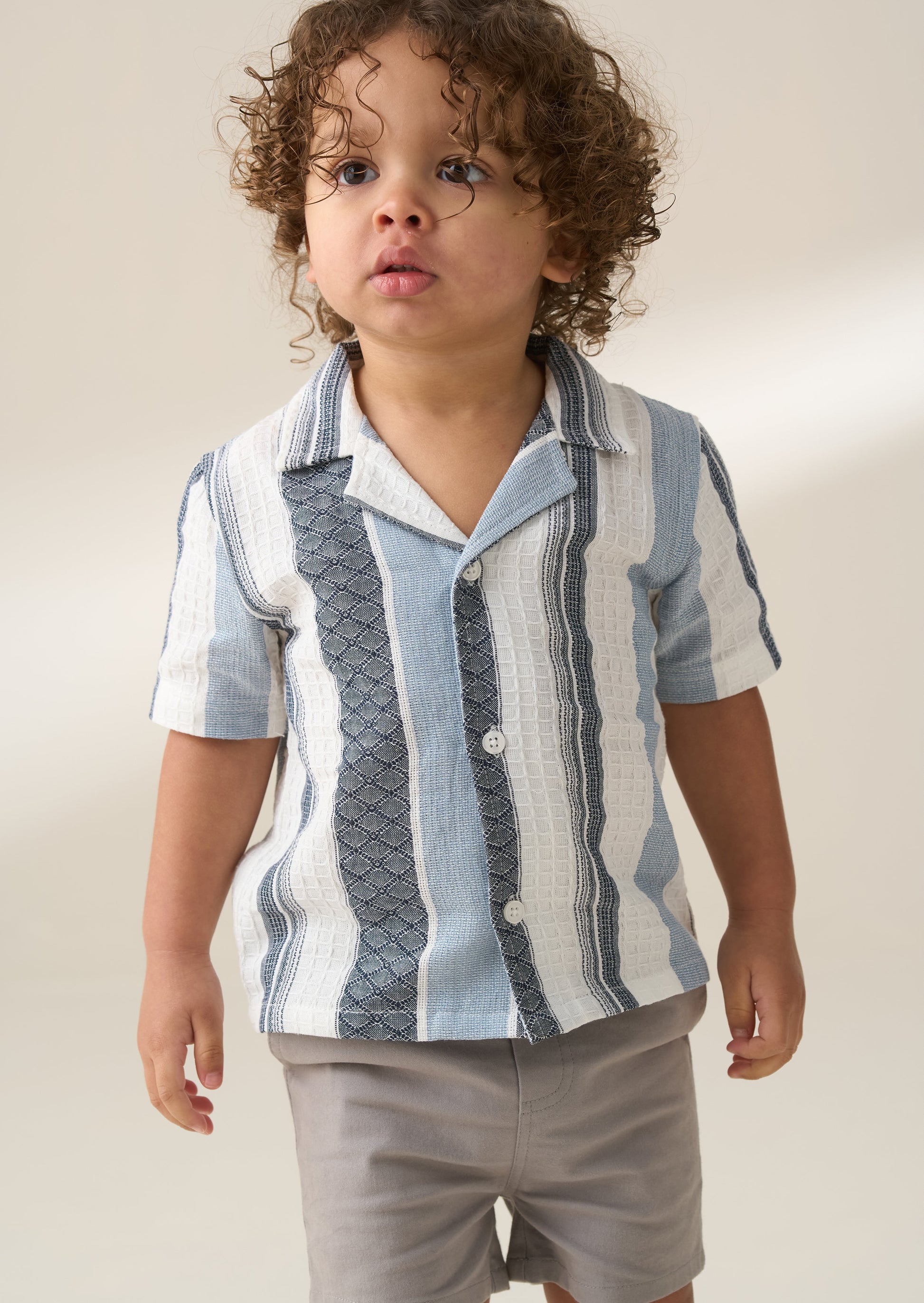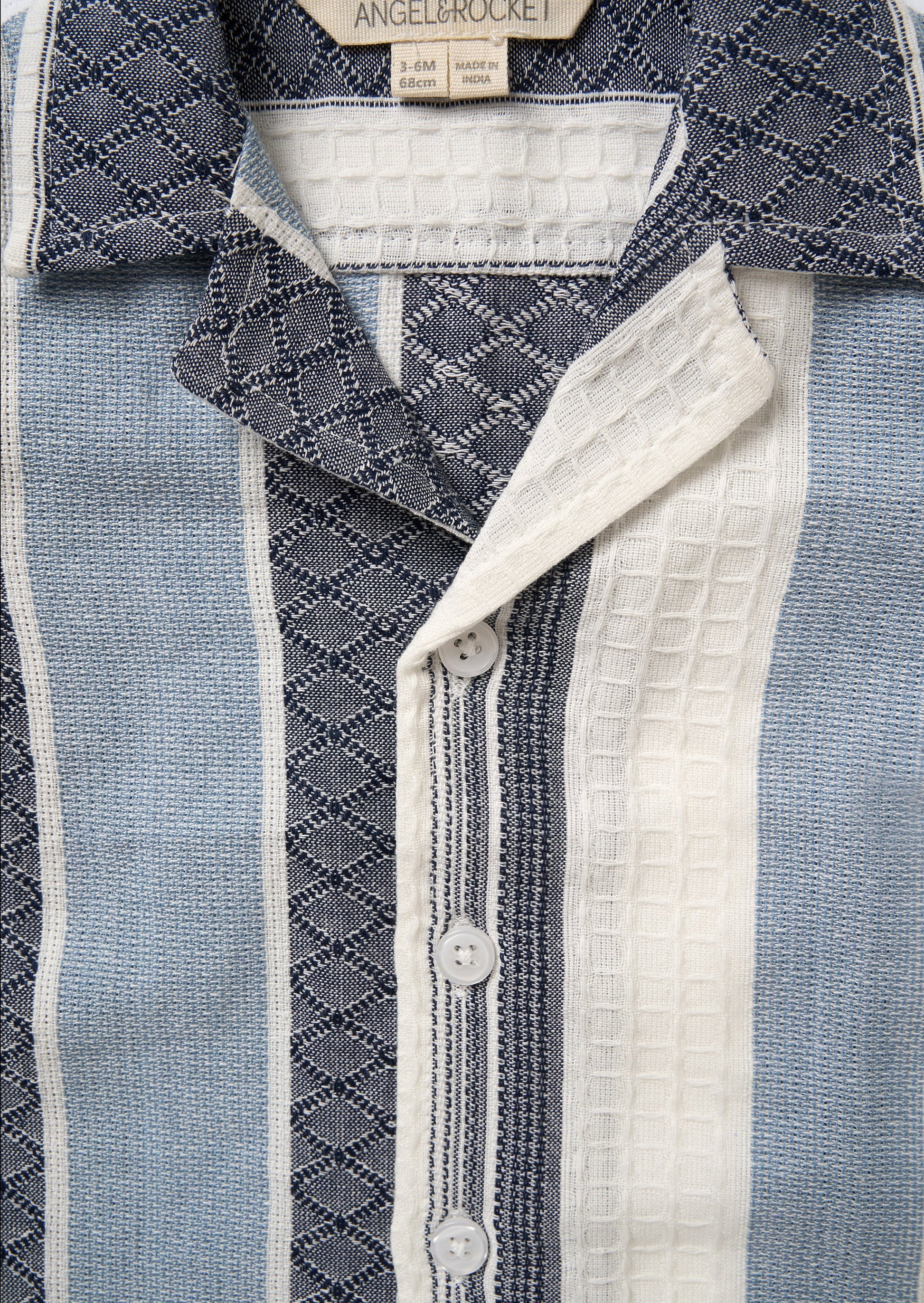 Our adorable mini resort shirt features a textured blue stripe, designed for all-day comfort with a smart yet relaxed fit. Perfect for sunny adventures, from beach days to poolside lounging. There's a matching big brother version too!