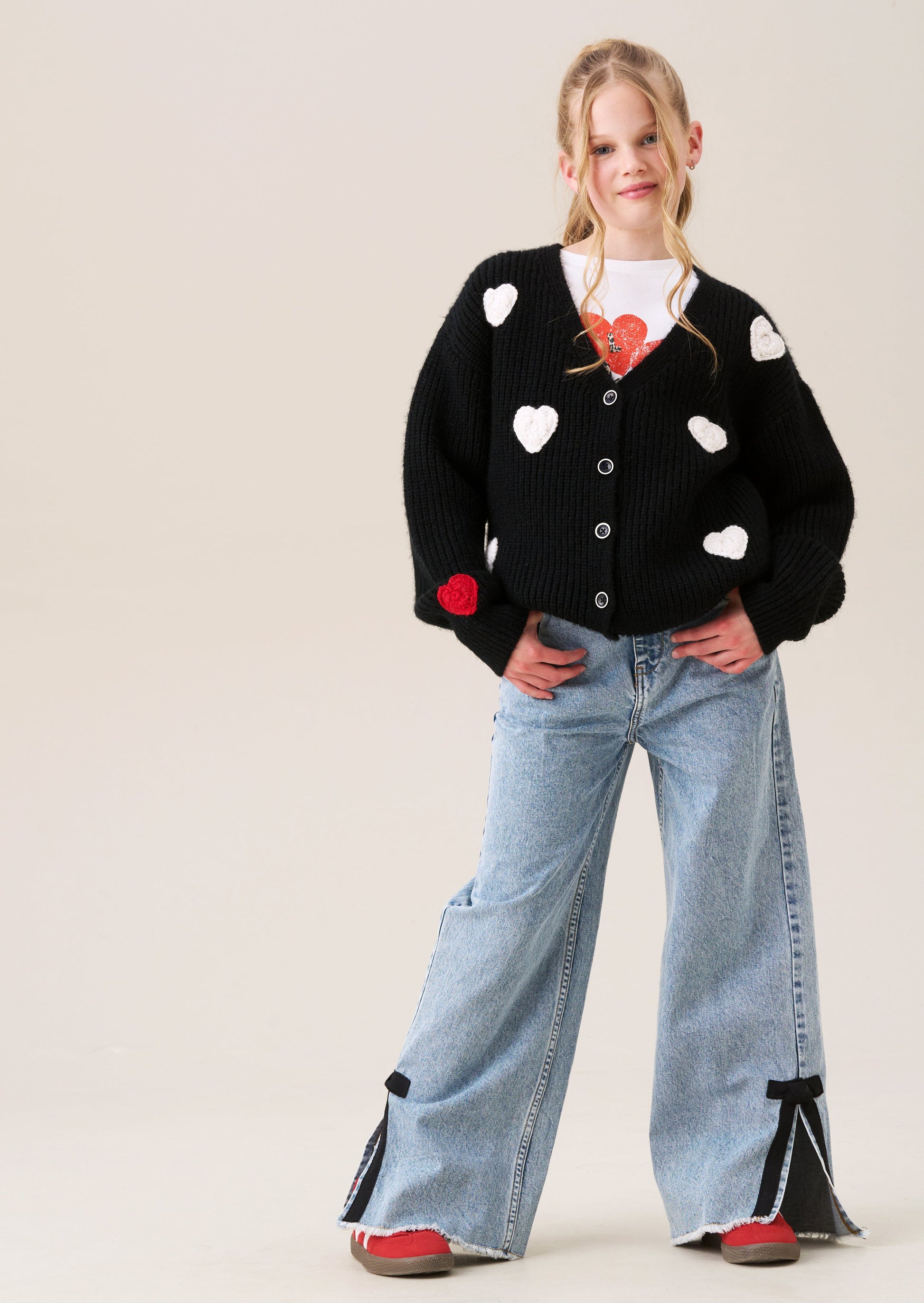 Add edge to your new season look with our chunky heart knit cardigan! Featuring crochet-style embroidered cream hearts, it's the perfect mix of cosy and cool. The chunky knit makes it an ideal layering piece for staying stylish through the cooler months.
