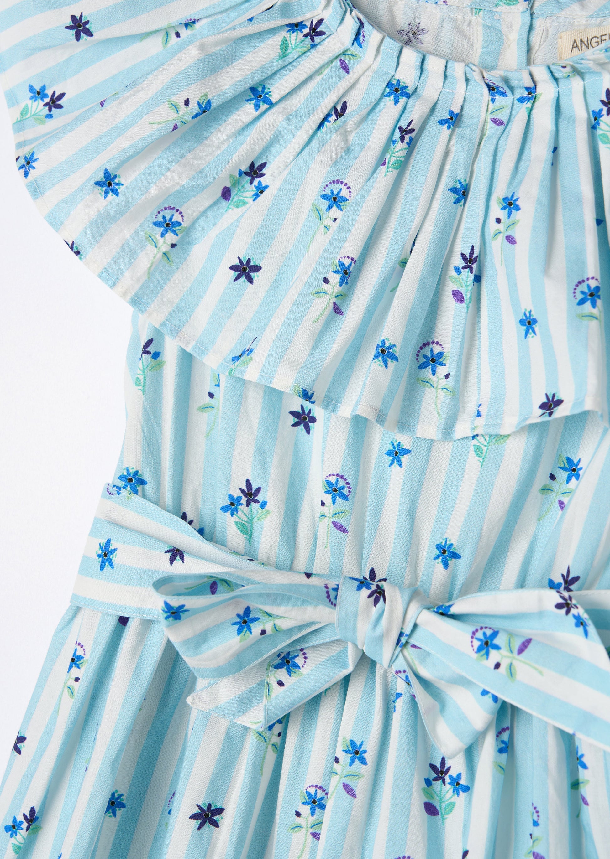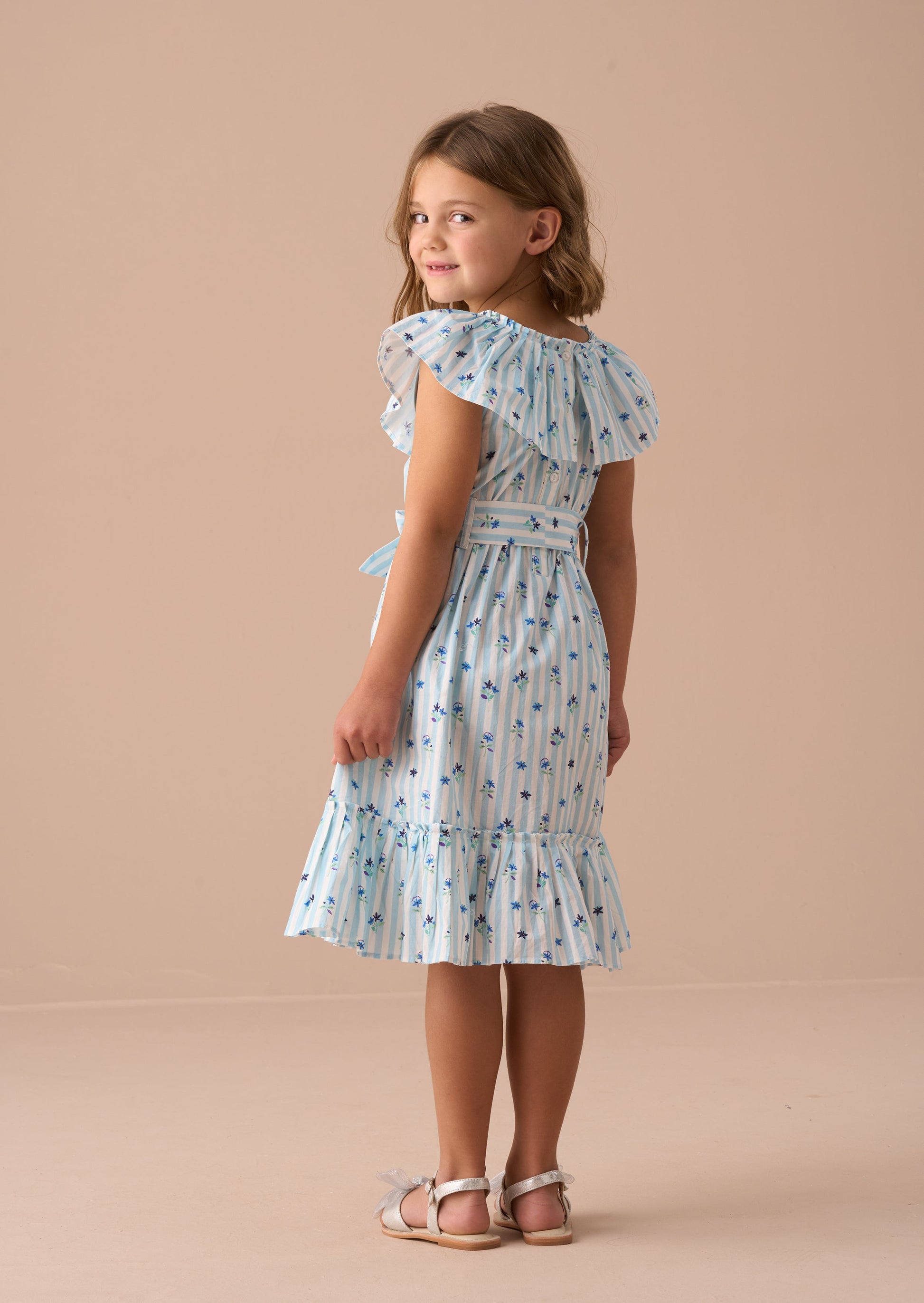 Floral and stripes unite! This dress features a beautiful all-over floral print on a fresh striped background with a pleated statement collar and tie-waist sash at the front.