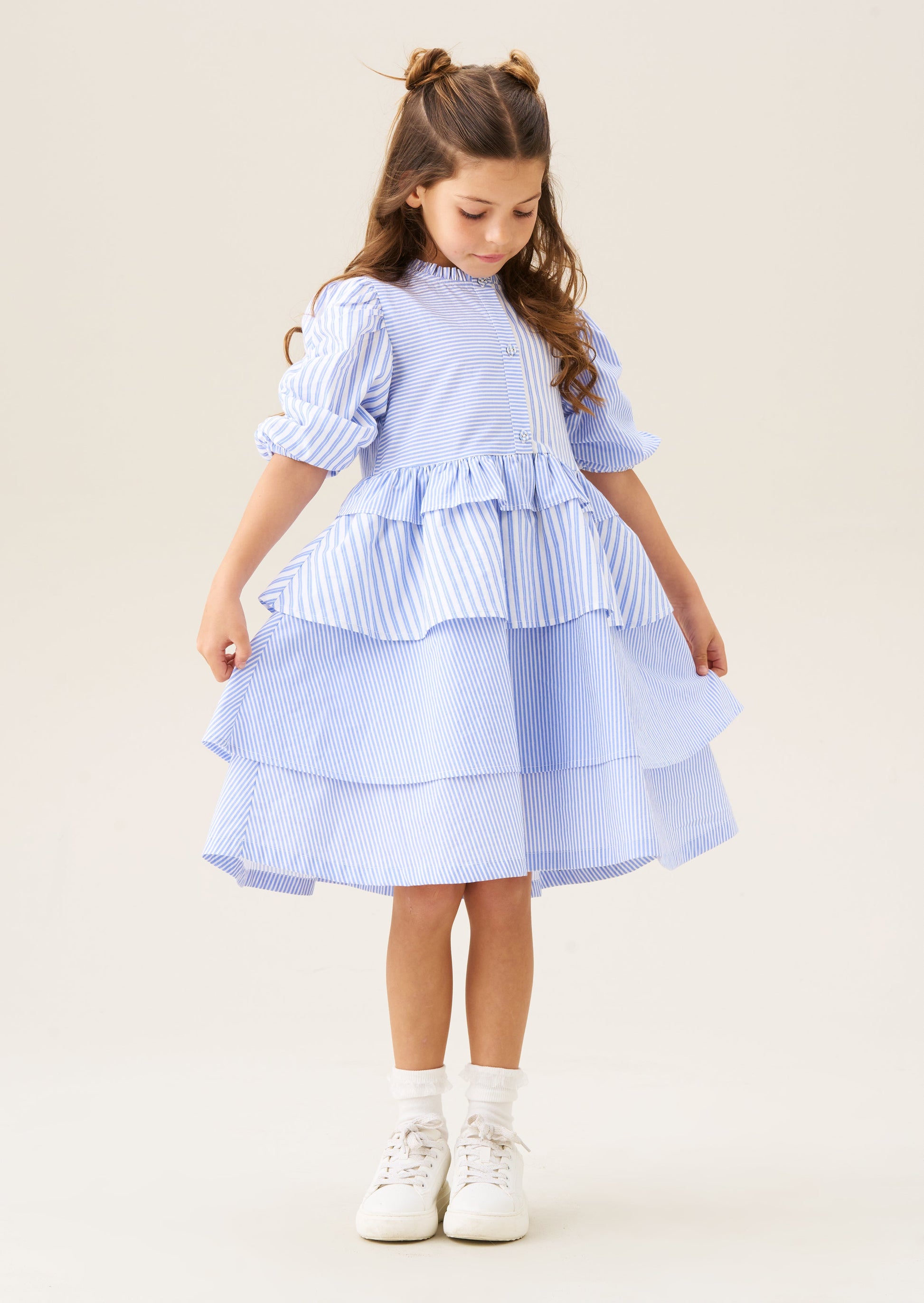 Make our bestselling patchwork shirt dress your new favourite! Featuring mixed stripe fabrics in crisp white and blue with soft gathers and pretty ruching at the sleeve. We're in heaven.