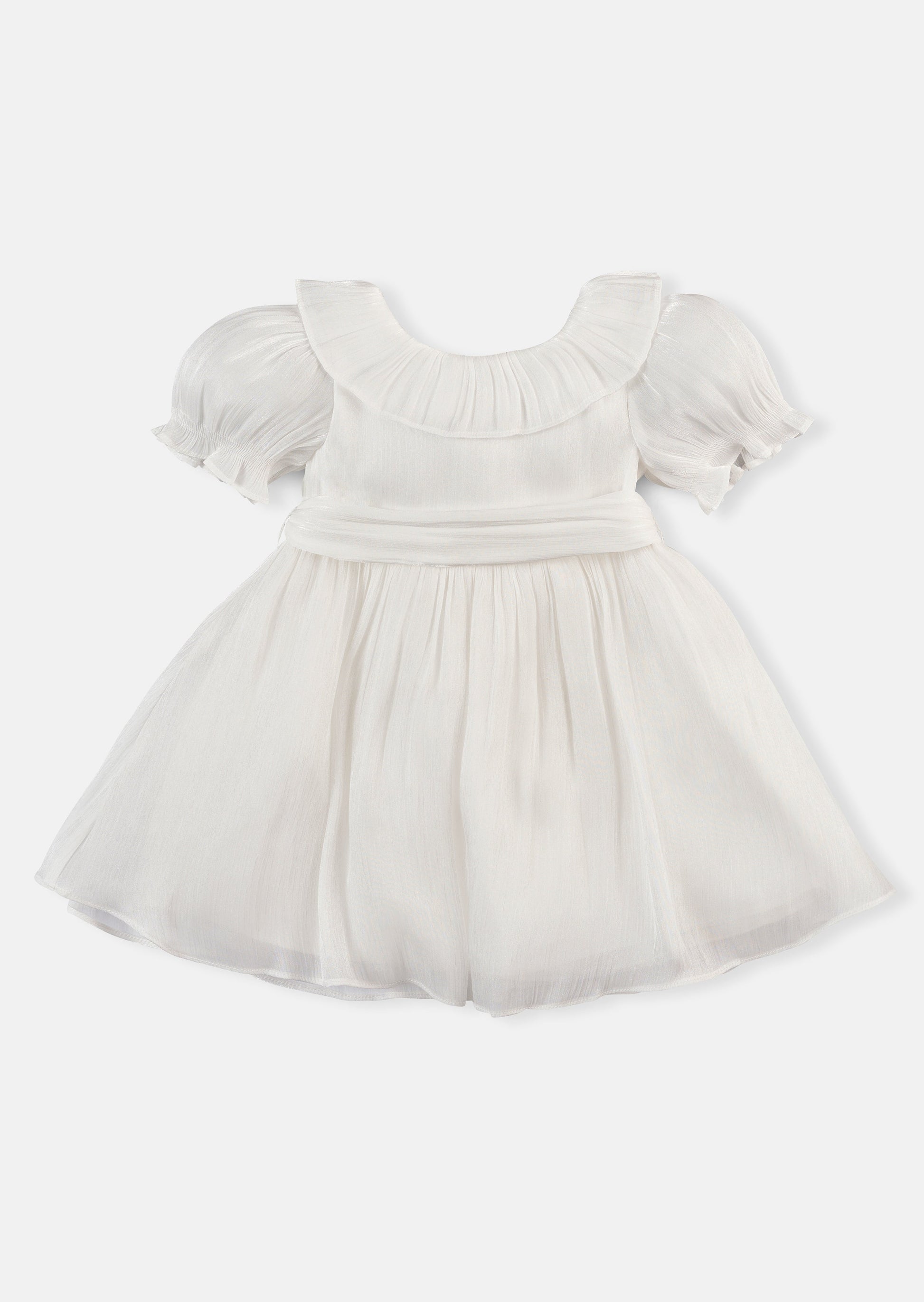Get ready for a heart melt as we introduce our new collection of baby flower girl dresses. This beautiful dress in classic ivory shimmer georgette has the sweetest ruffle neckline and puff sleeve with sash and matching bloomer it is the perfect flower girl choice. Warning - may upstage the bride!