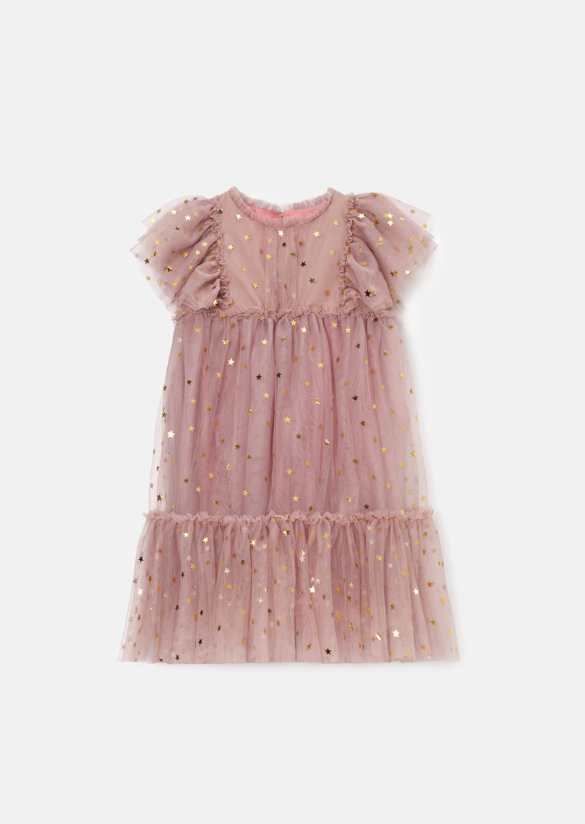 Cue flashbulbs. You will shine like a star in our stunning new dress. Layers of soft mesh cut into a tiered silhouette with exaggerated sleeves and scattered with gold stars. Twinkle-tastic!