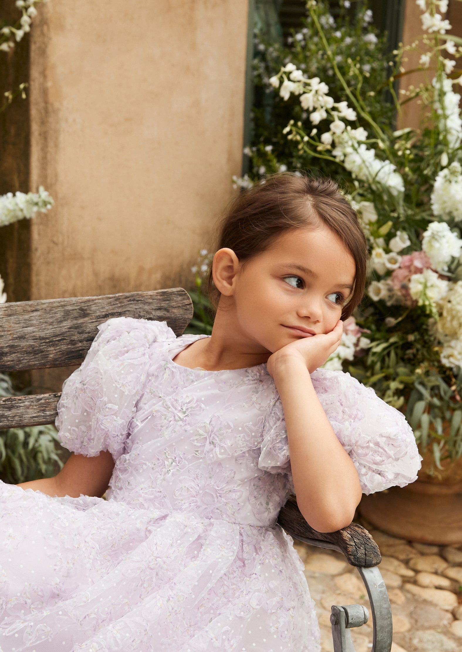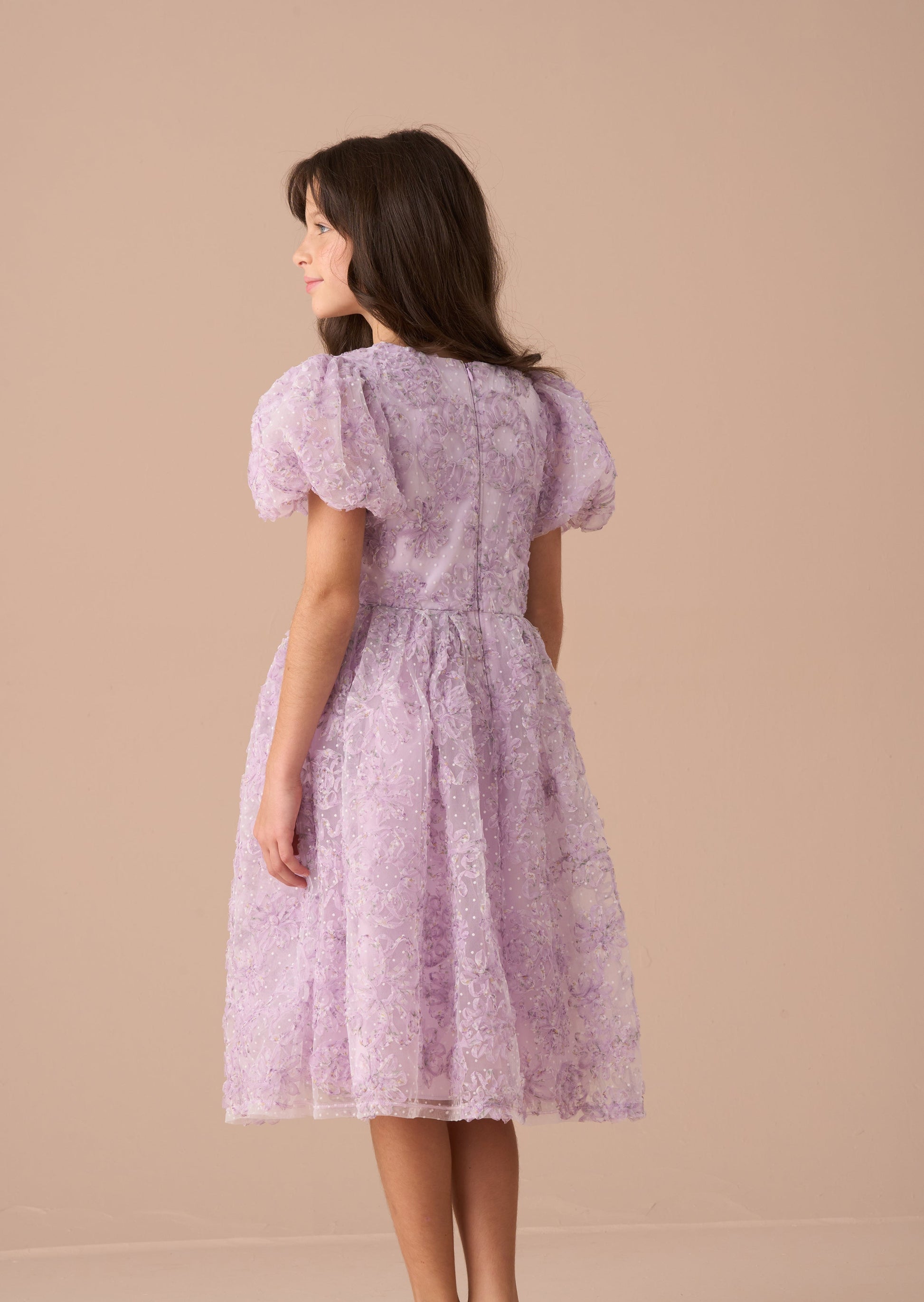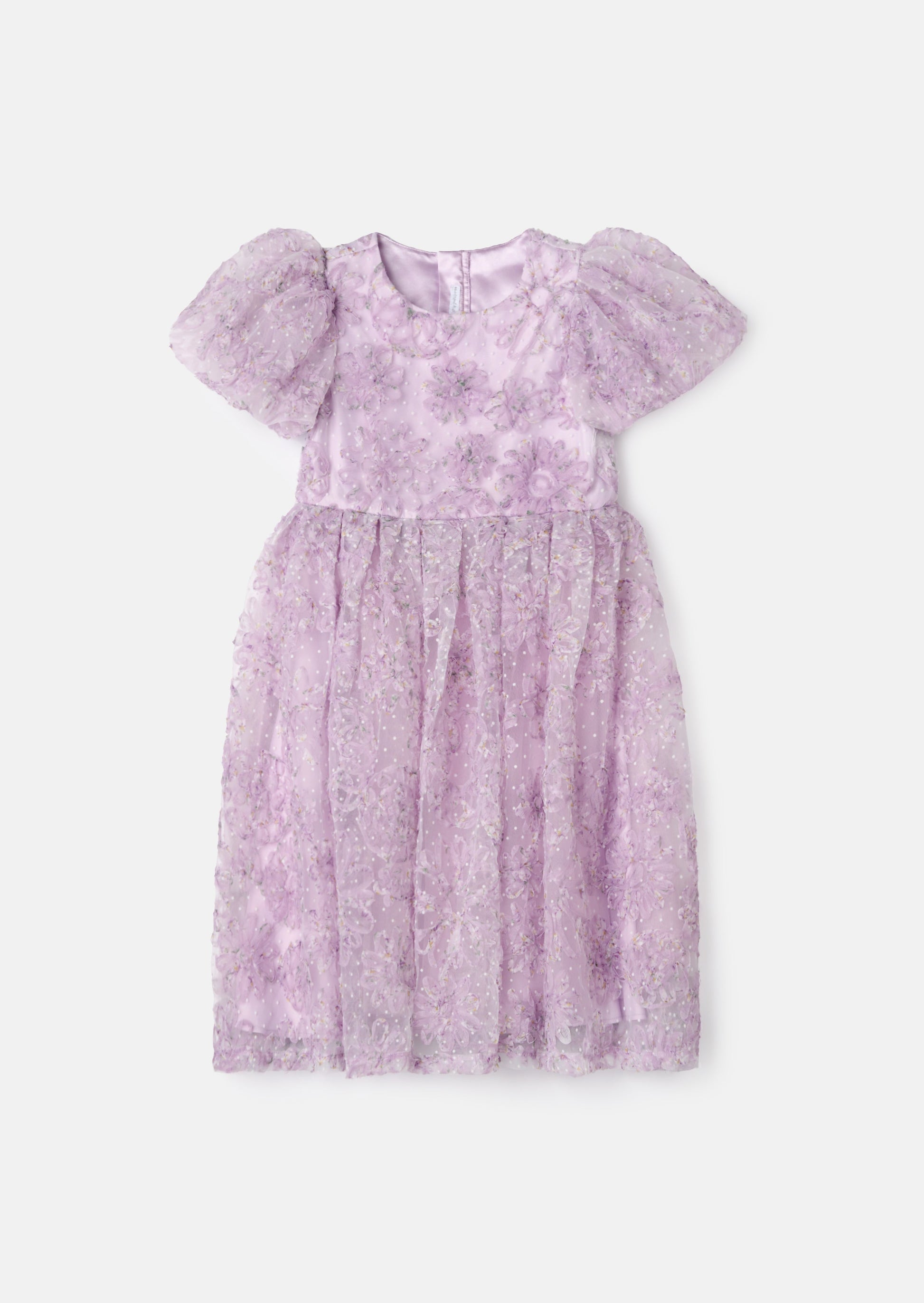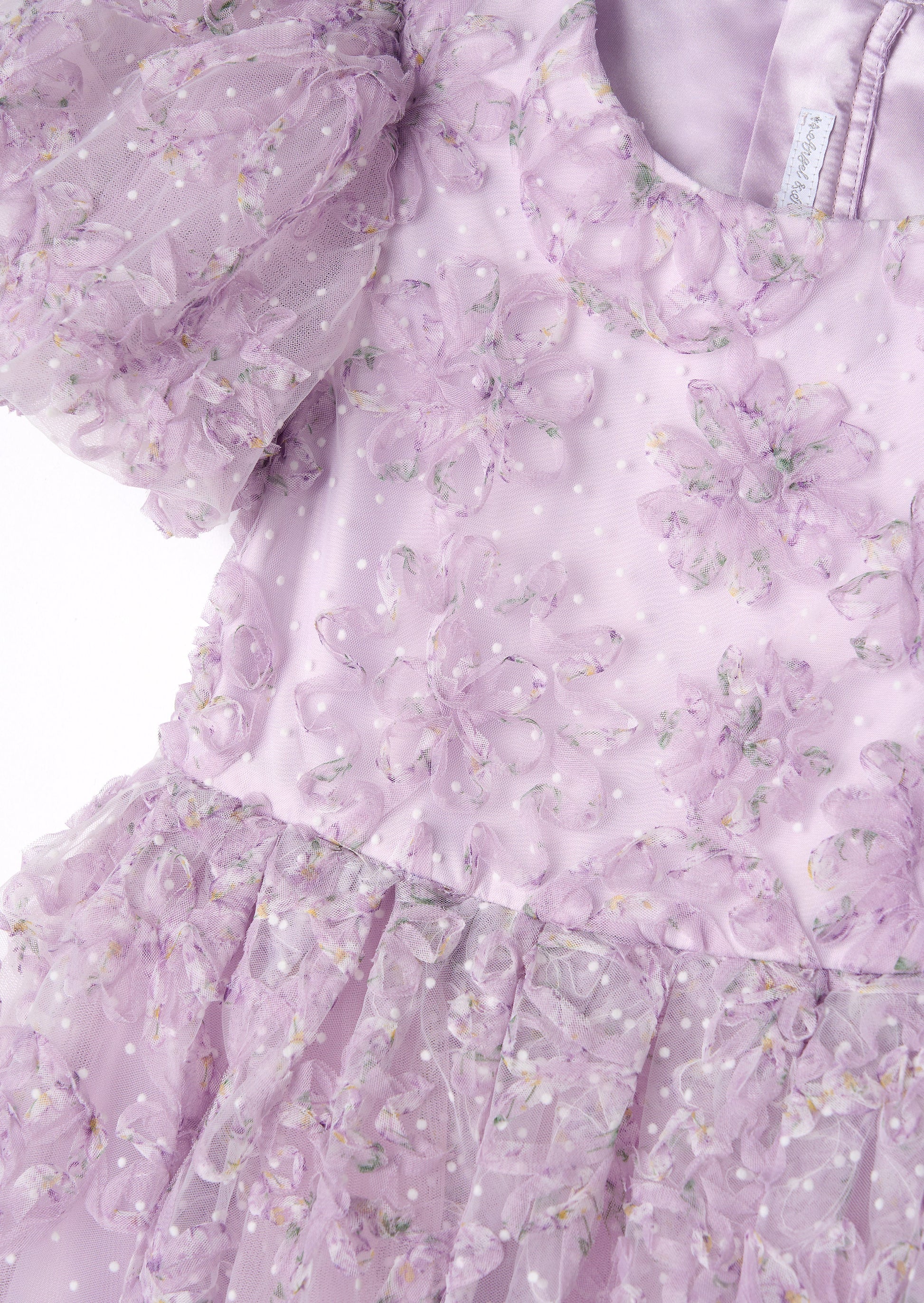 Our new dress is crafted from delicate mesh which provides a subtle sheerness and allure. The standout feature is the intricate embroidery which adorns the mesh with an ornate floral design in sumptuous purple hues. The puff sleeve adds an elegant touch to this simply beautiful silhouette.