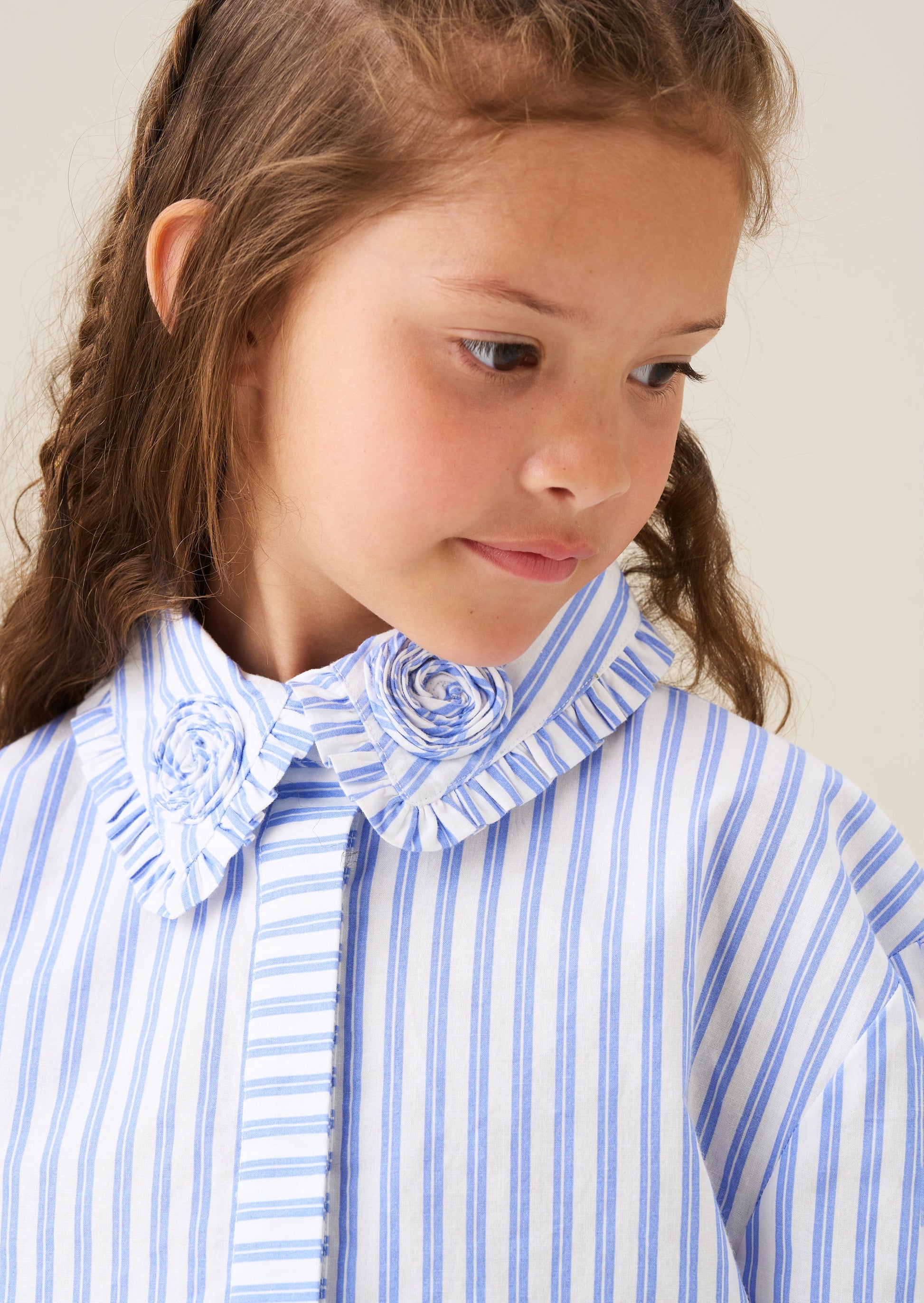 Classic, smart, and casual - this striped cotton shirt can really do it all! The sweet corsages on the collar are the perfect finishing touch.