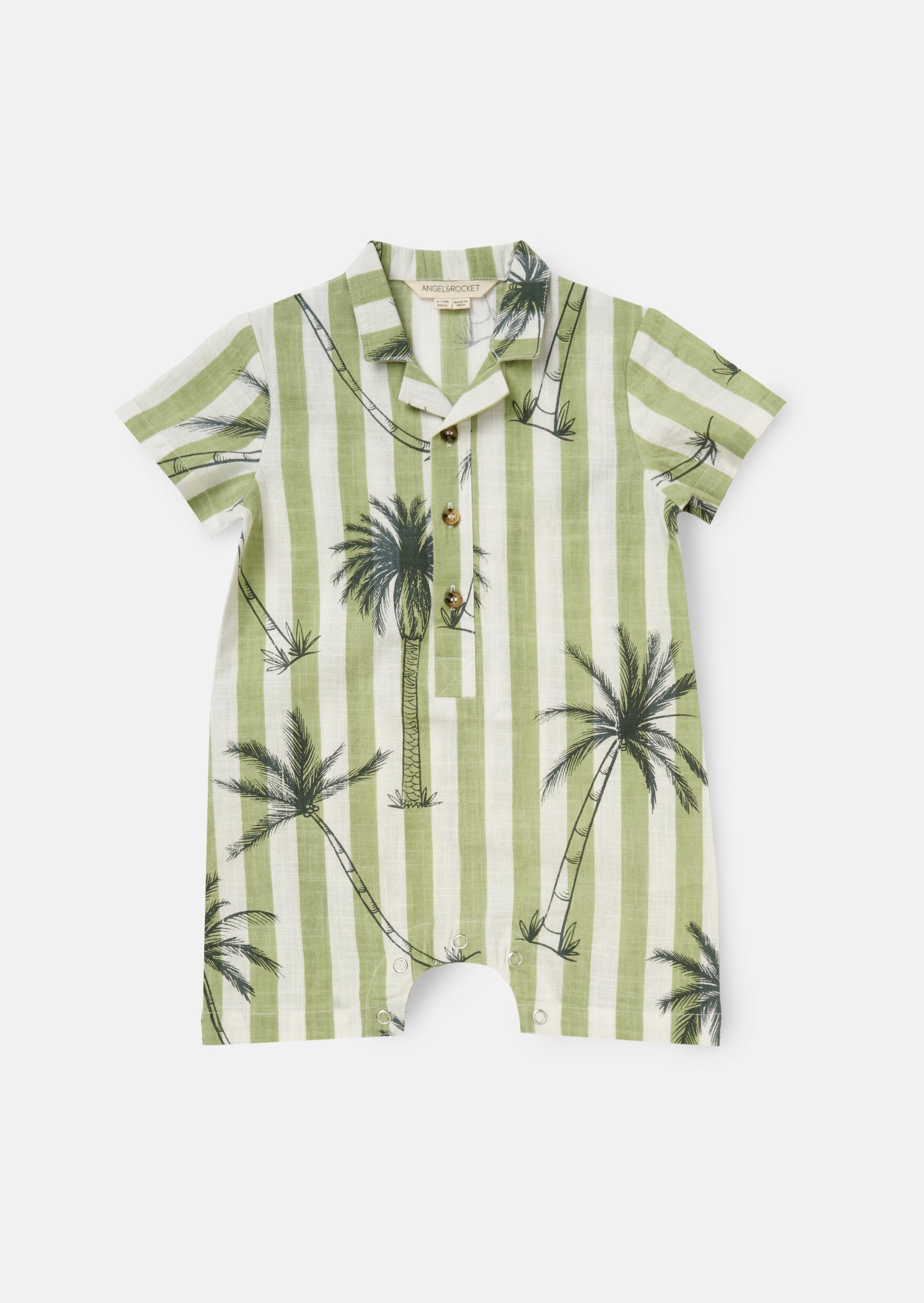 Palm-azing! This lightweight cotton romper features a playful stripe and palm tree print, perfect for sunny days. With a breezy resort collar, it's ideal for keeping your little one cool and stylish. Pair with our big brother shirt or big sister sundress for a perfectly coordinated sibling look!
