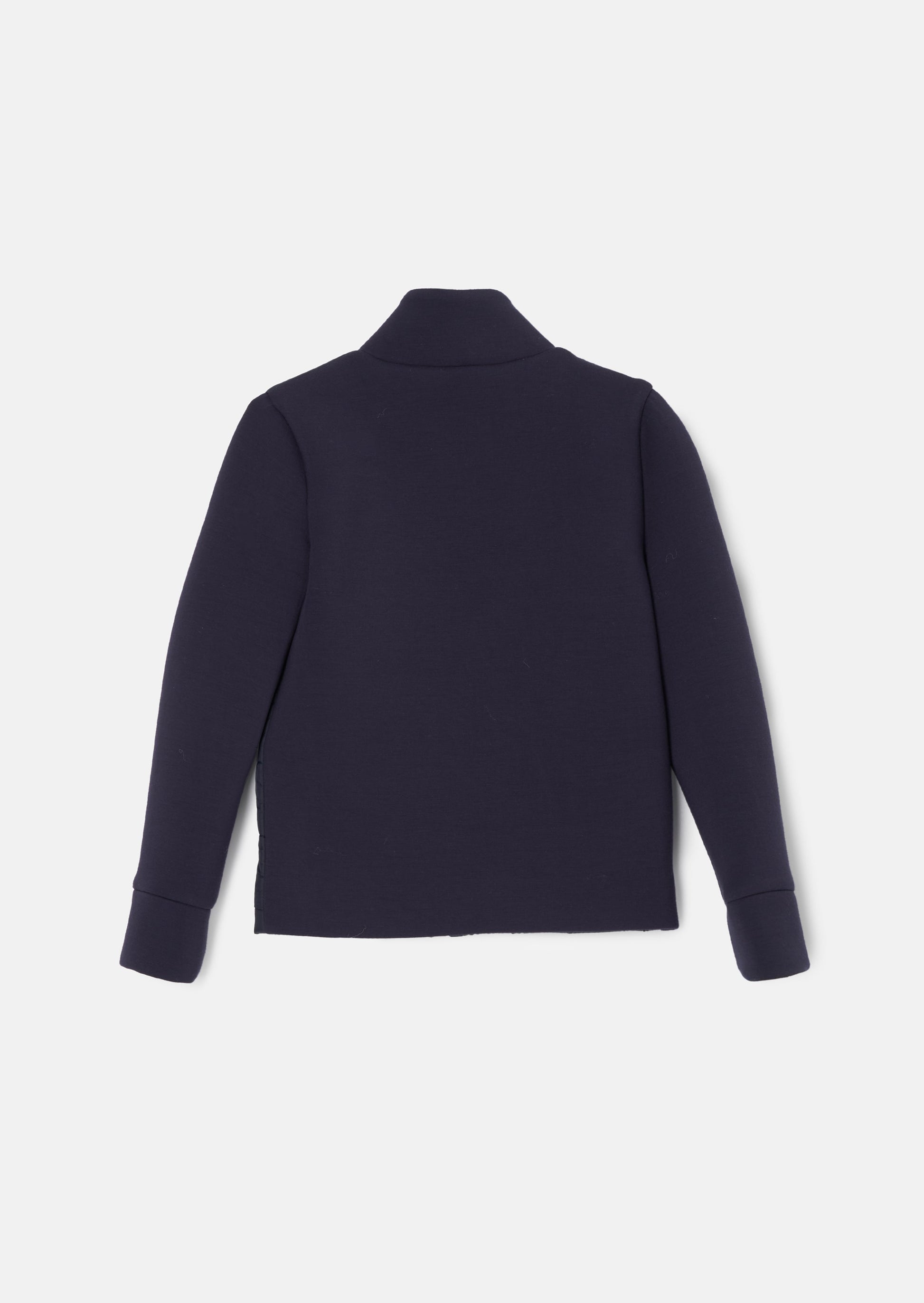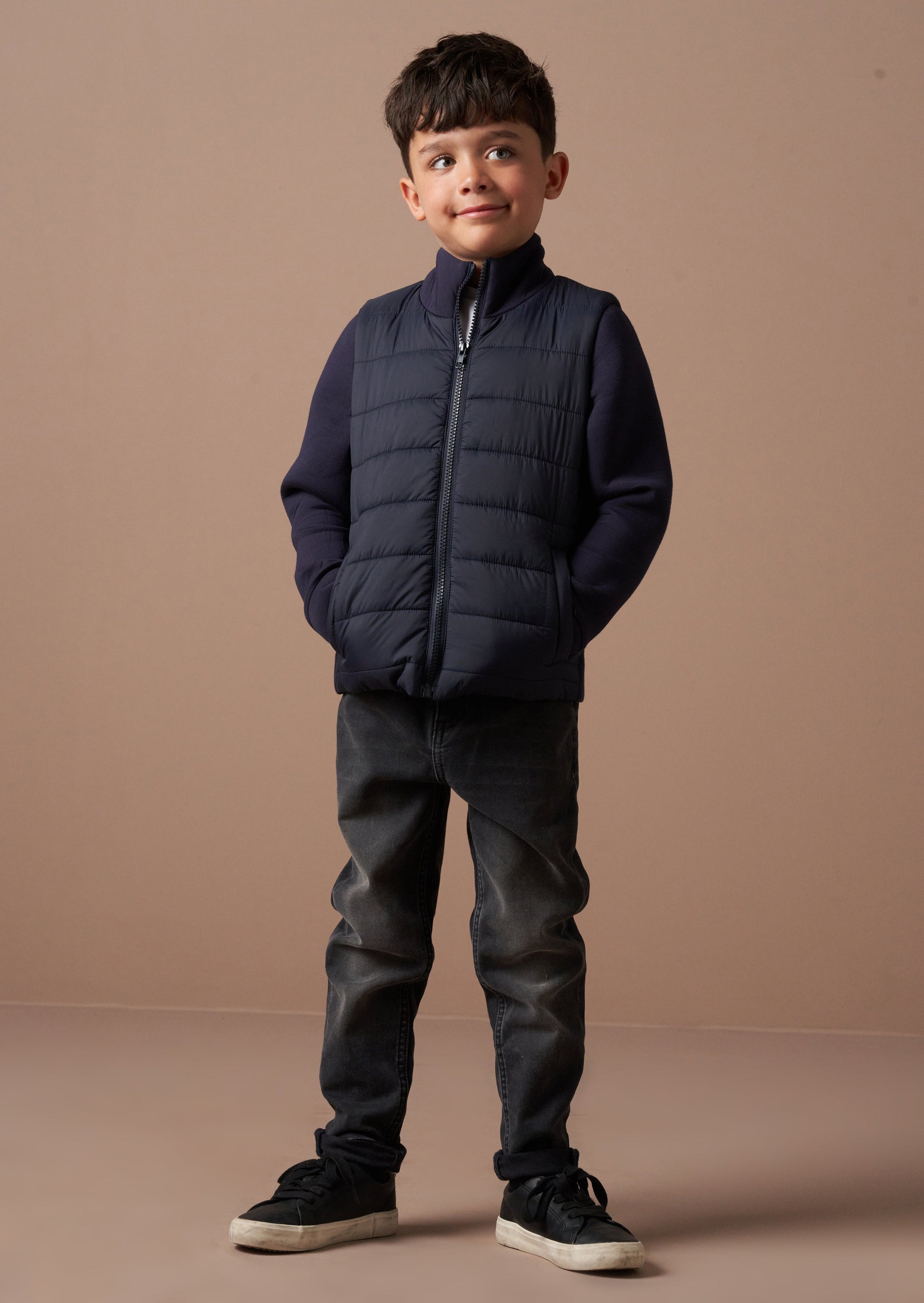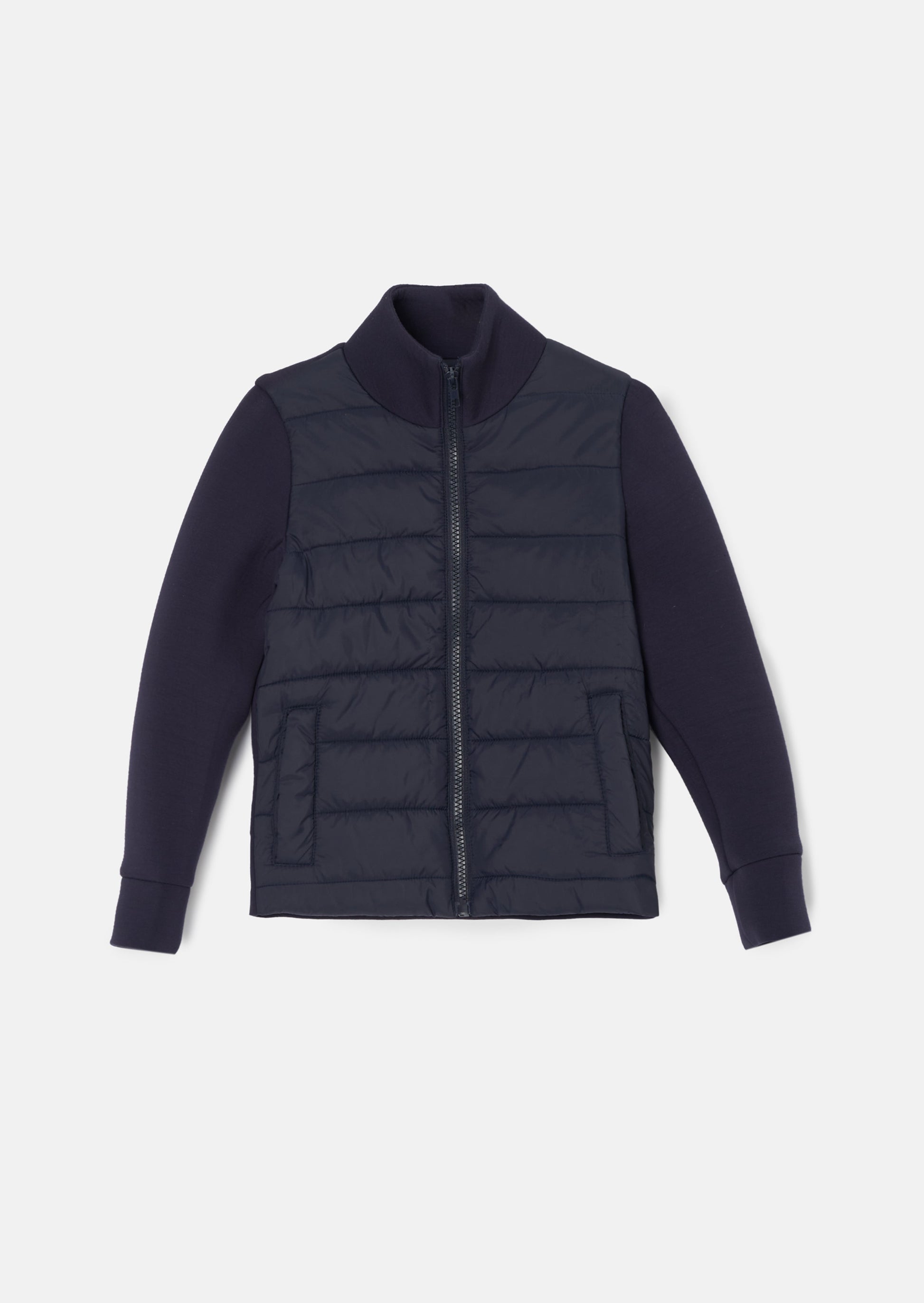 Introducing our quilt-essential navy winter jacket. Crafted from cosy jersey at the neck, sleeves and back and finished with super soft quilted panelling at the front. The new way to do smart.