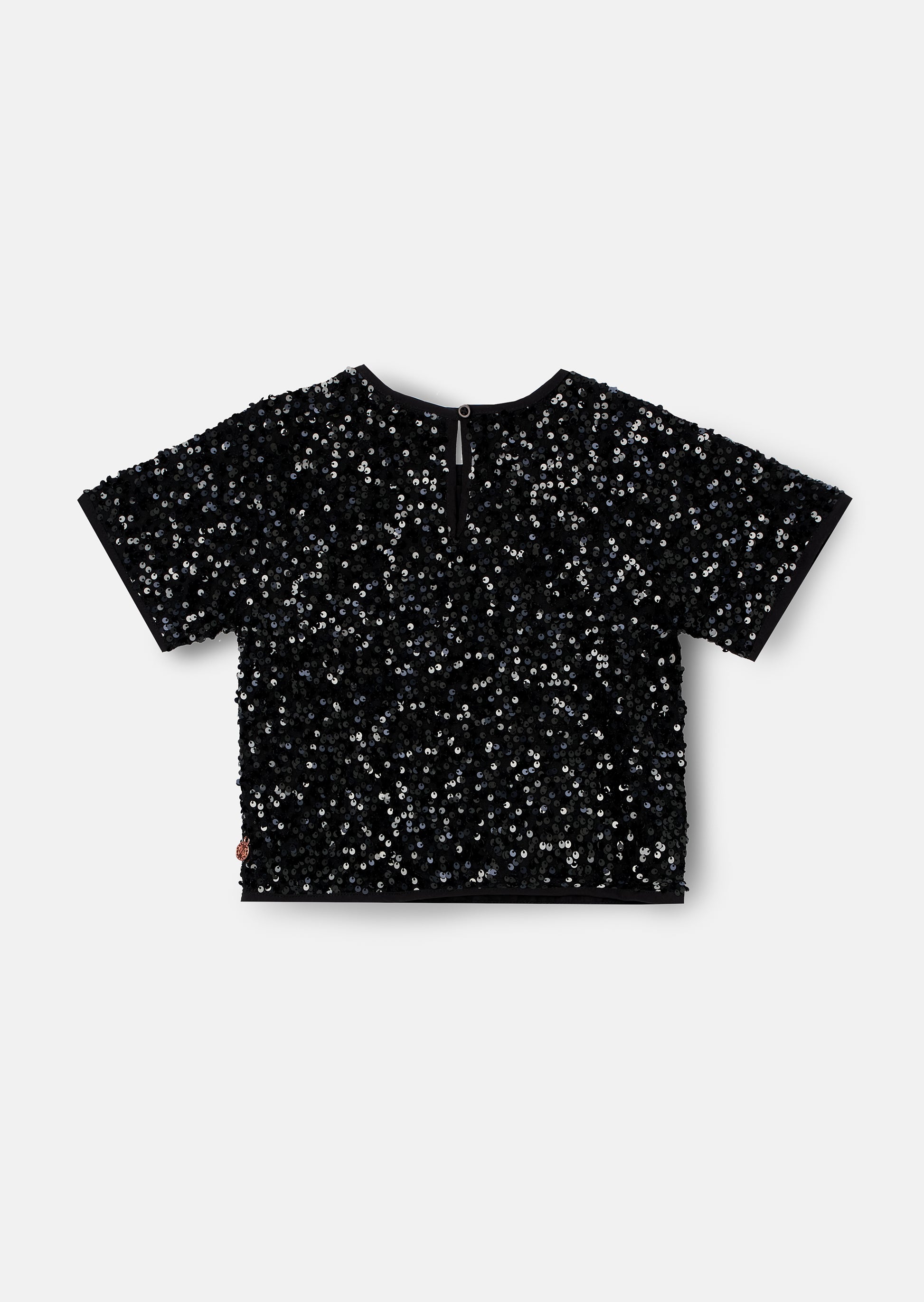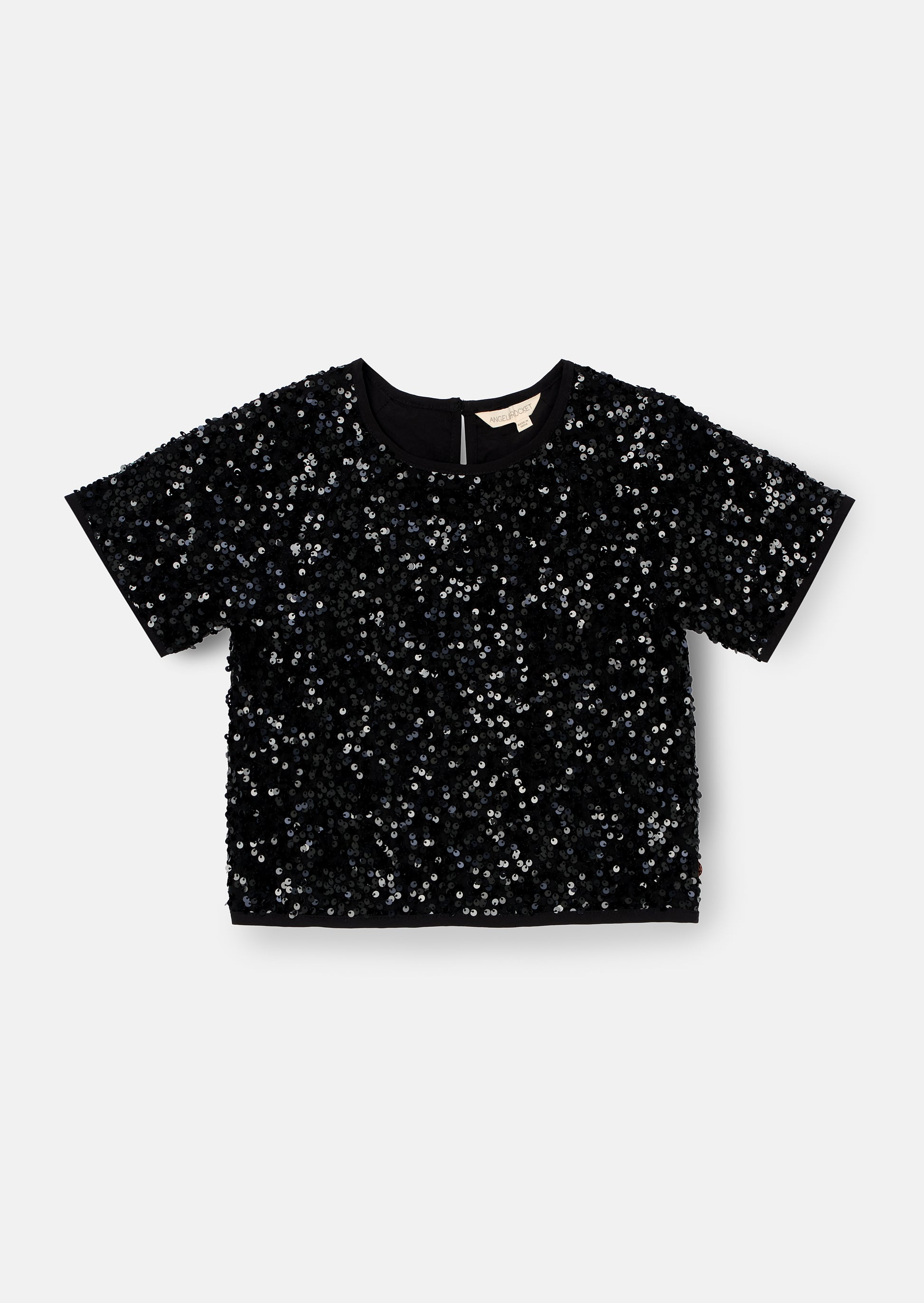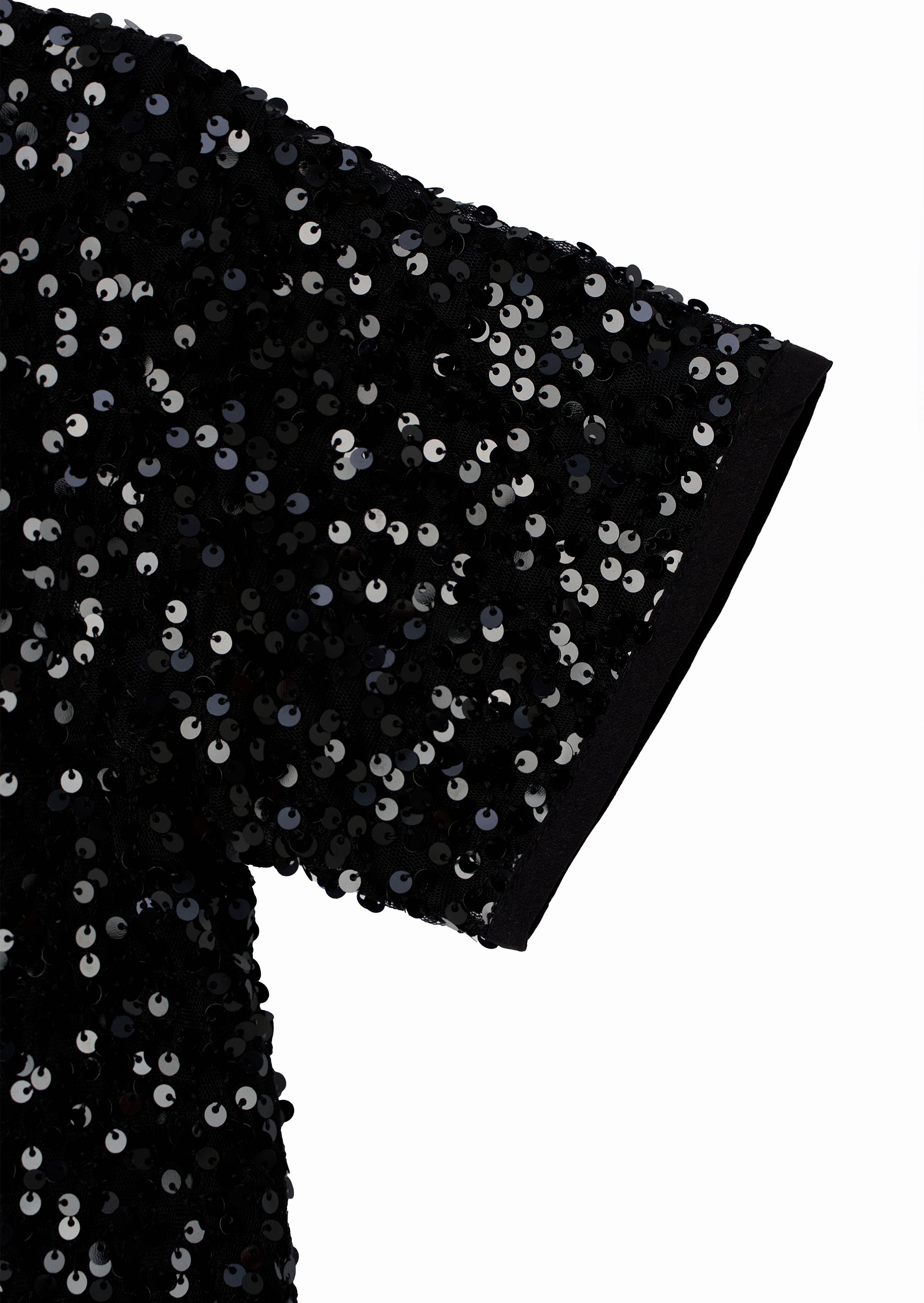 This dazzling black sequin top is made for the spotlight, with all-over shimmer and a relaxed fit that's perfect for dancing and twirling. Pair it the matching trousers or shorts—because you can never have too much sparkle!