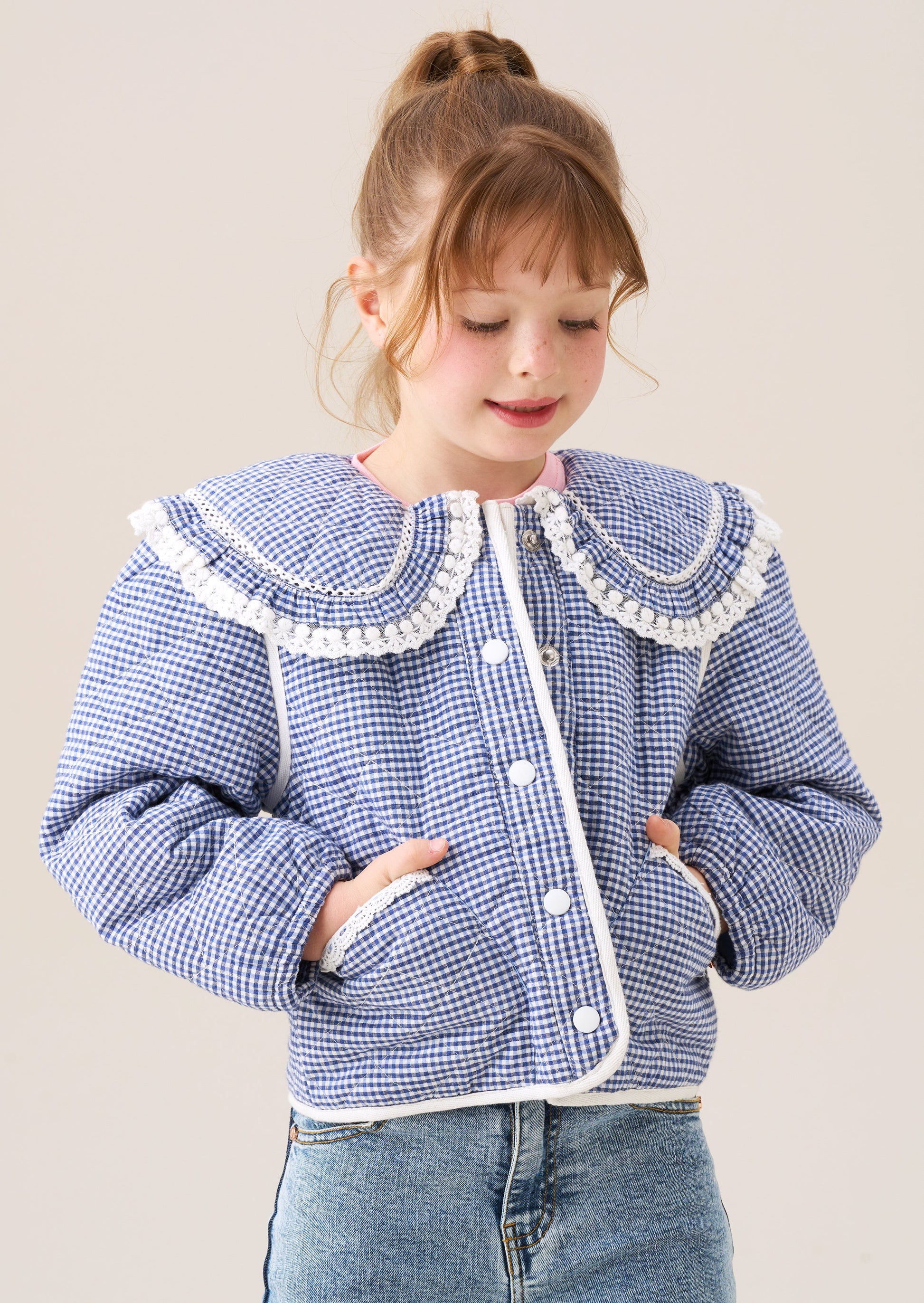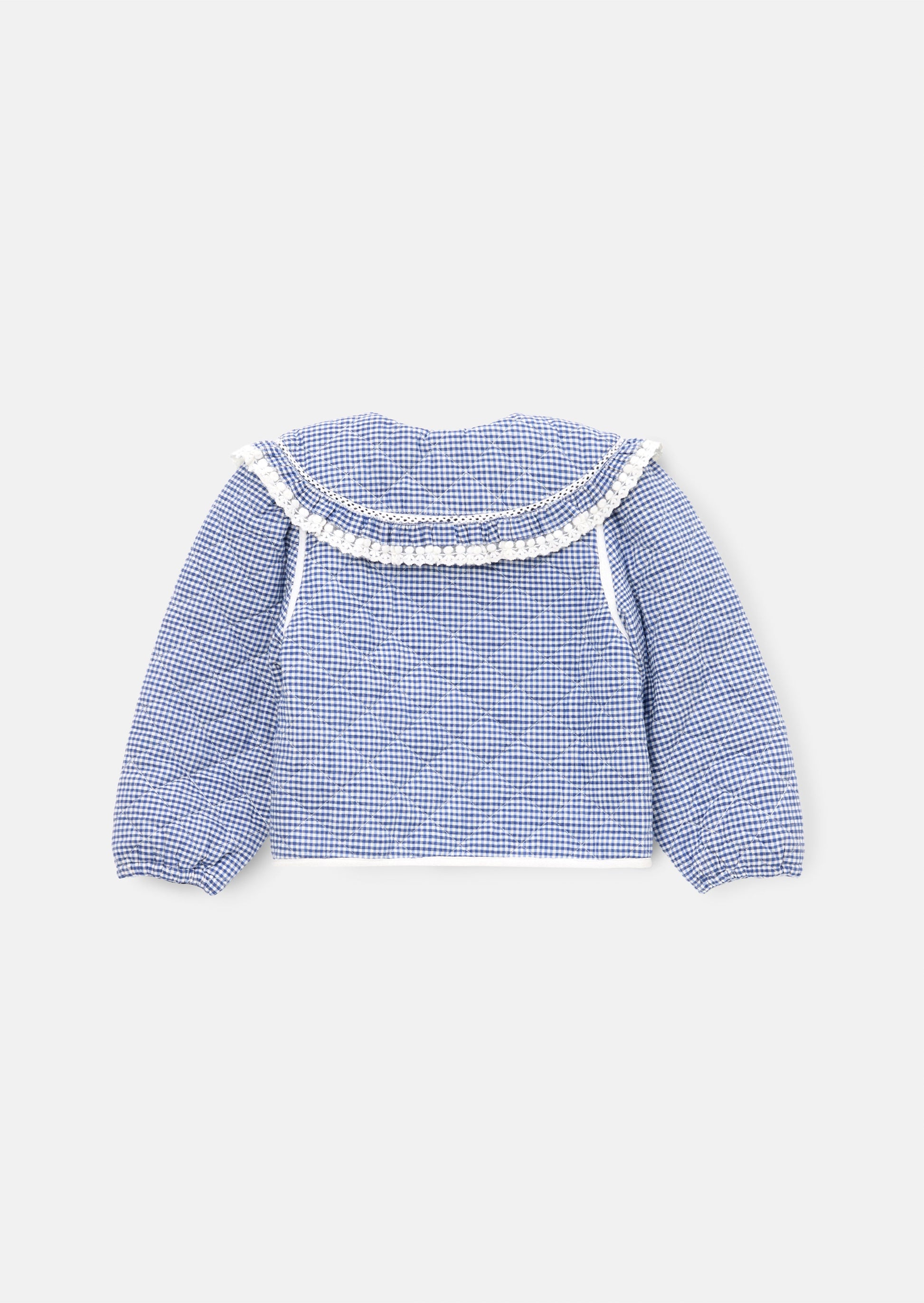 Layer up in style in our new quilted jacket! Crafted in fresh white and blue gingham with smart piping to elevate the look and easy popper opening for fuss-free dressing. The standout feature is the oversized collar with delicate embroidery and frills, adding oodles of charm and character.