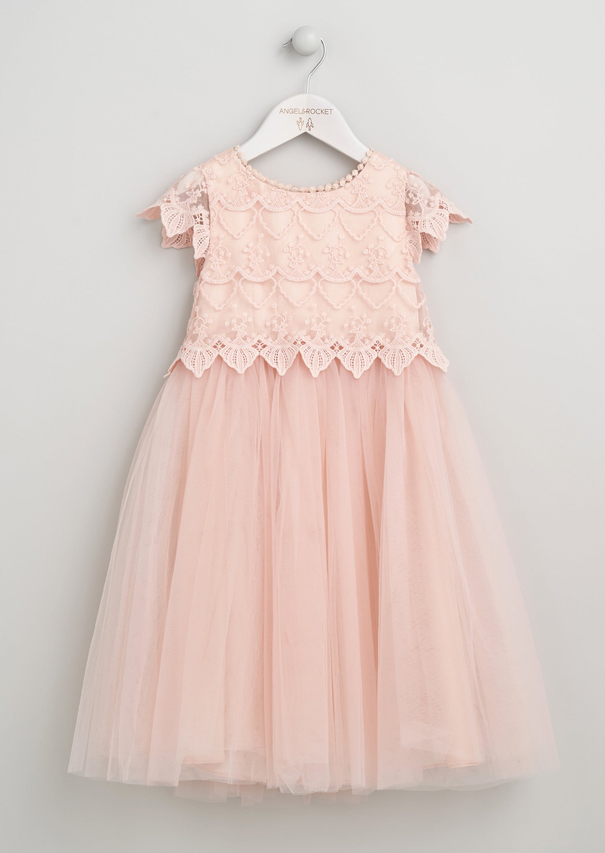 The delicate scalloped lace bodice creates a petal effect at the waistline. The layers of soft tulle and petticoats bring volume to the sumptuous soft skirt.