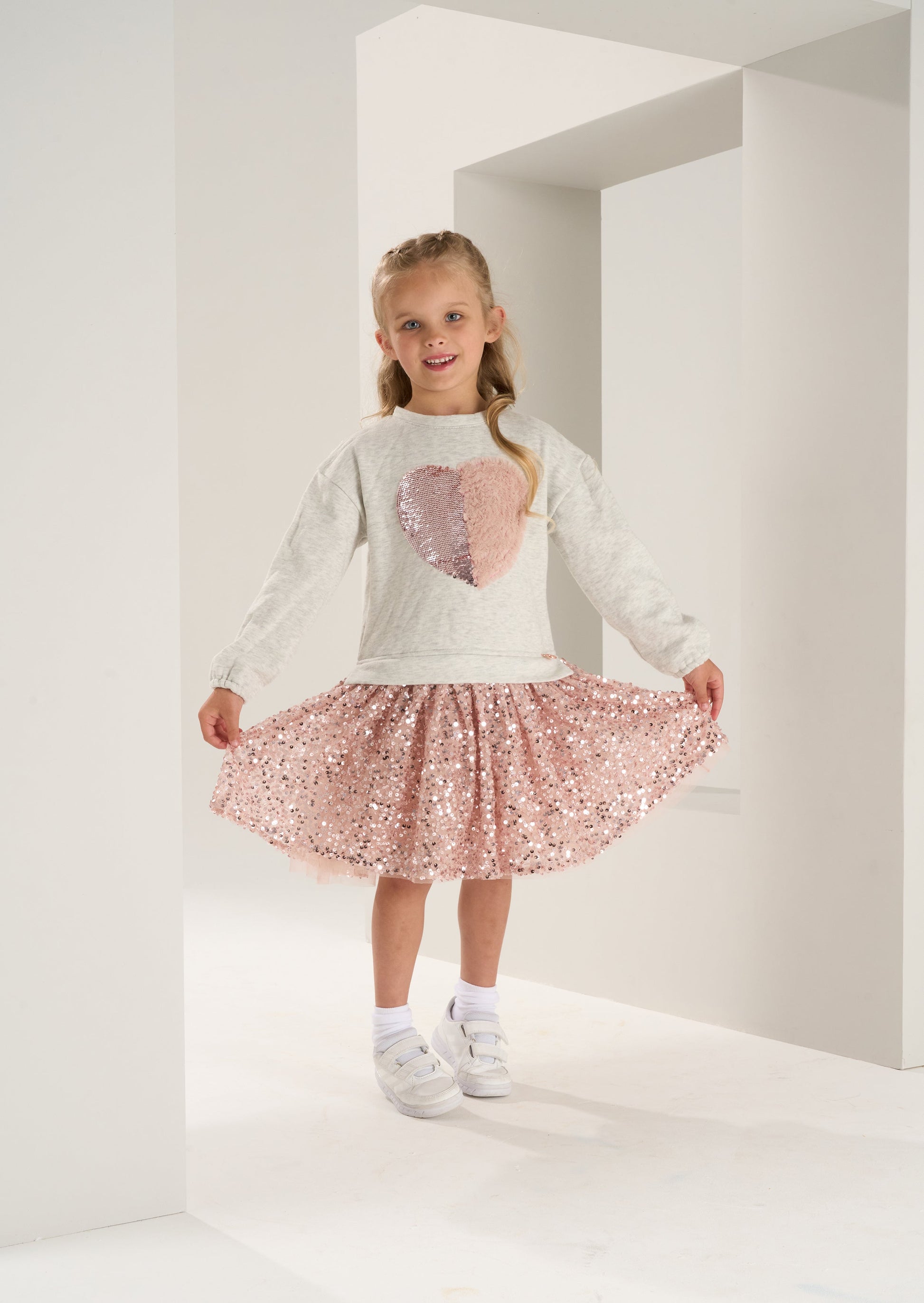 Is it a sweatshirt, is it a dress?… it's both! and it's fabulous! A soft cotton sweat top with embellished 3D heart and a fully embellished sequin skirt this dress is a perfect hybrid of smart casual.