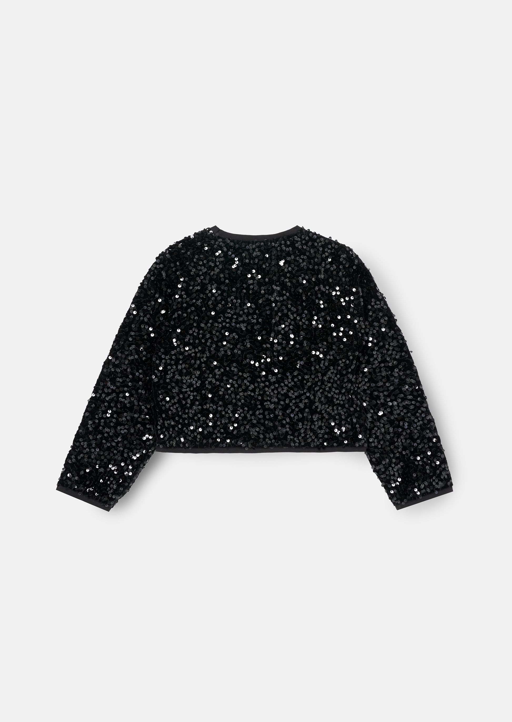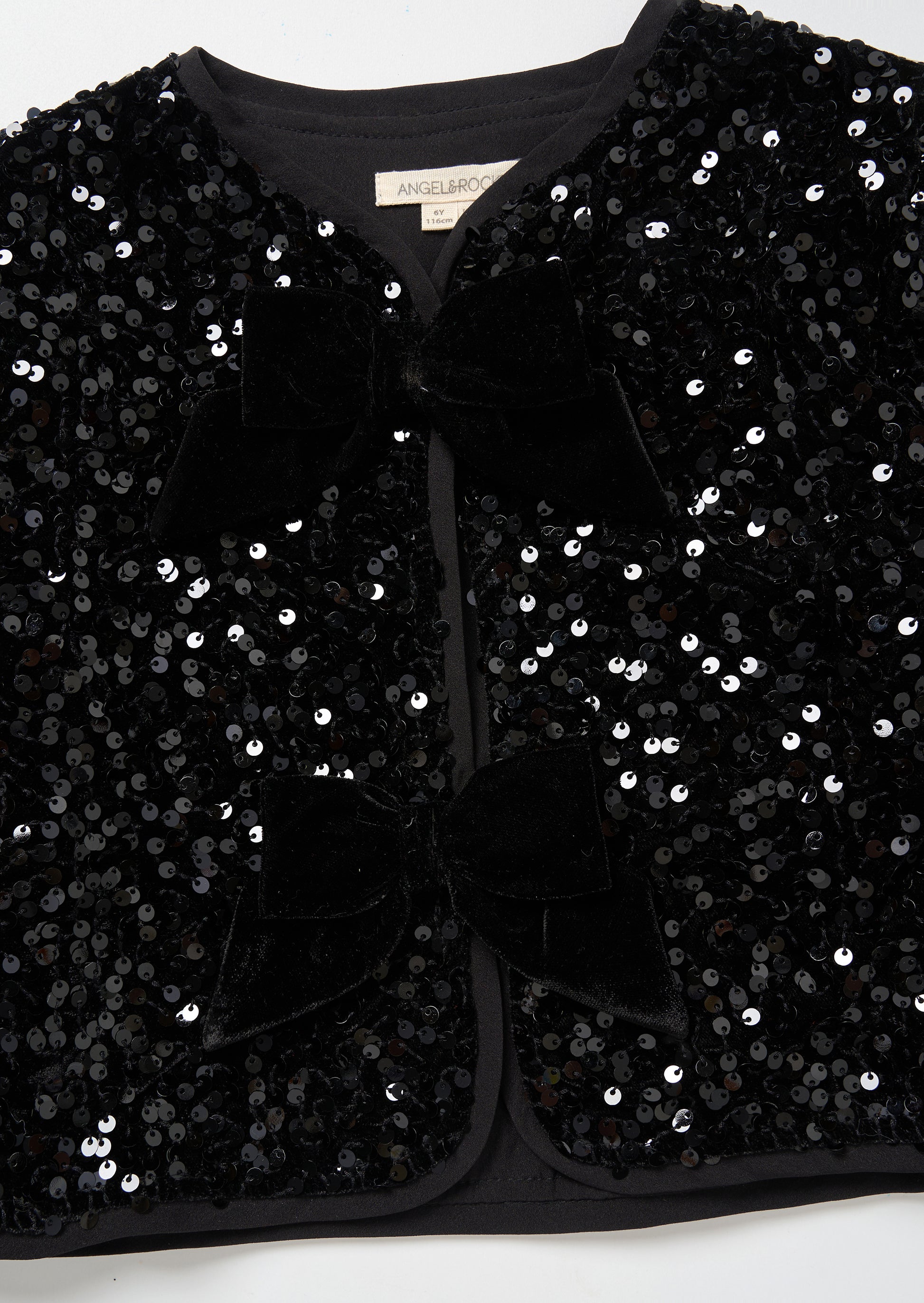 This dazzling black velvet jacket is decked out in all-over sequins and finished with two statement velvet bows for extra drama. The cropped silhouette makes it perfect for layering over party looks. Pair with the matching shorts or trousers for a head-to-toe sparkle moment.