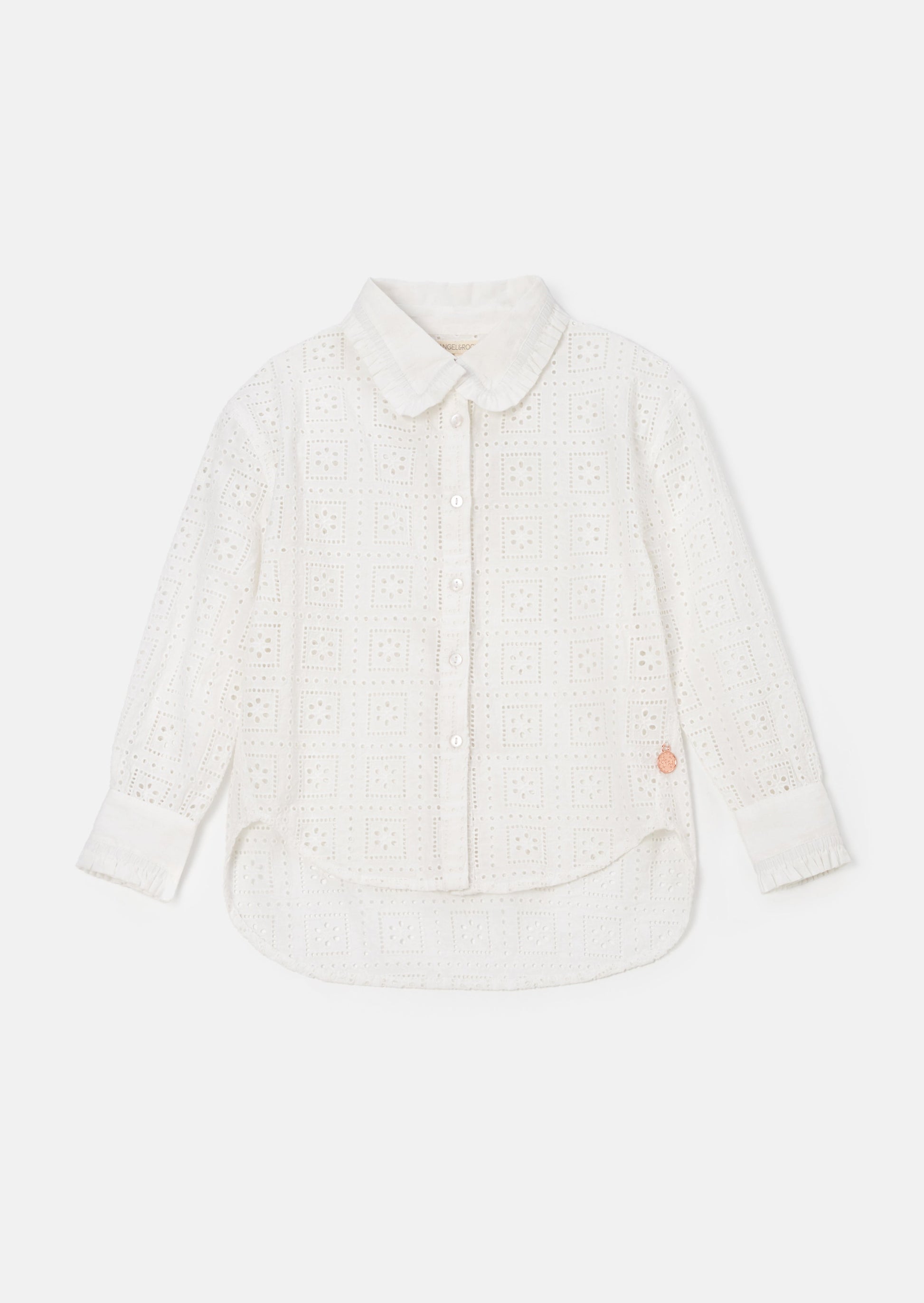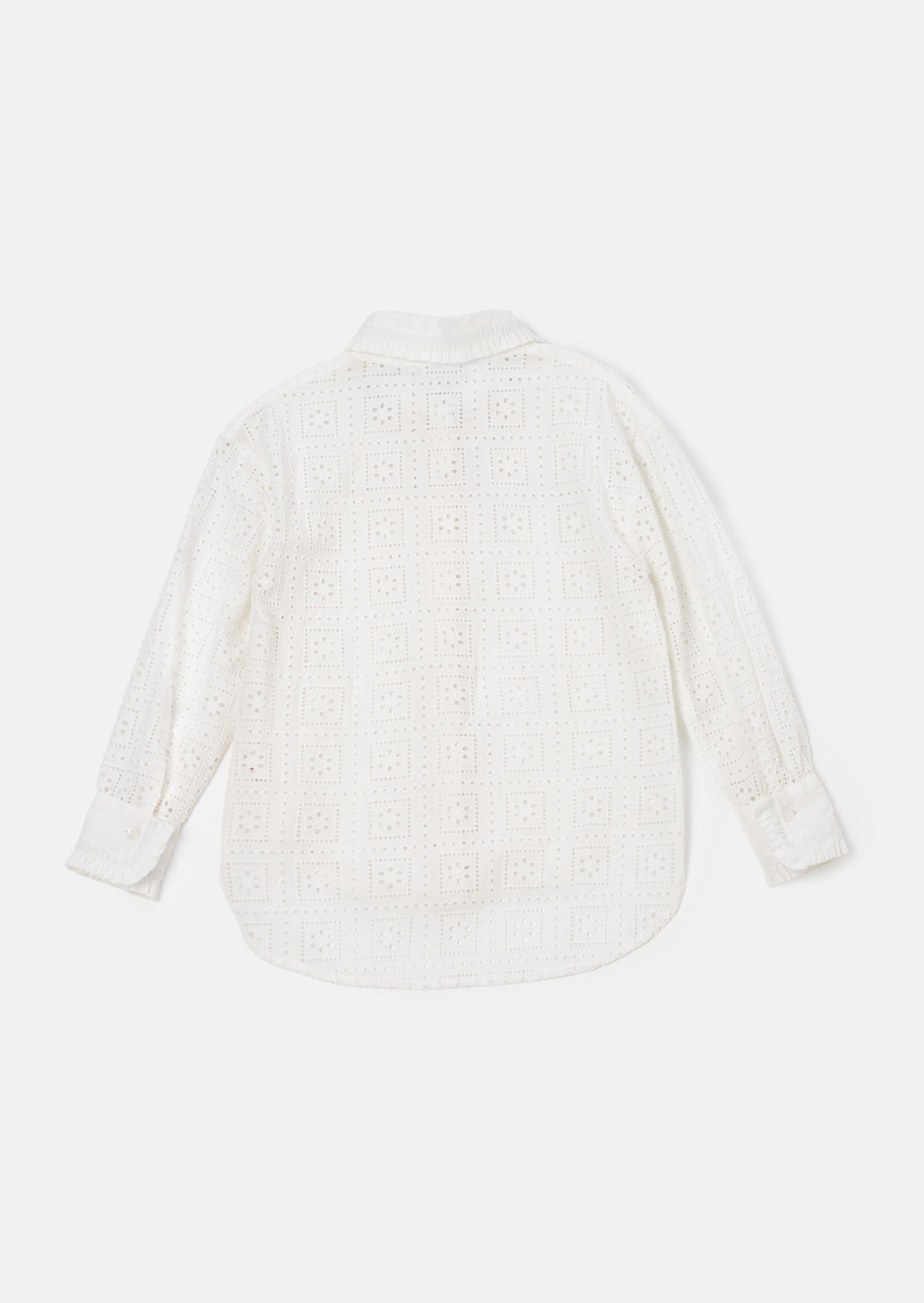 Our new Marcella shirt is defined by its all-over square broderie. With a high low hem, long sleeve and ruffle trim collar and cuffs, pair with our Kendal jean for outfit perfection.