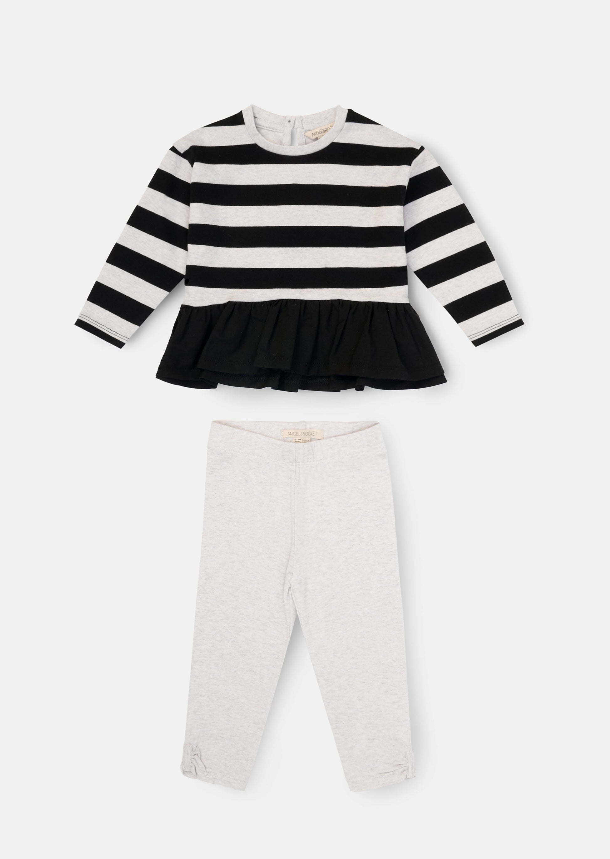 Channel Parisian vibes in our super-soft stripe peplum top! With gathered woven peplum detail, it's perfectly outfitted with a super-soft legging finished at the hem with delicate little bows! Merci!