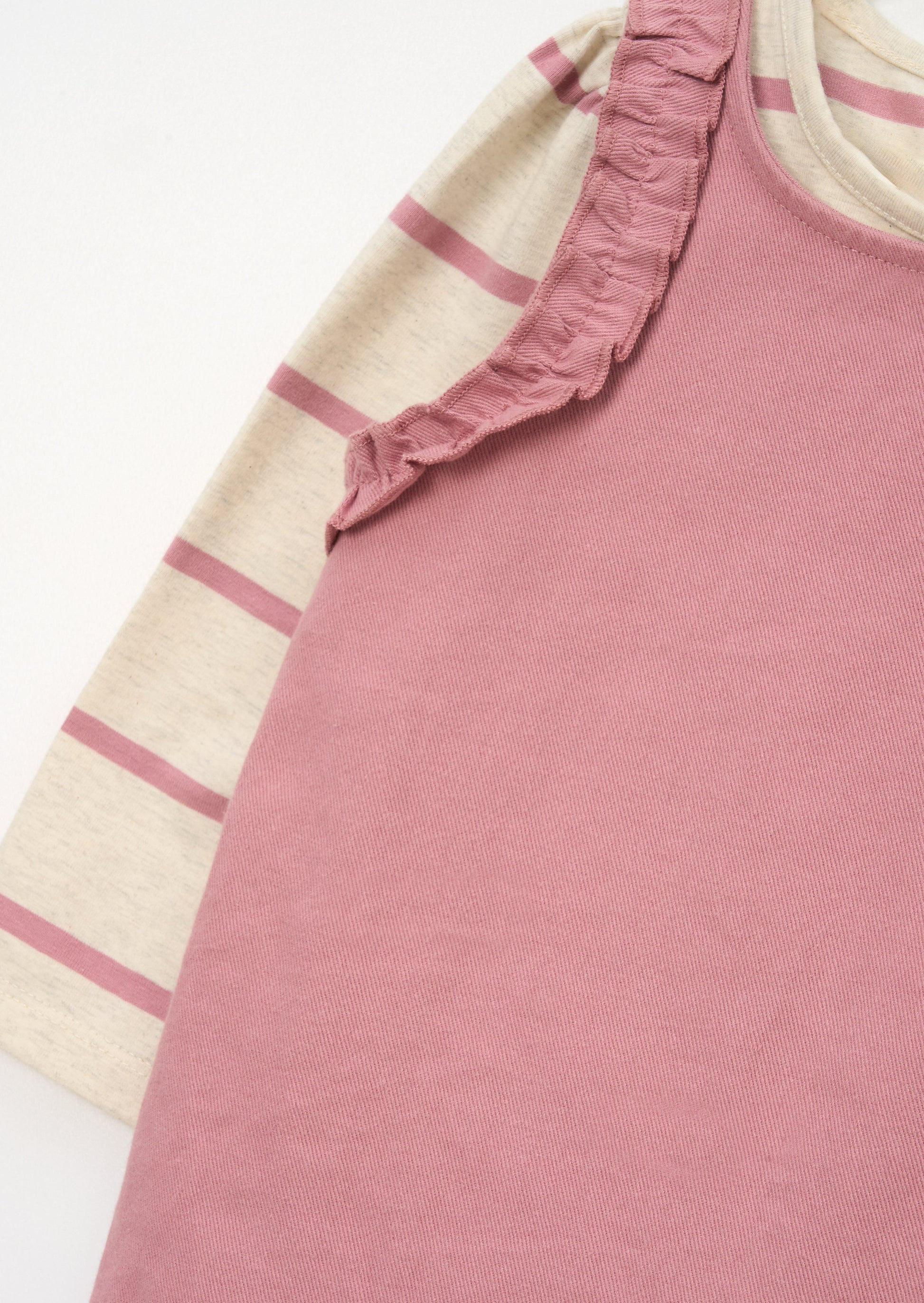 We've found the perfect outfit for tiny tots! This adorable pink twill dungaree set features sweet frill straps and comes ready-styled with a soft striped top to complete the outfit... Awww!
