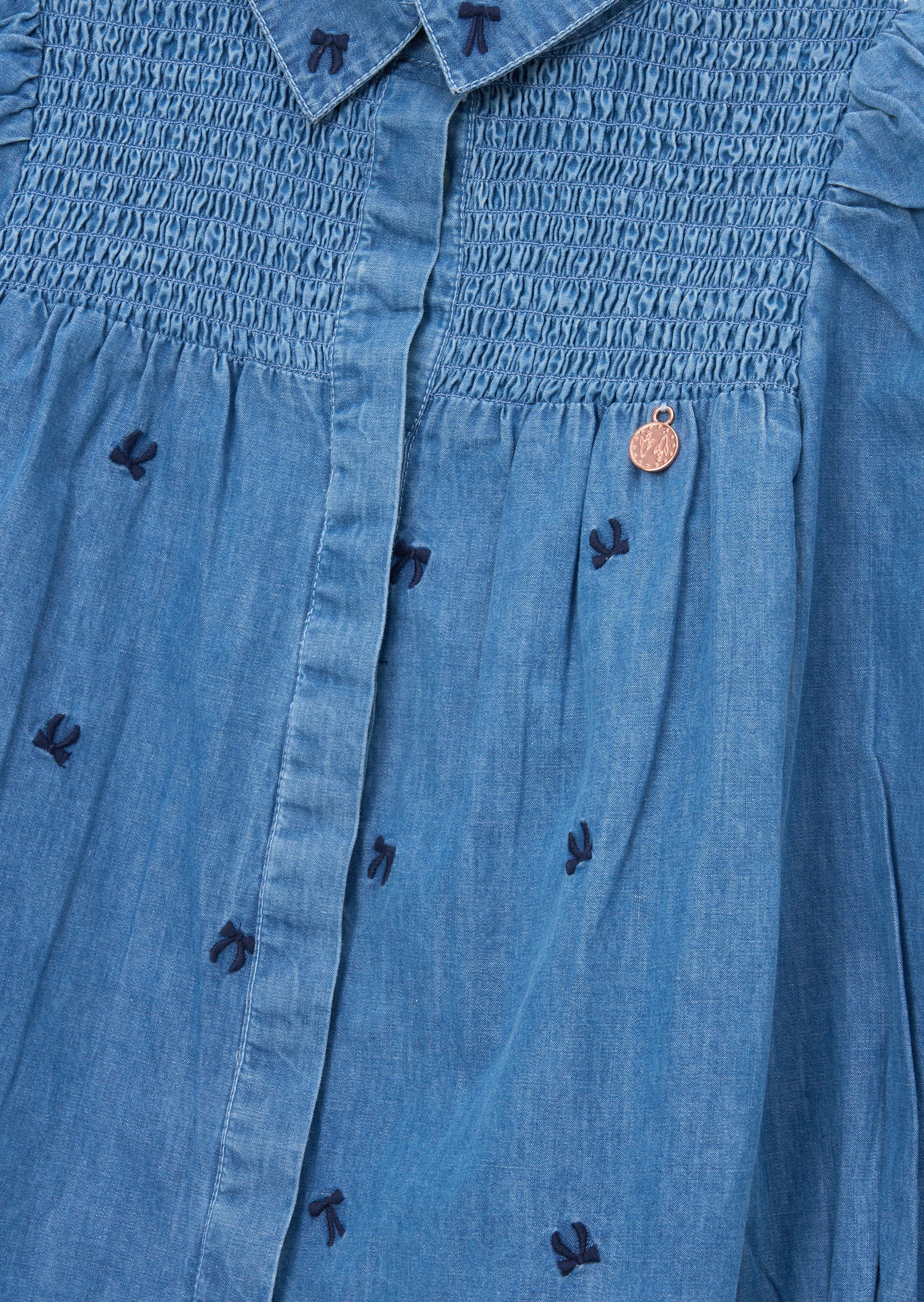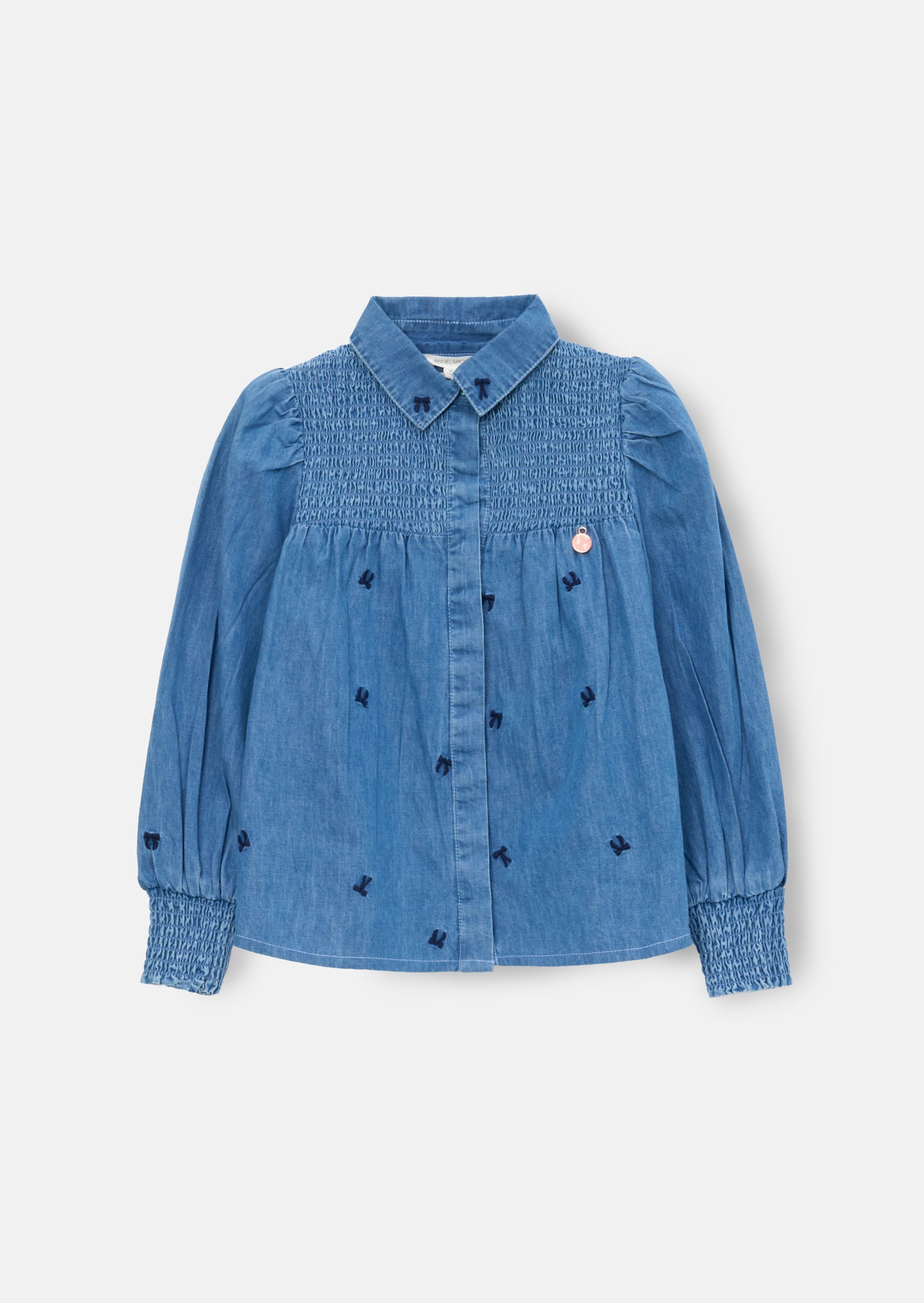 Simply BOW-tiful! This pretty embroidered denim shirt is full of charm, with mini embroidered bows scattered all over. Shirred details at the yoke and cuffs, along with a gentle puff sleeve, make it the perfect combo of cute and stylish.