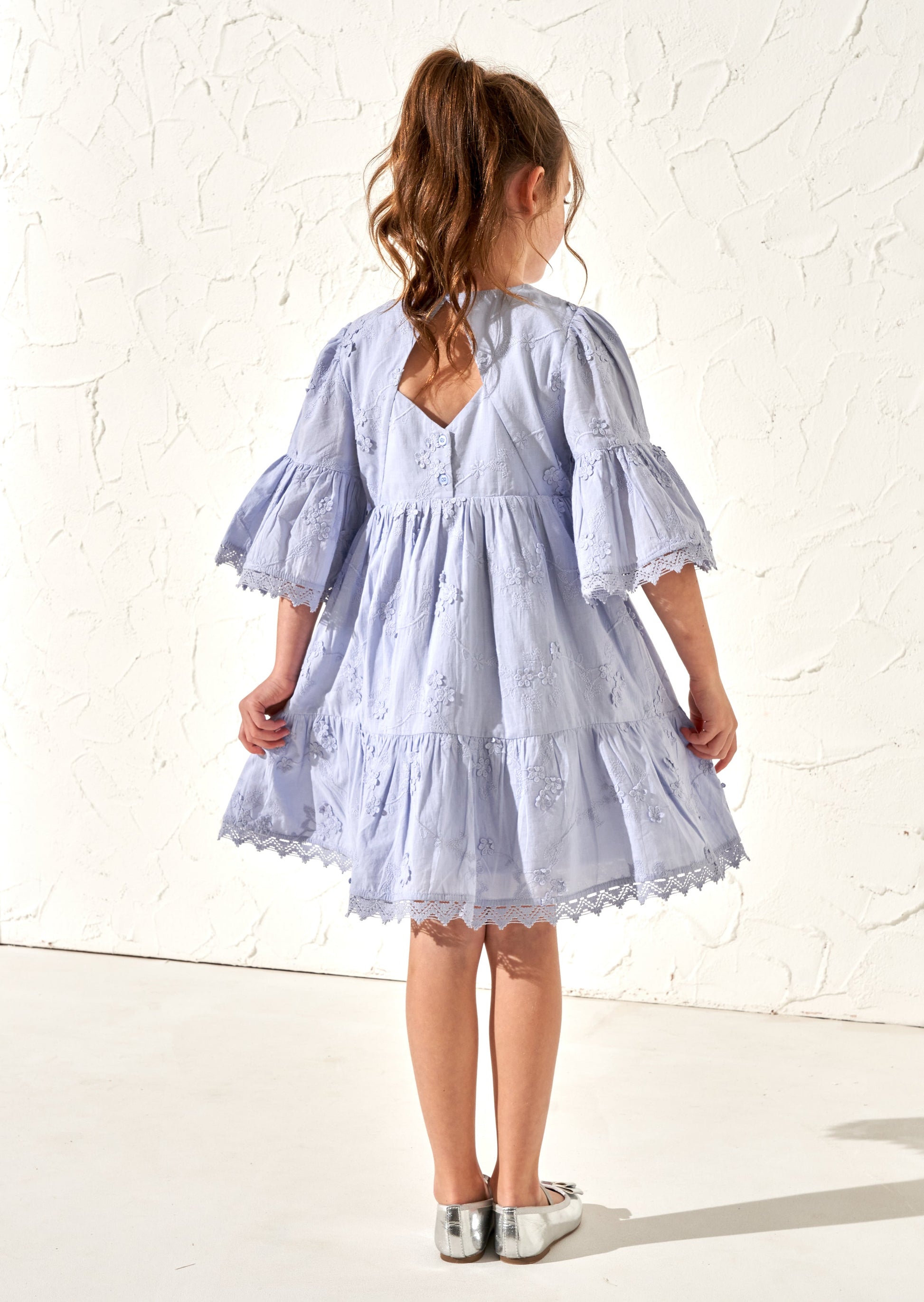 This dress won't leave you feeling blue. Beautiful delicate 3D embroidered flowers on a super soft cotton cut into a tiered silhouette with a captivating angel sleeve finished with a scrumptious lace trim.