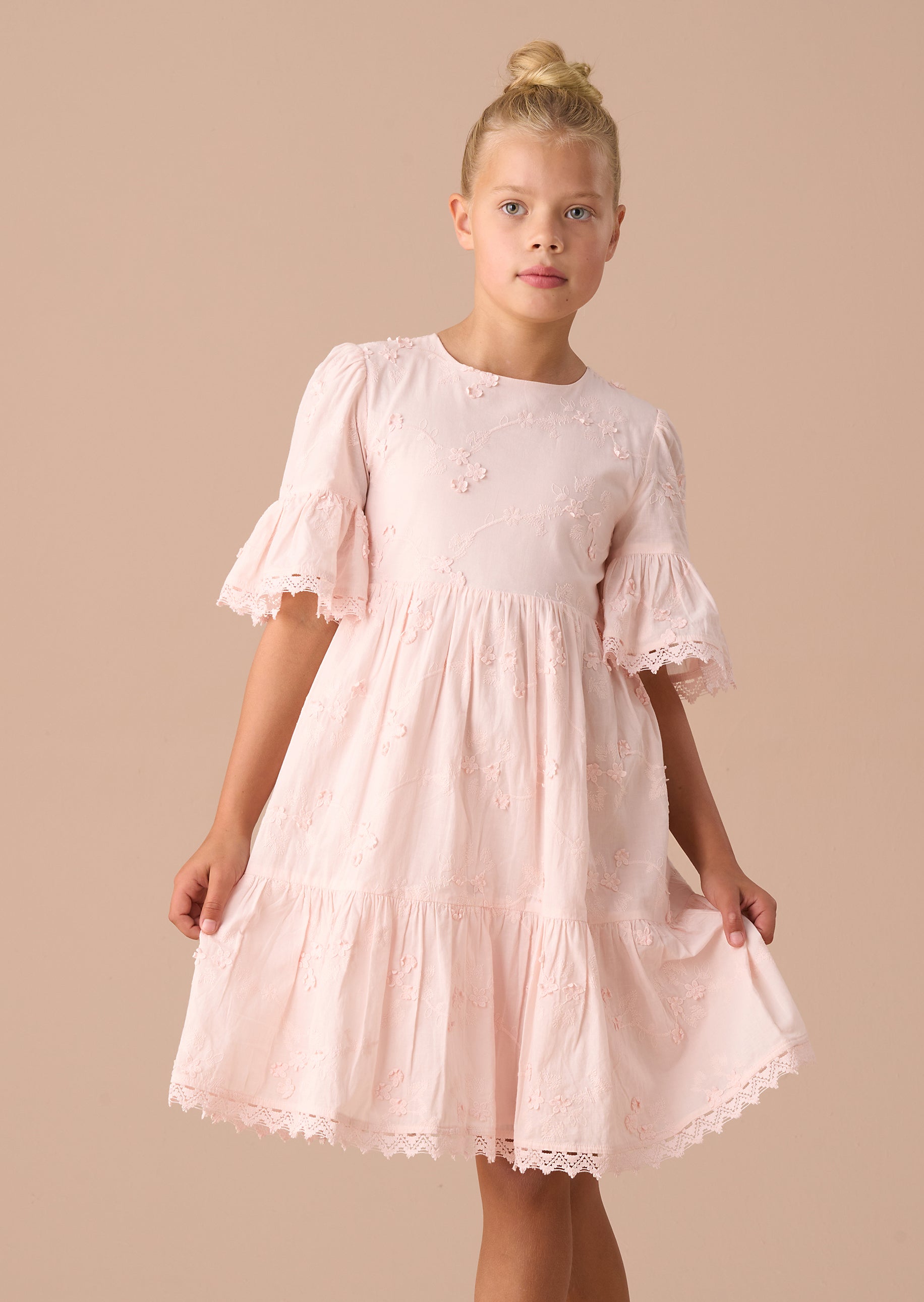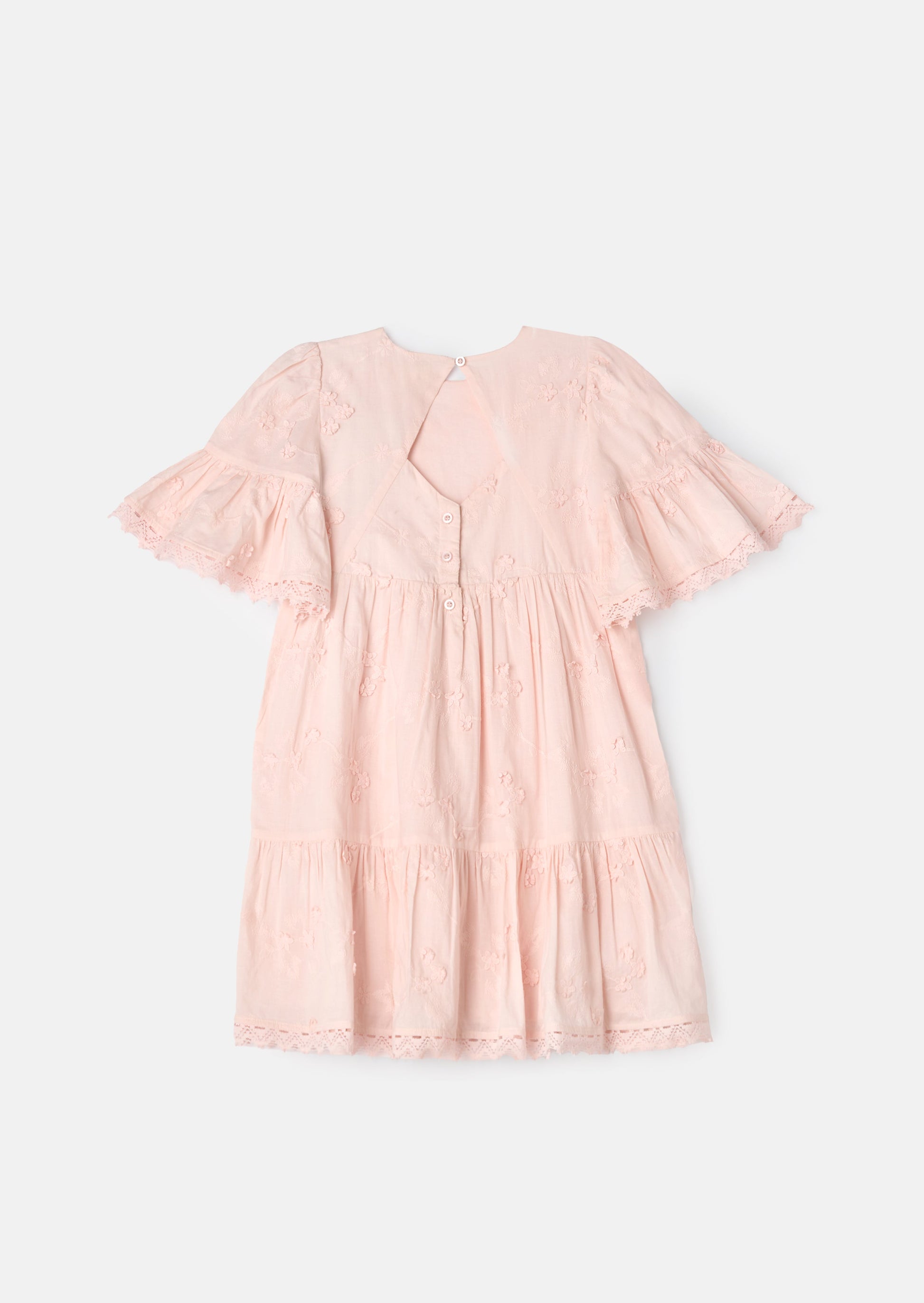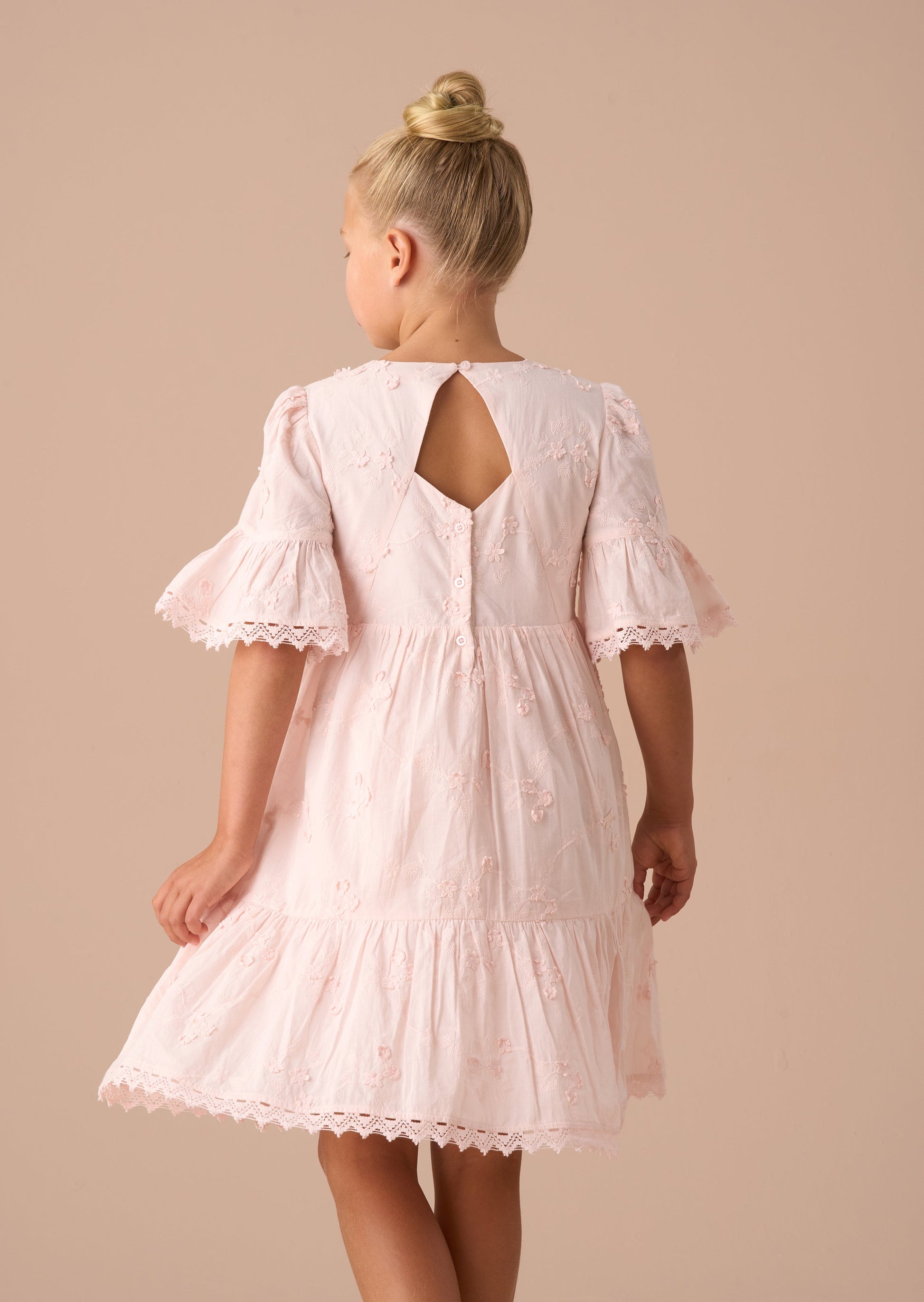 It's no secret, we love everything about this twirl-worthy floral dress! Crafted from beautiful embroidered pink fabric with cut-out back detail, the standout feature is the cascading tiered sleeve with pretty lace trim.