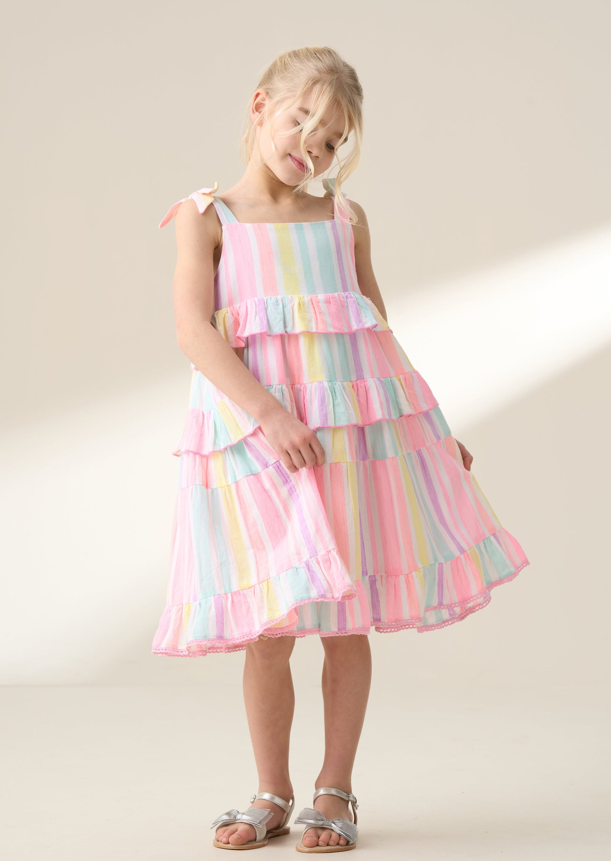 Bright as a button! Our gorgeous stripe midi dress with frill trim bodice and tie shoulder detail is slightly longer in length and perfect for the summer sun.