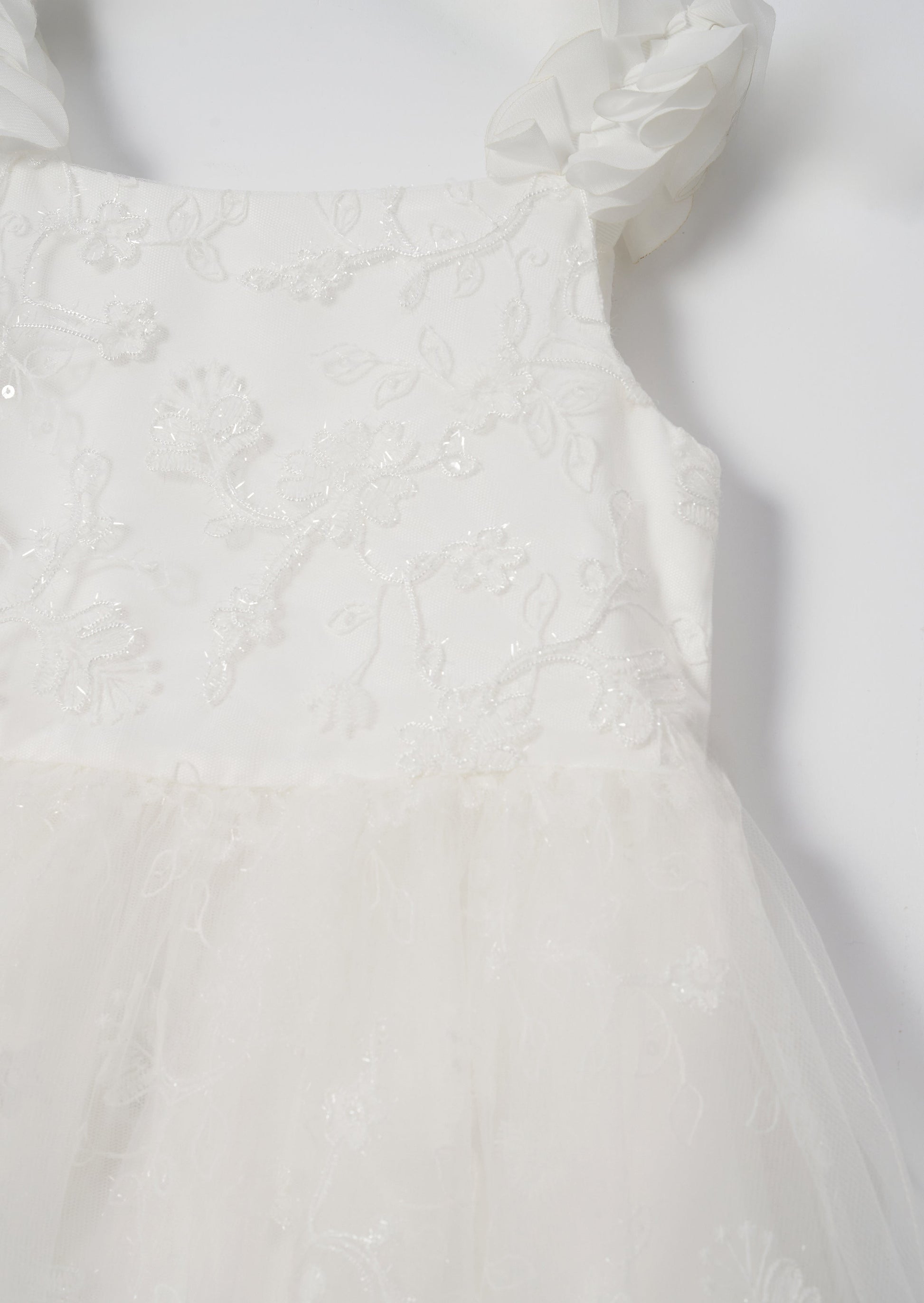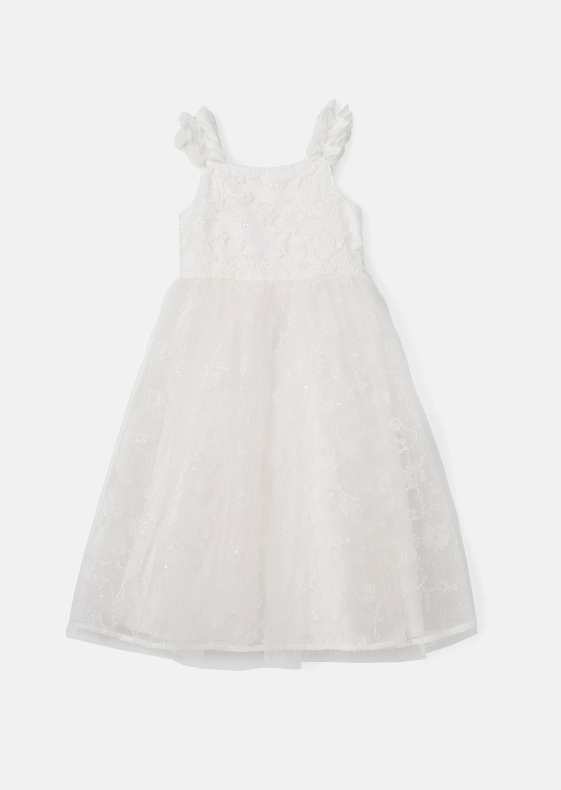 Our new Olivia dress is a stunning and ethereal choice for your flower girl. In classic white creating a sense of elegance the highlight of this dress is the sparkling embroidery on the mesh fabric. Delicate floral patterns adorned with sparkles and sequins are scattered across the dress creating a mesmerizing effect. Slightly longer in length and featuring a 3D petal effect sleeve to add a whimsical touch. An exquisite choice for a bridal party.