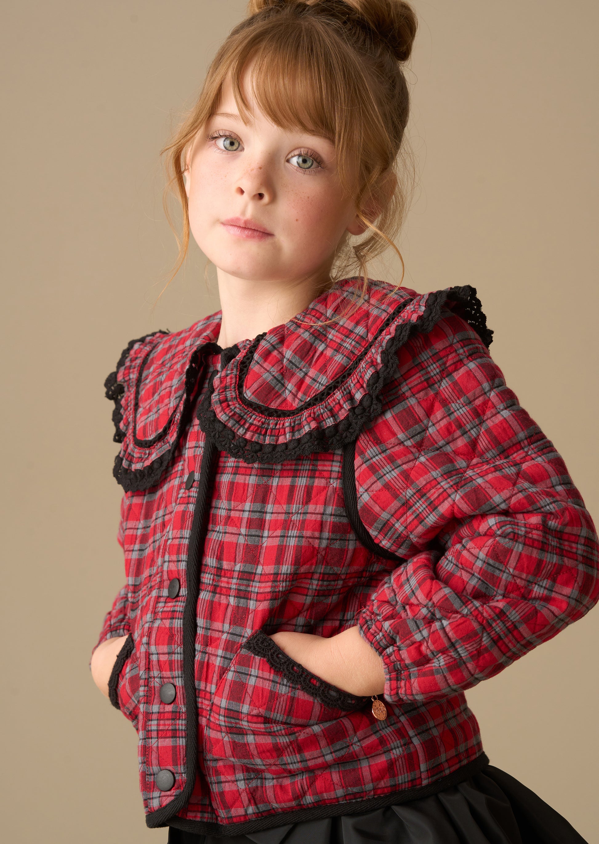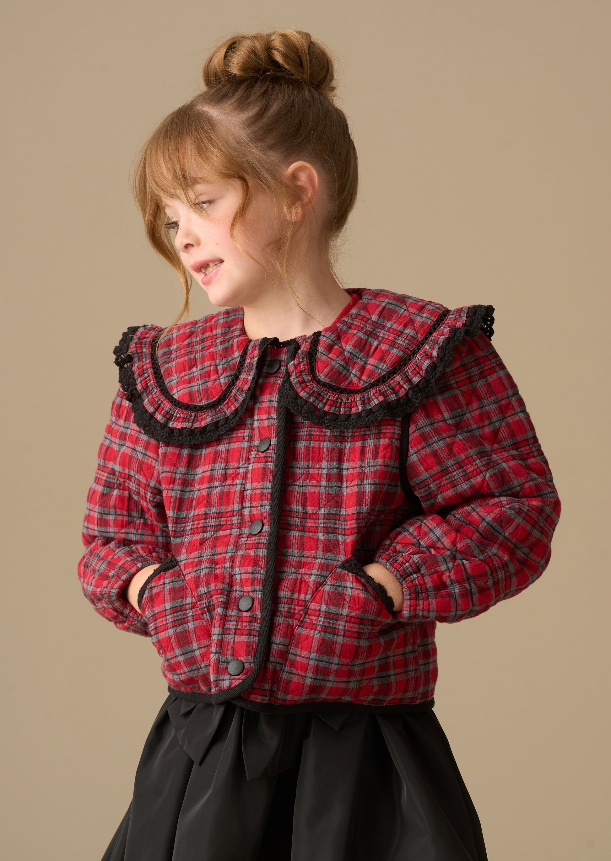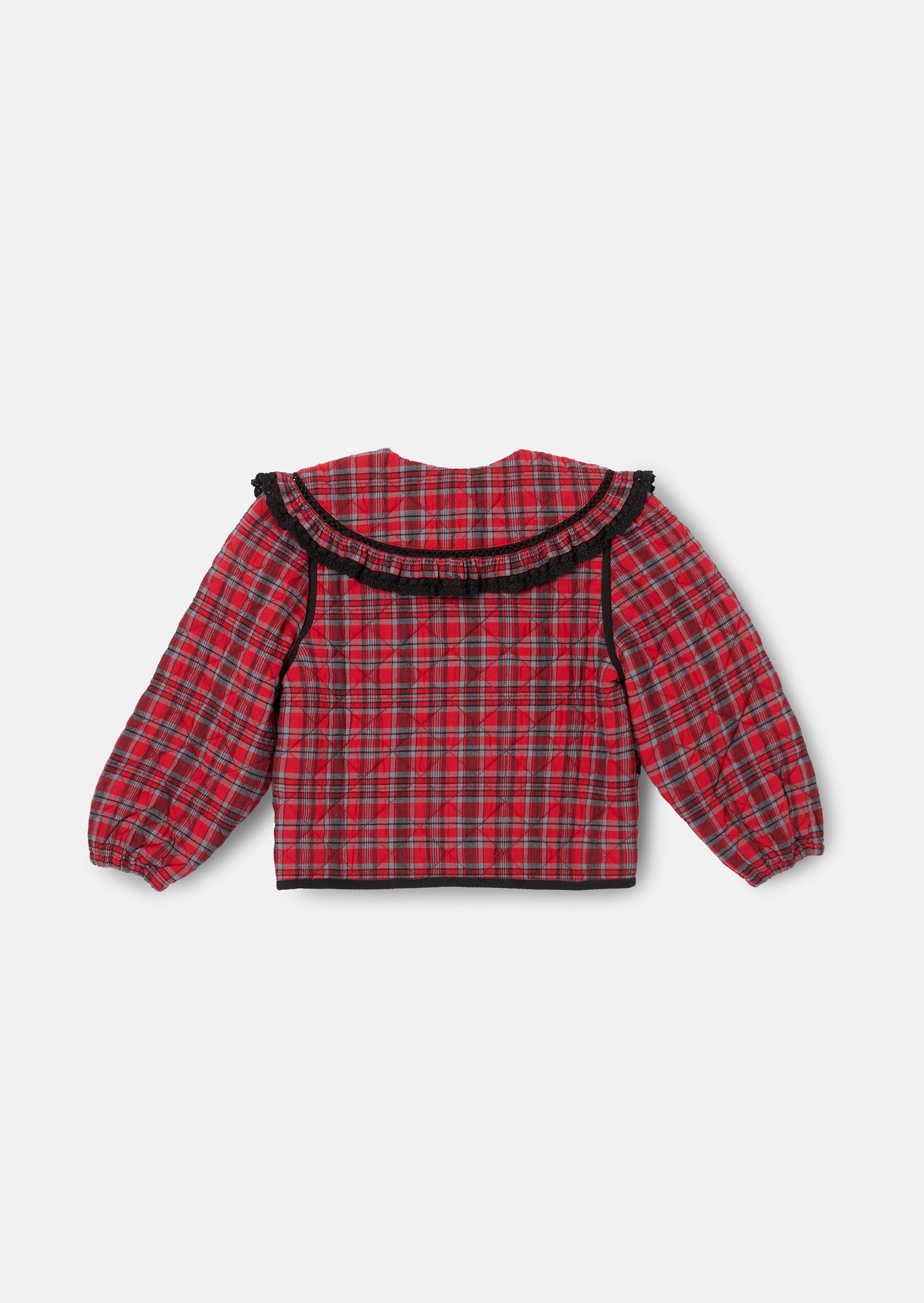 This stylish quilted jacket makes a bold statement with its vibrant red check and standout oversized collar trimmed in black frill. Featuring contrast piping and handy pockets, it's perfect for wrapping up warm while showing off serious style.