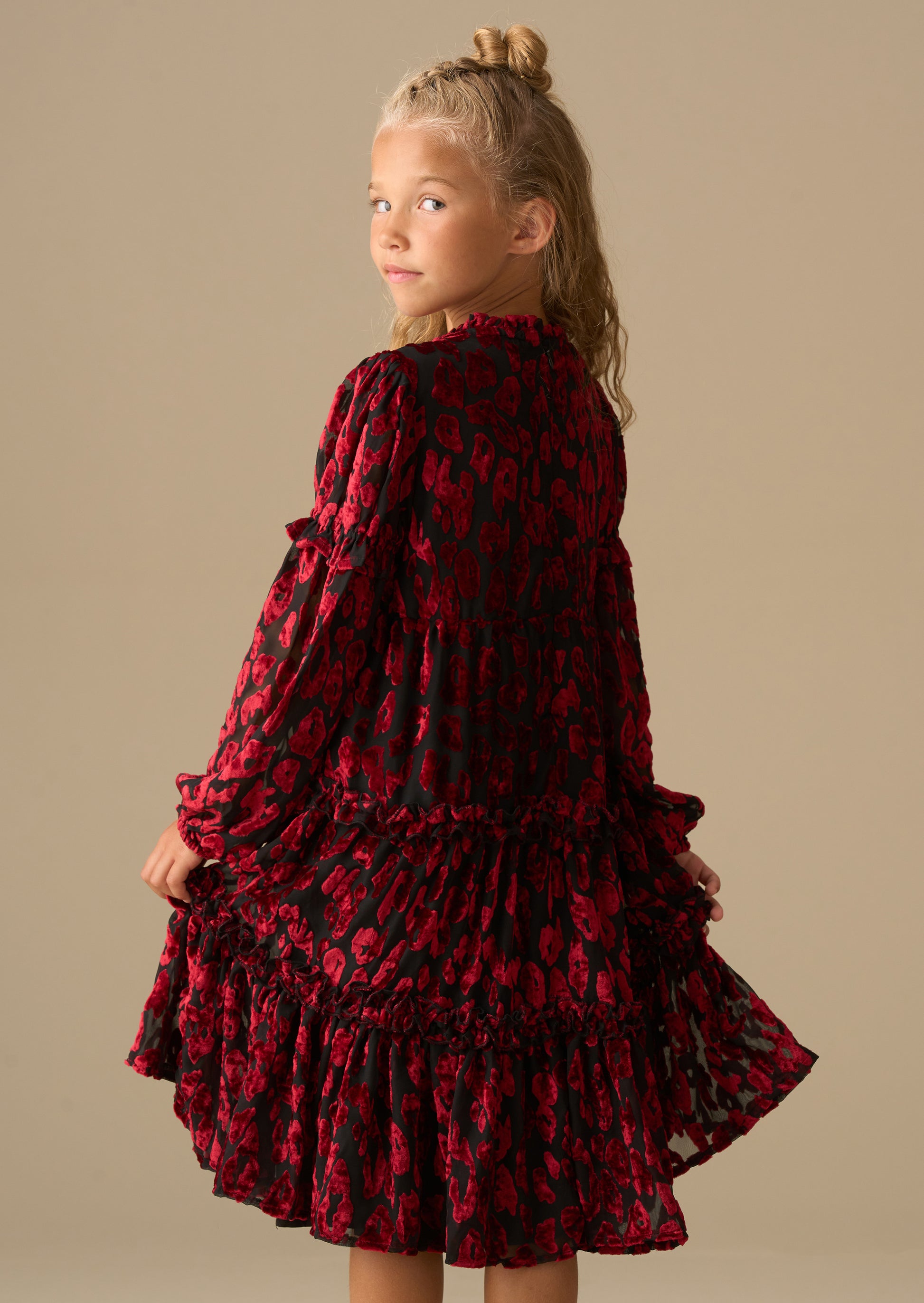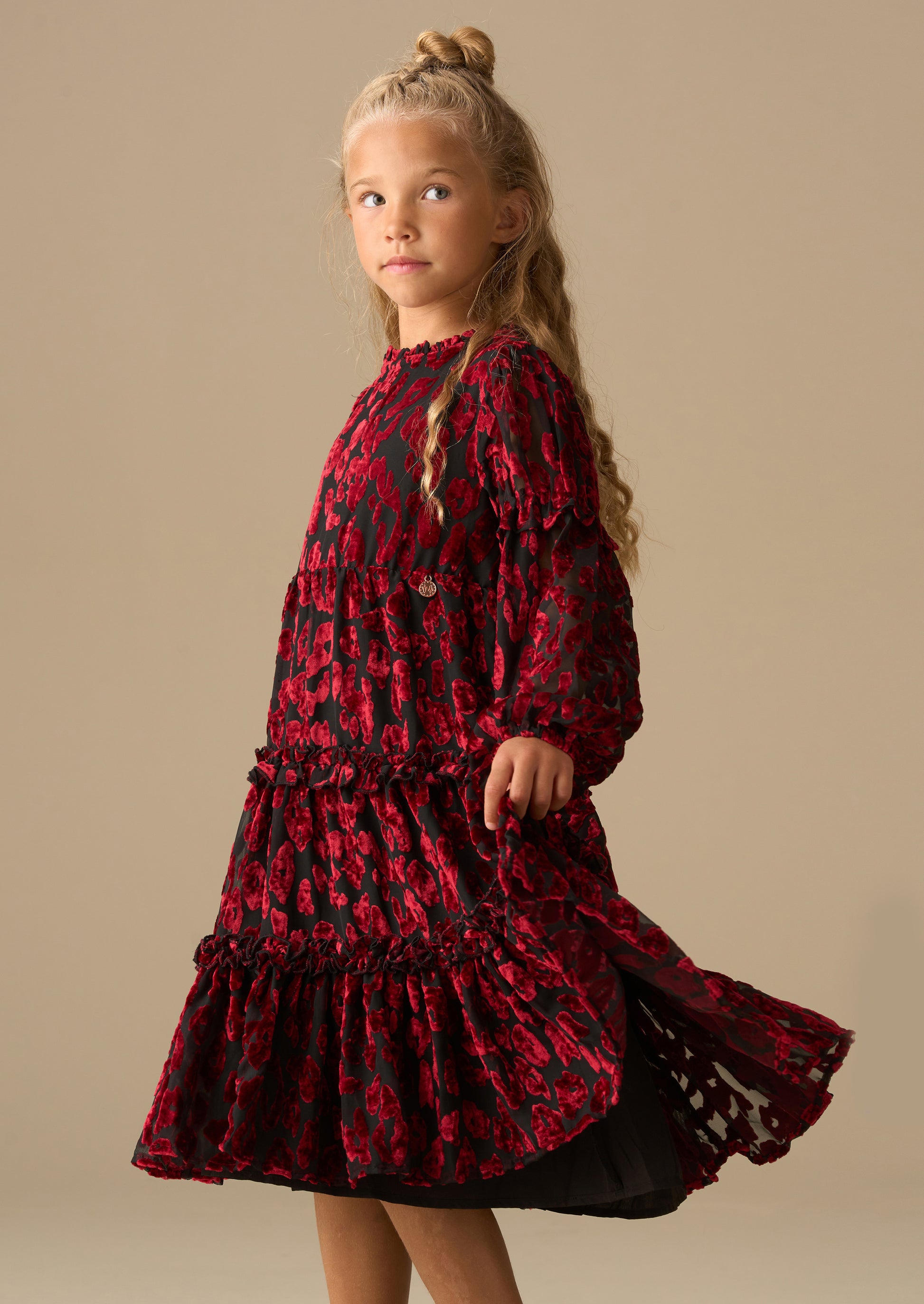 Step into the festive season in style with this luxurious red velvet tiered dress. Featuring a timeless ruby tone, long sleeves, and a voluminous skirt, it's a showstopping piece perfect for every celebration.